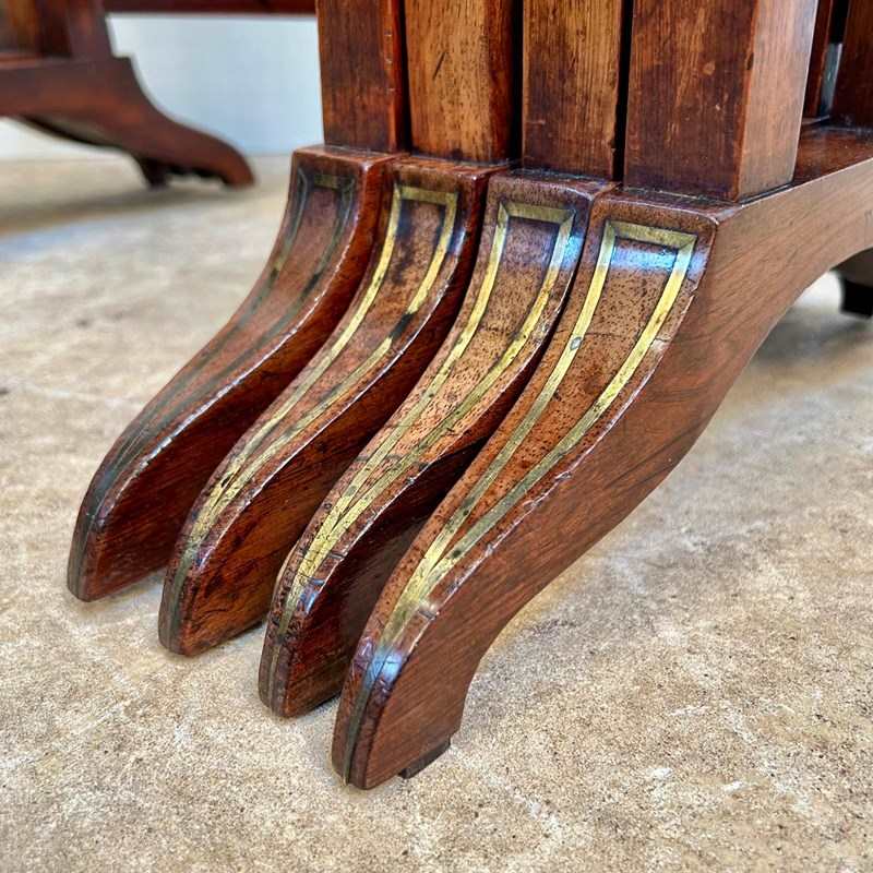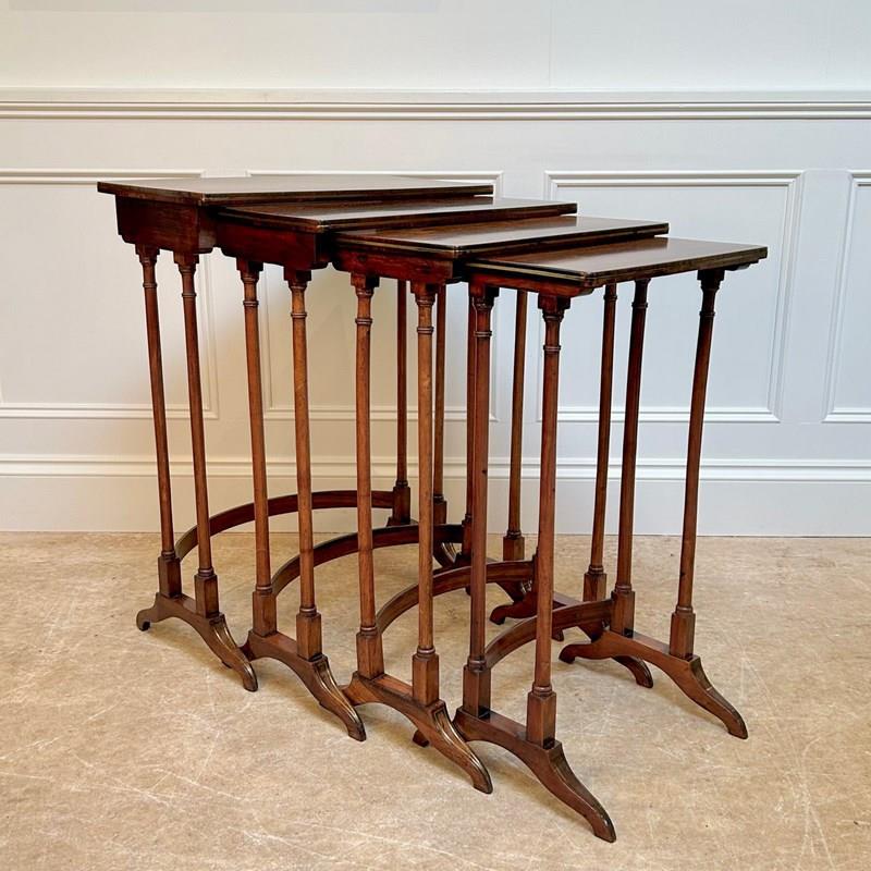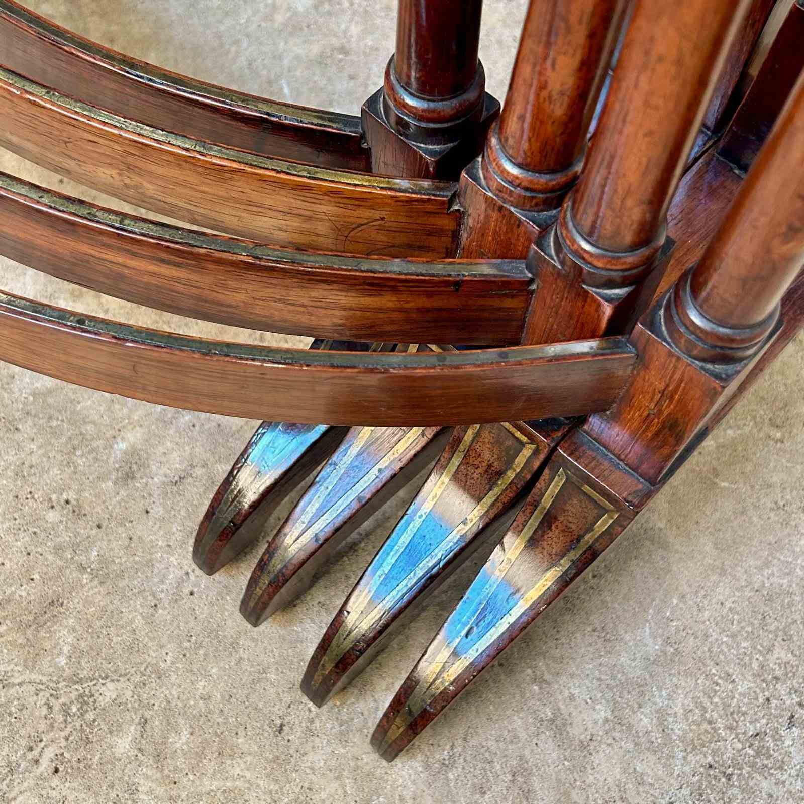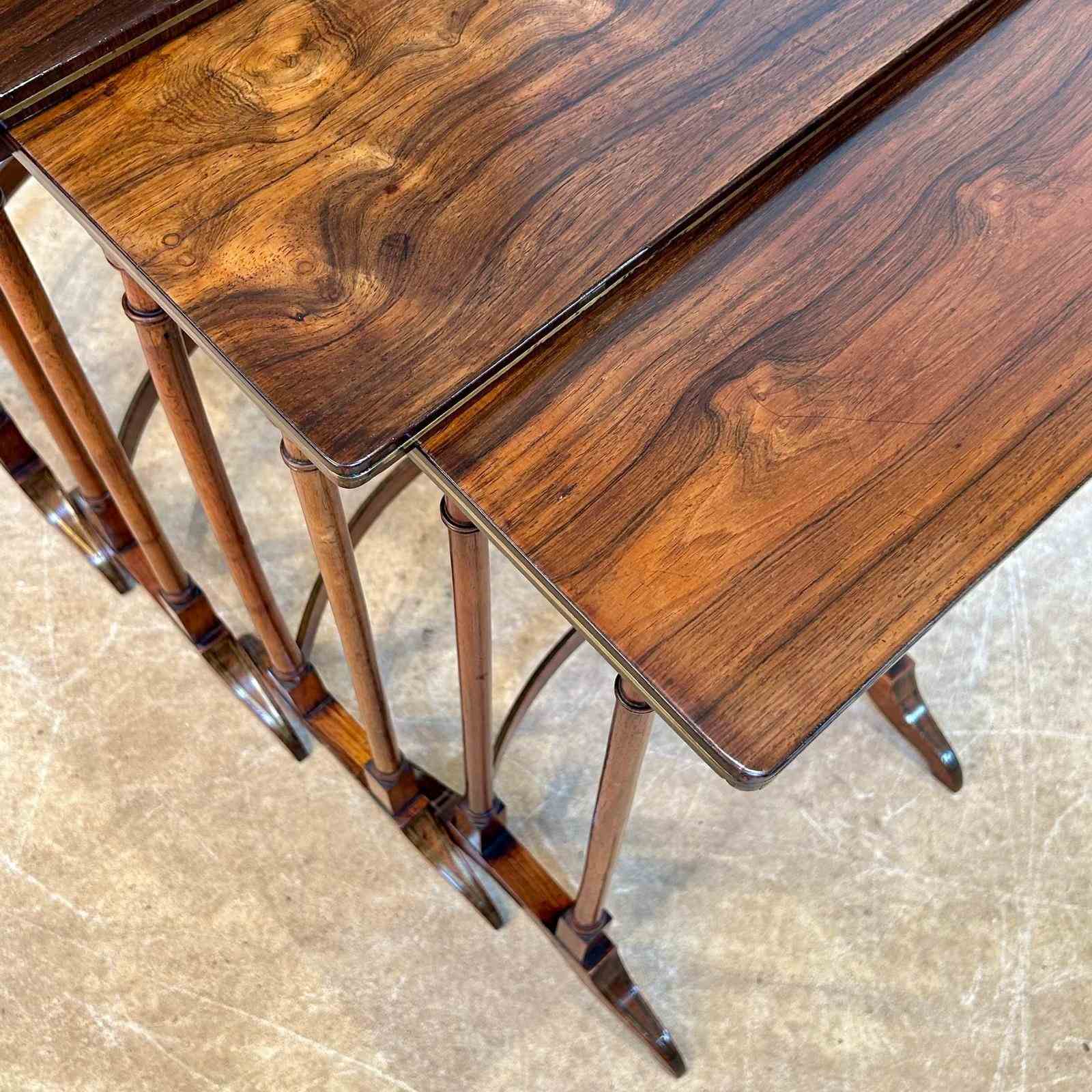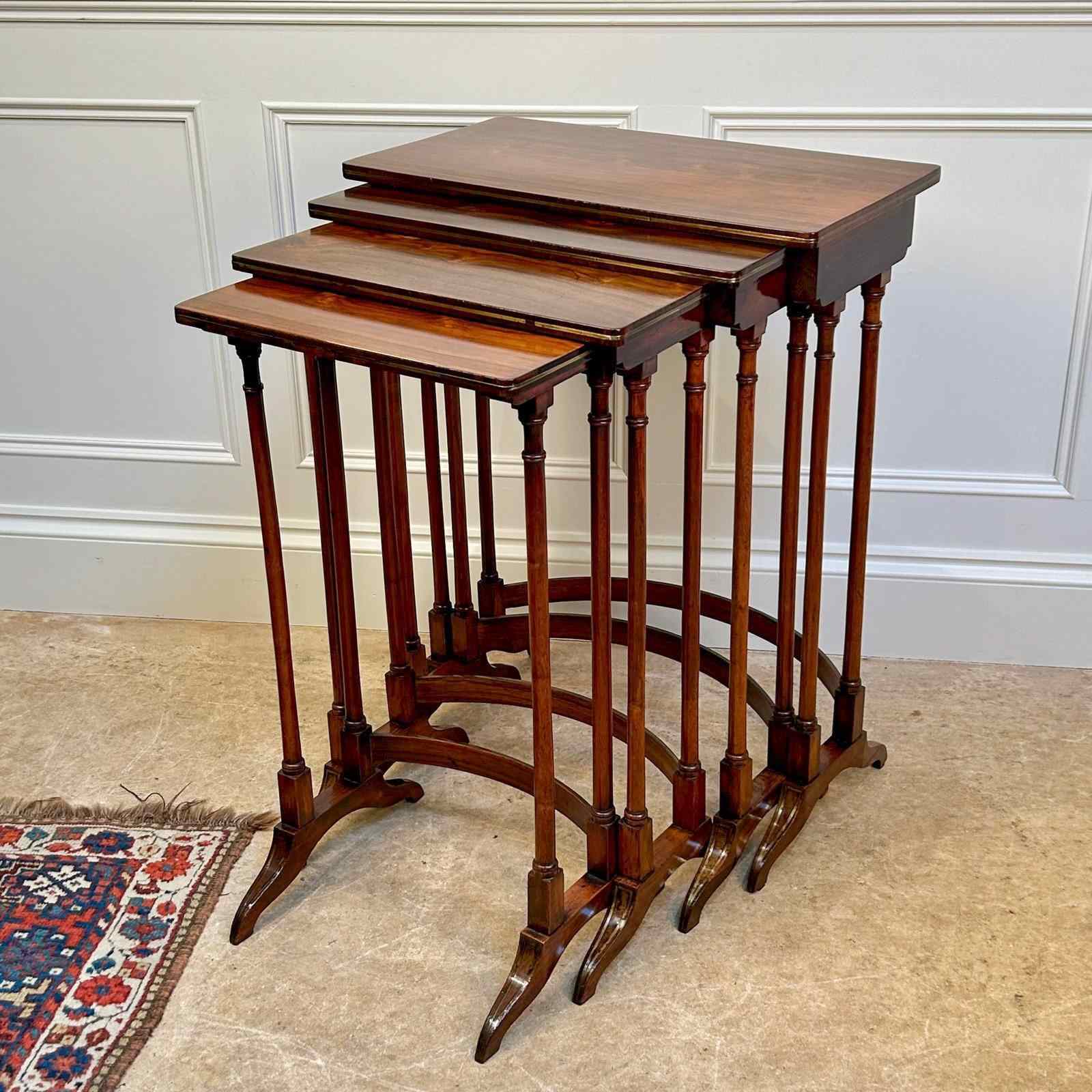 A set of fine Regency Quartetto tables in rosewood with brass inlaid detailing to the feet and curved stretcher rails. These lovely set of 4 graduated tables sit comfortably inside one another. Wonderful colour and condition throughout. English, Circa 1820.