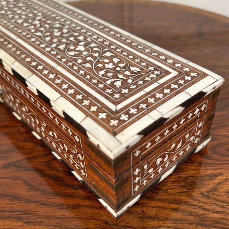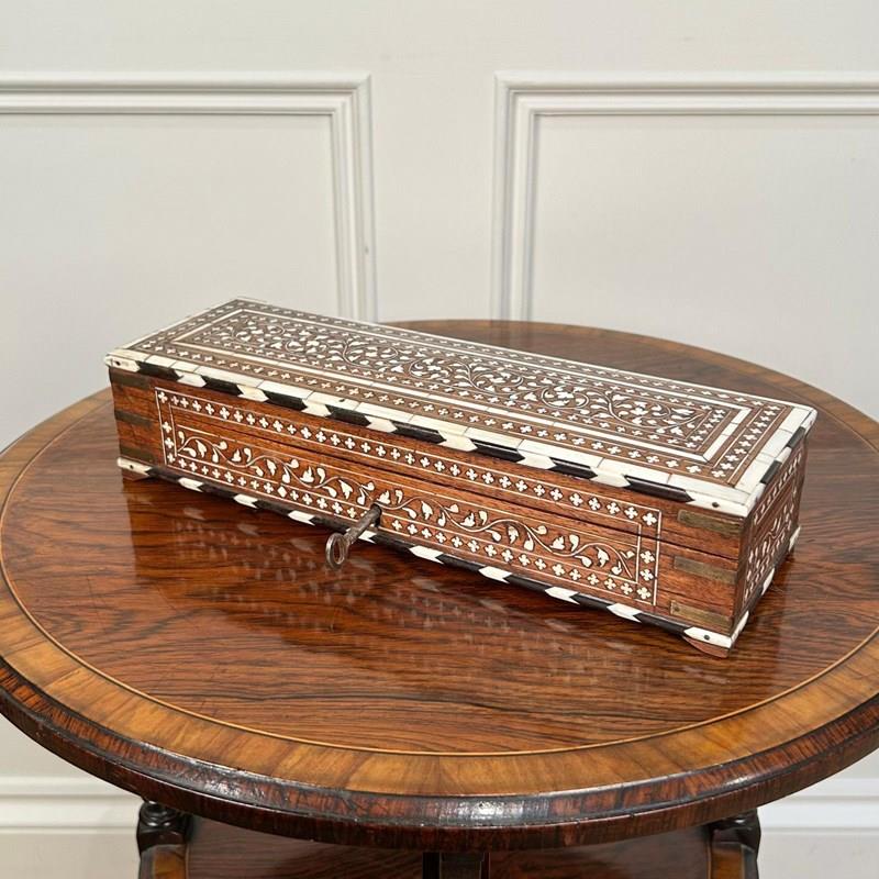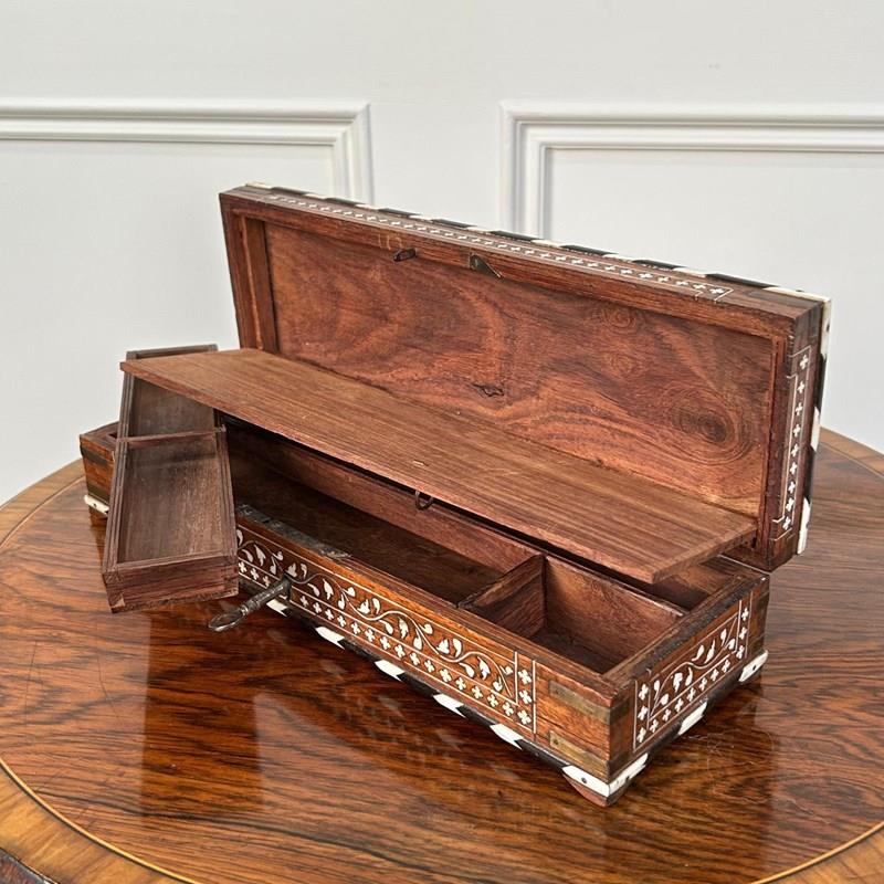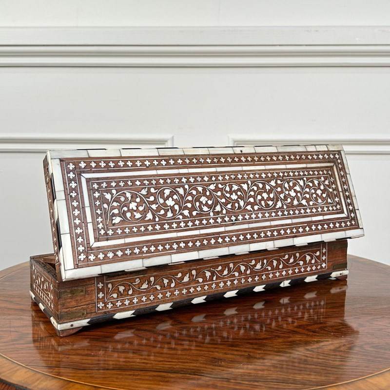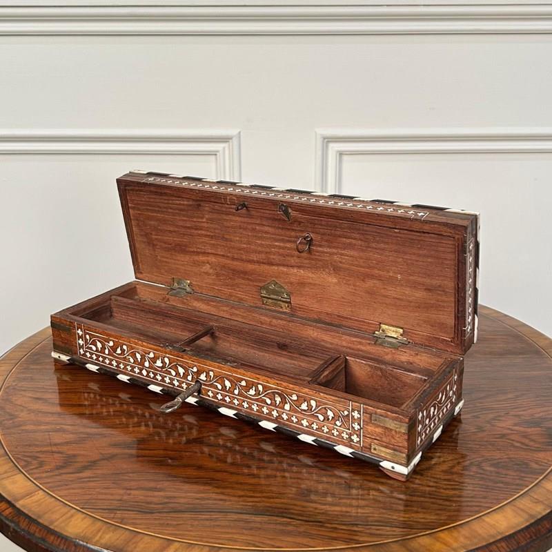 A beautiful Hoshiarpur artists / writing box in wonderful original condition throughout. Inlaid profusely in bone and ebony with exceptionally good colour. The box opens to reveal a compartmented interior with original lock and key. Indian, Circa 1900.