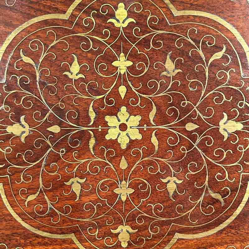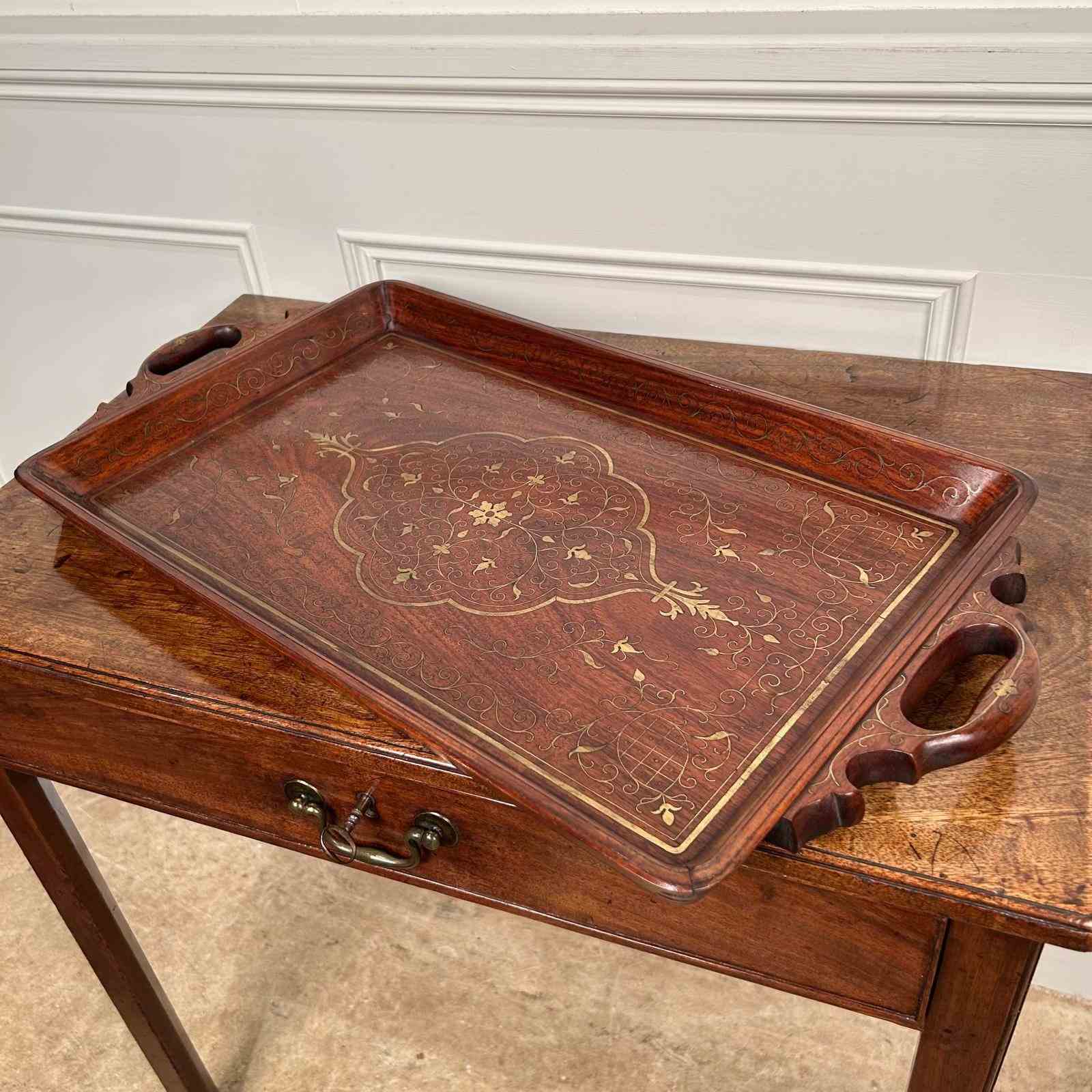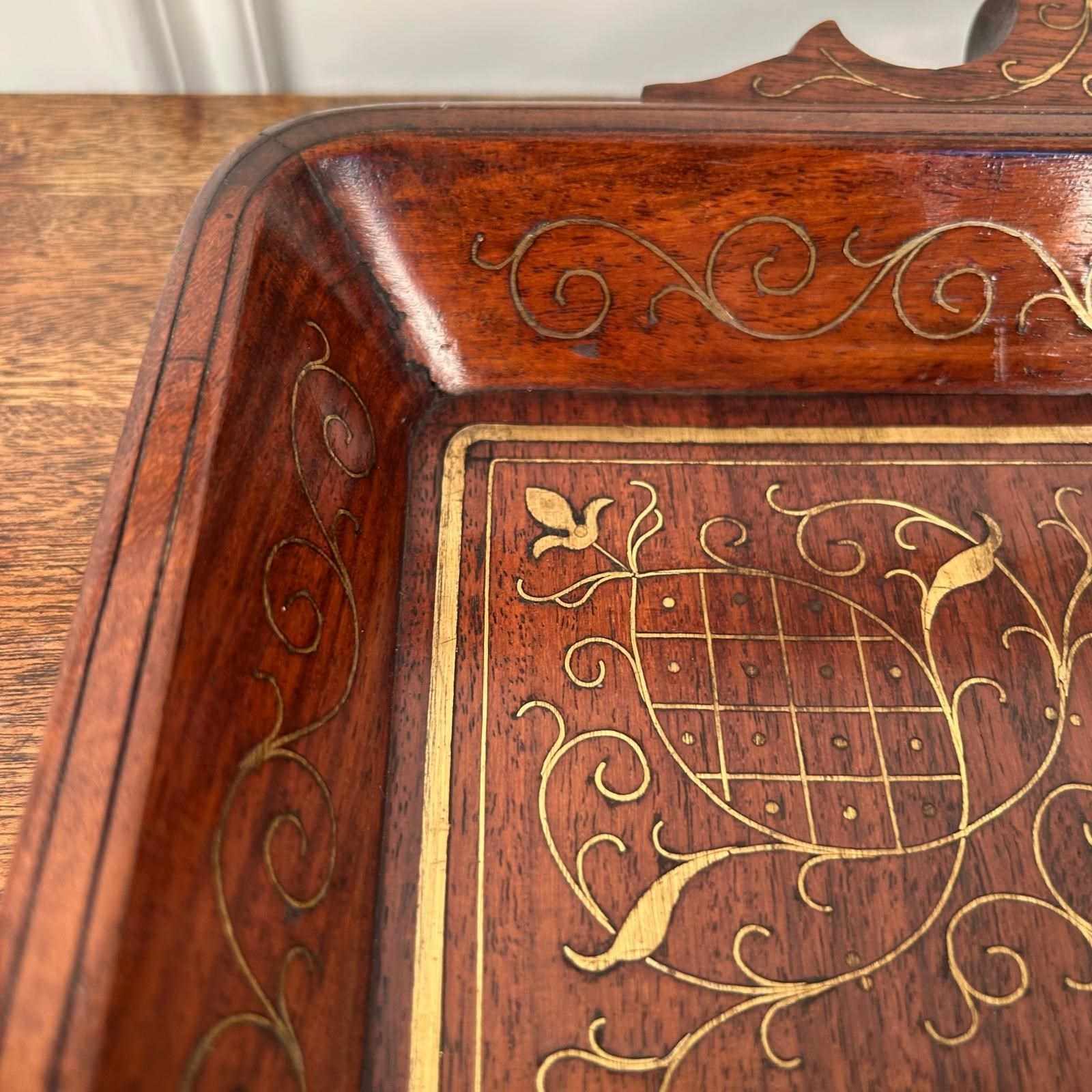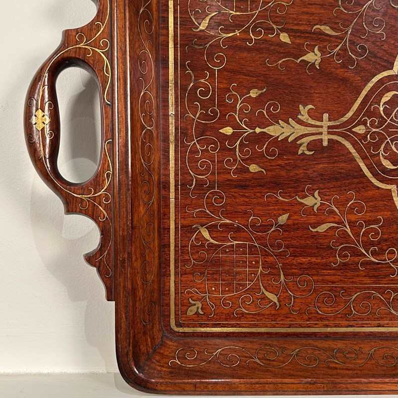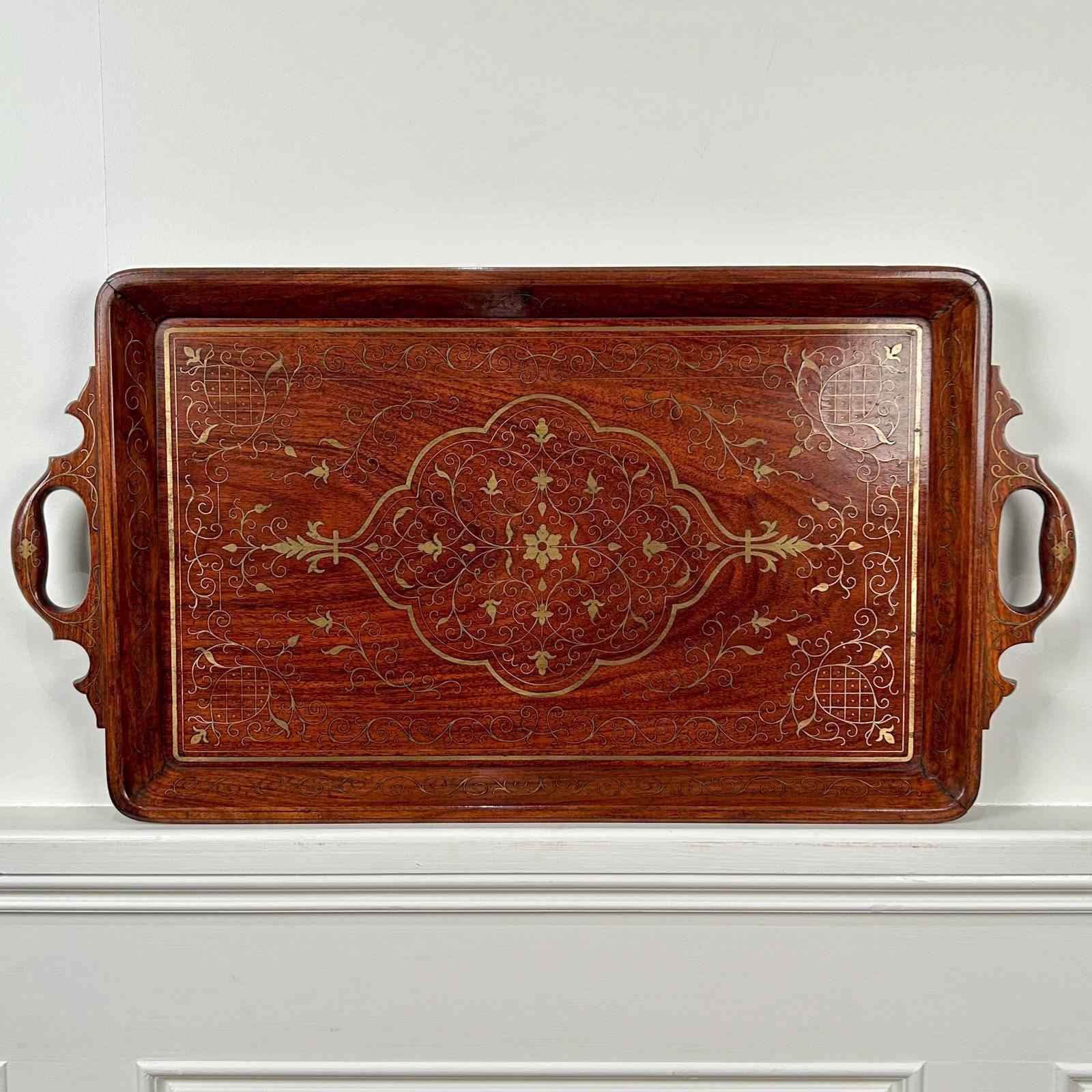 A beautiful Hoshiarpur tray in super condition throughout. Having intricate brass inlaid decoration throughout with carved handles. Retaining its original finish with a rich patina and colour. Indian, Circa 1900.