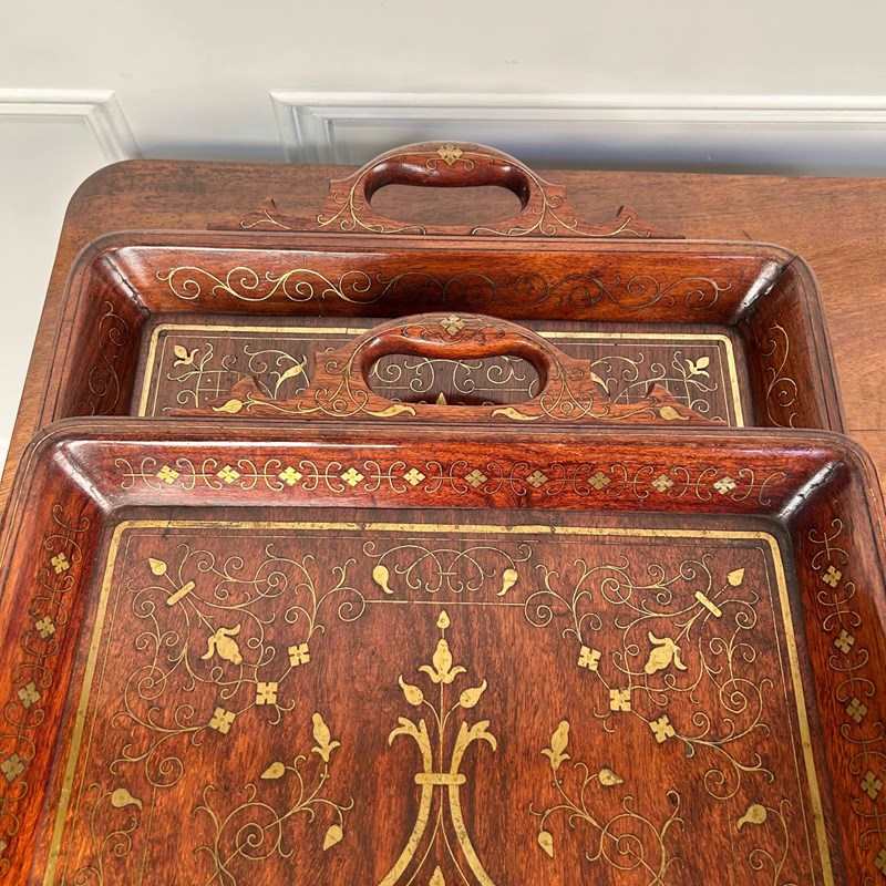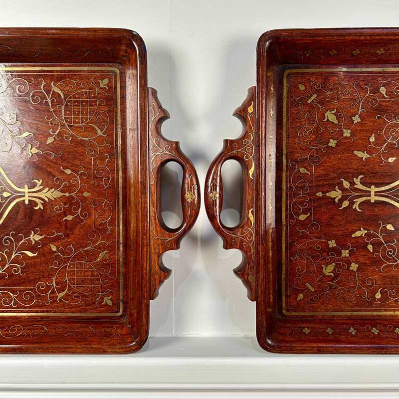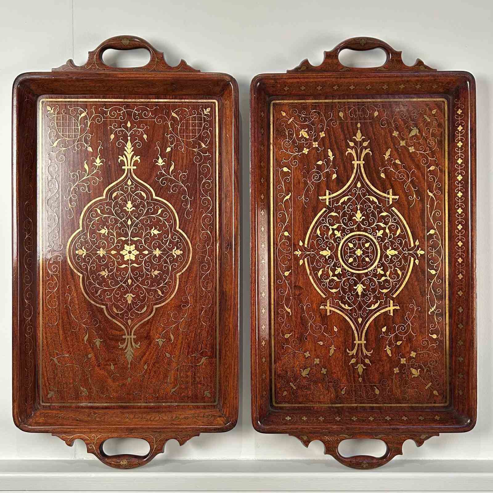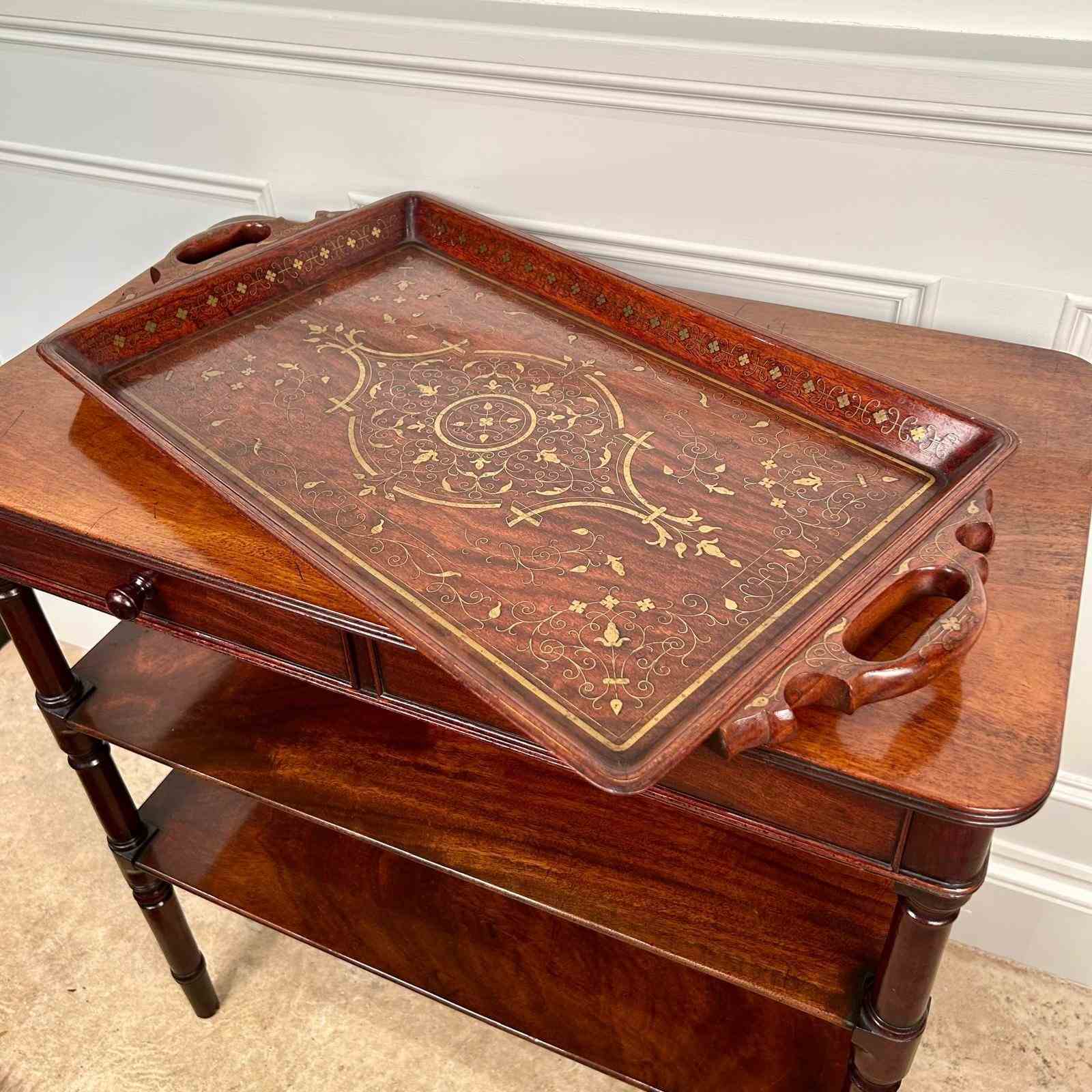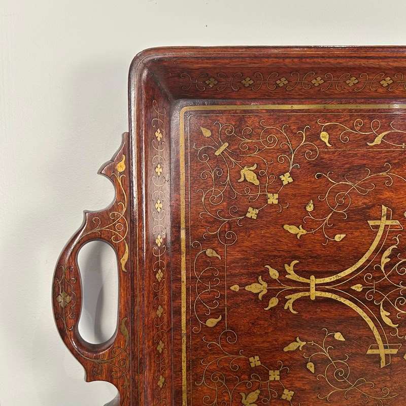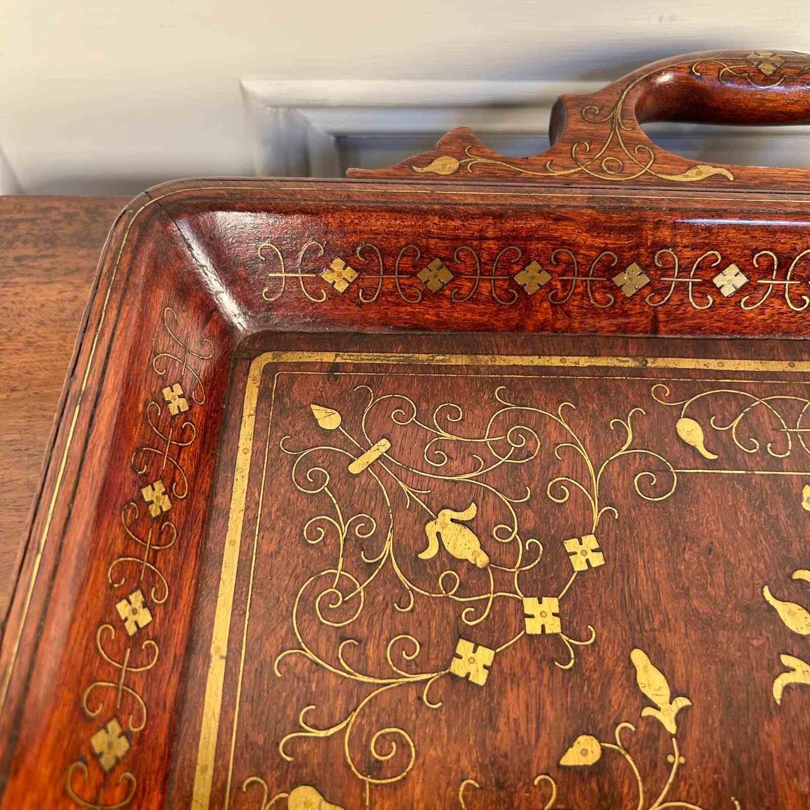 A beautiful Hoshiarpur tray in super condition throughout. Having intricate brass inlaid decoration throughout with carved handles. Retaining its original finish with a rich patina and colour. Indian, Circa 1900.