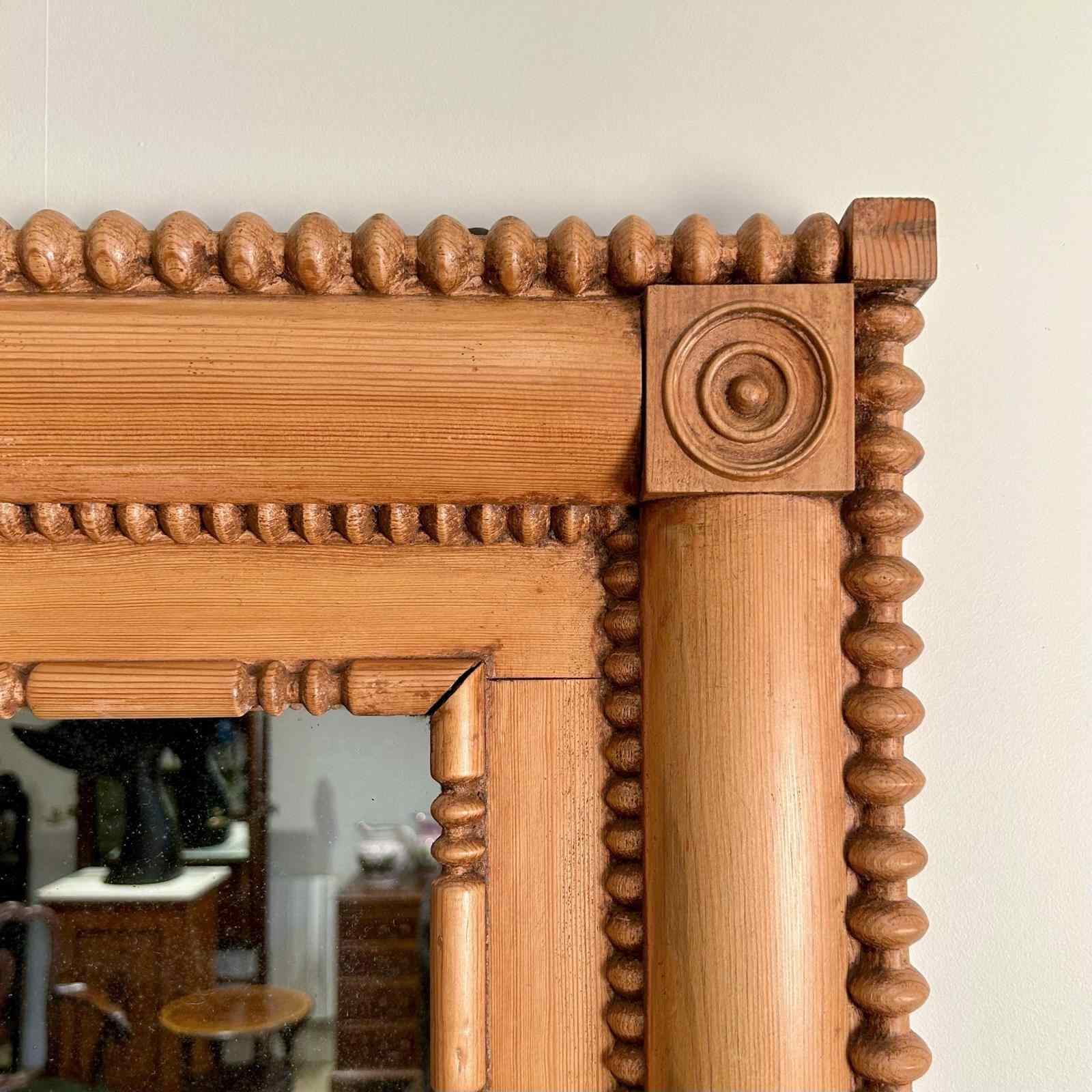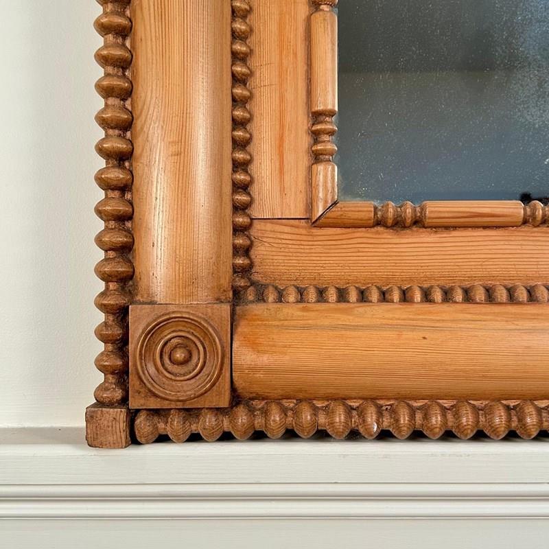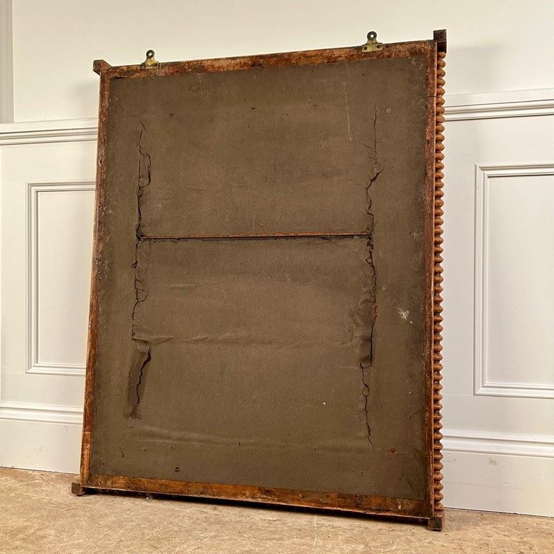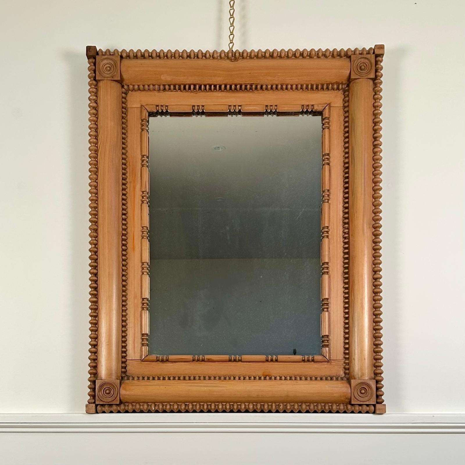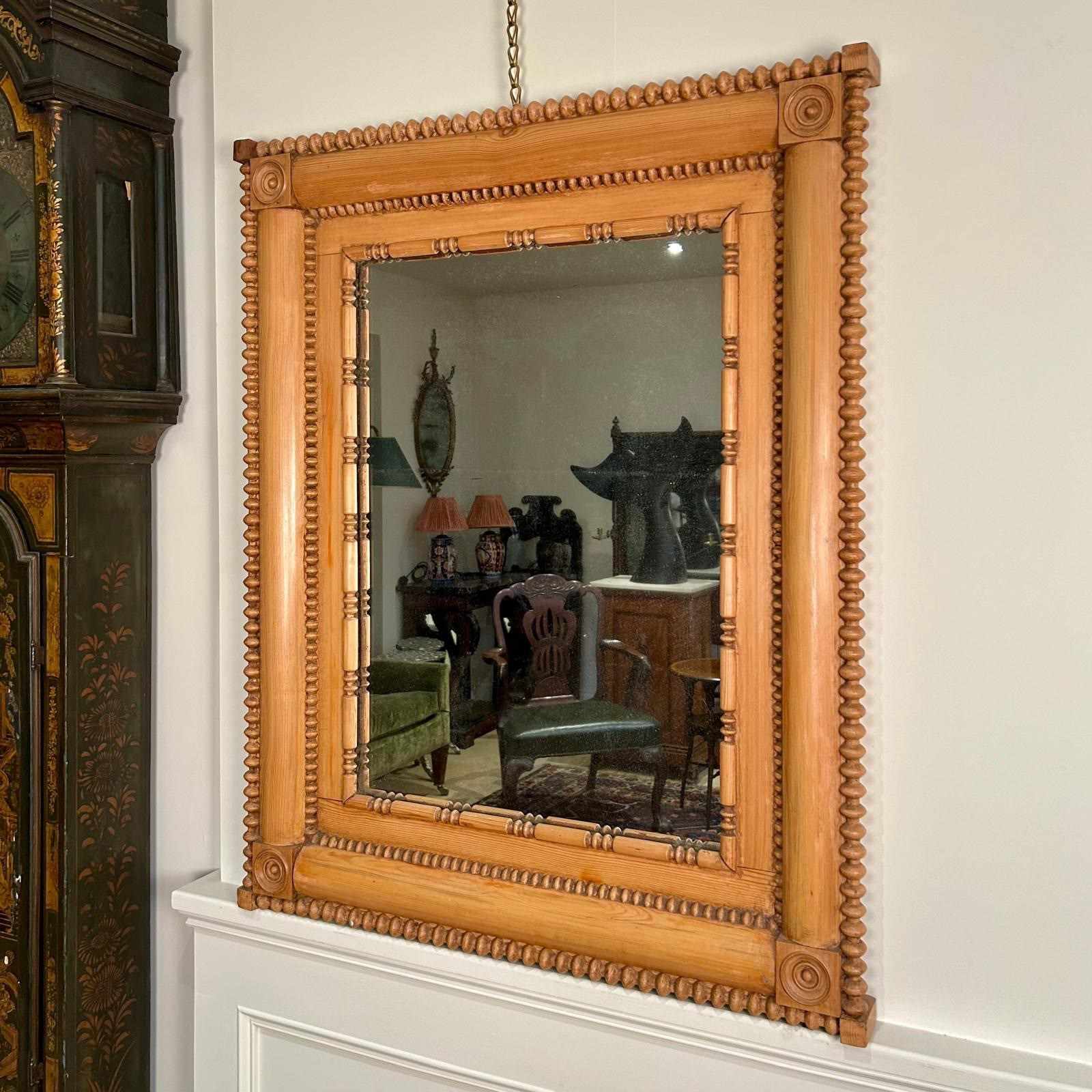 A bold mid 19th century pine wall mirror. Having a cushioned and carved surround, retaining the original mirror plate which shows age but gives a good clear reflection. Super condition and a lovely mellow colour. Please note this mirror can be hung both portrait or landscape. English, Circa 1850.