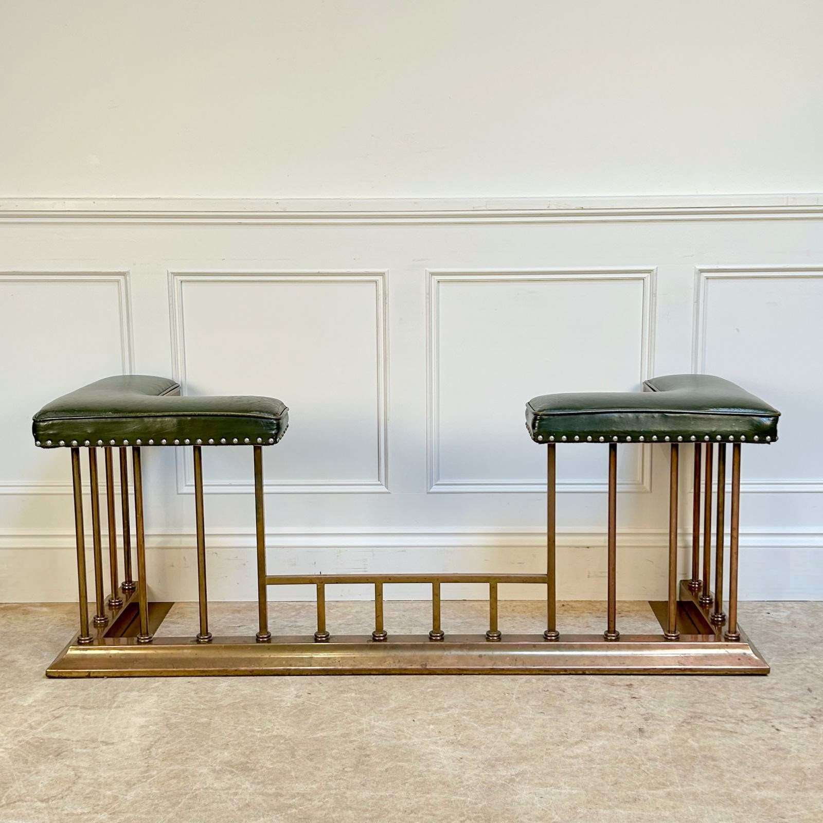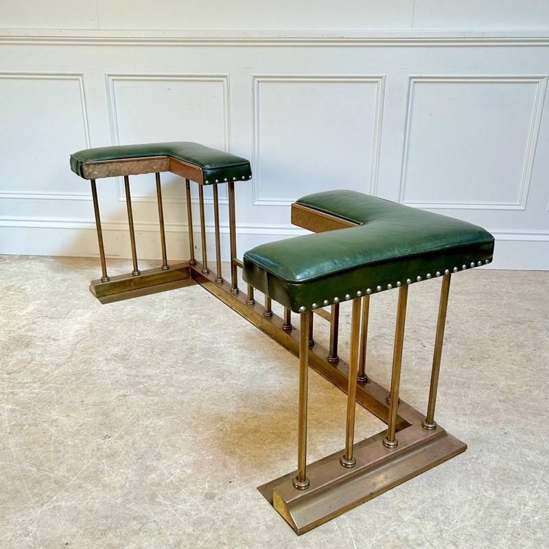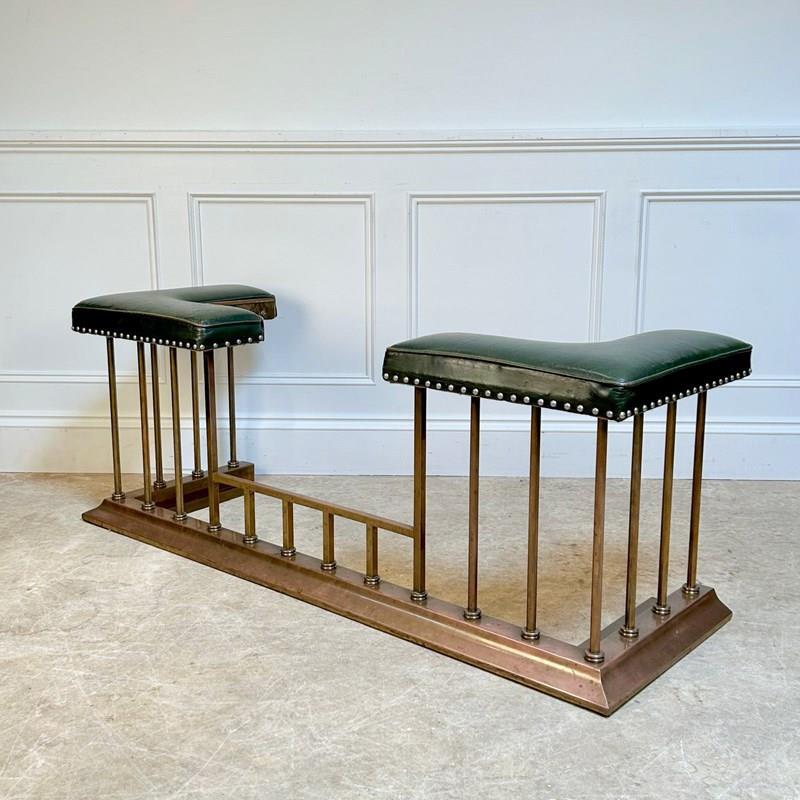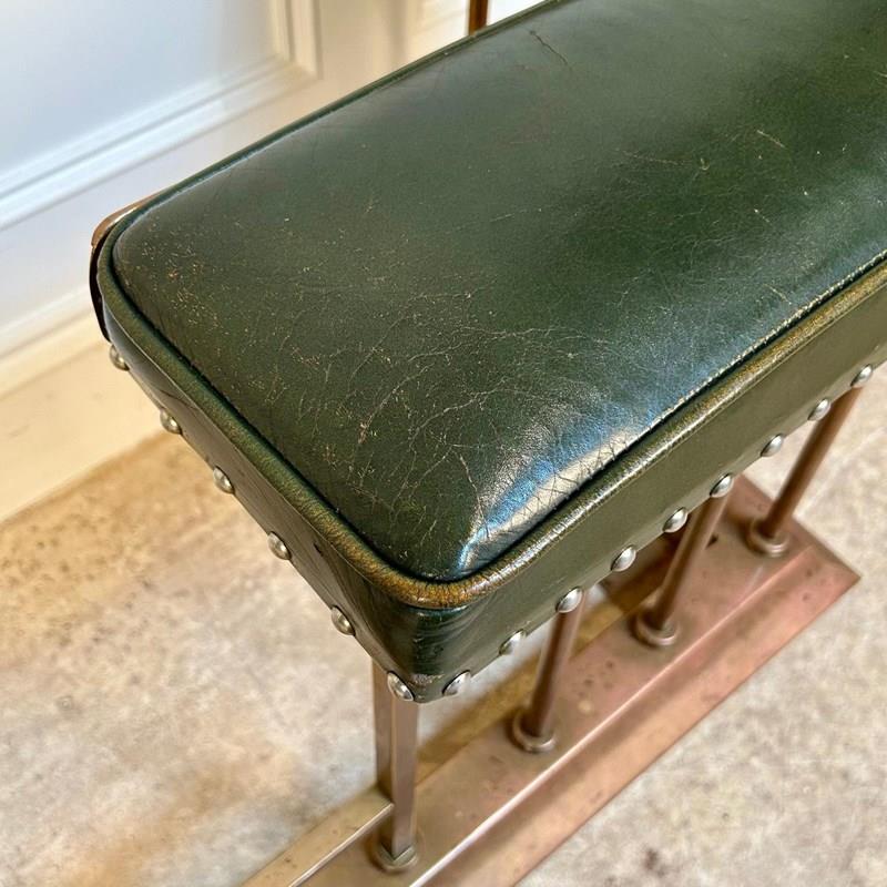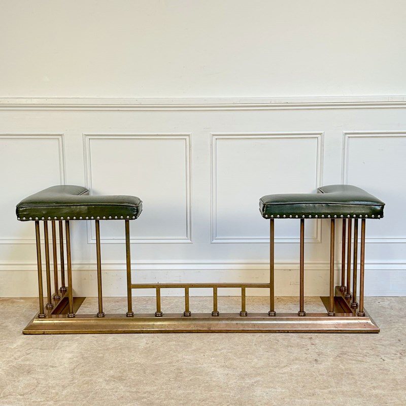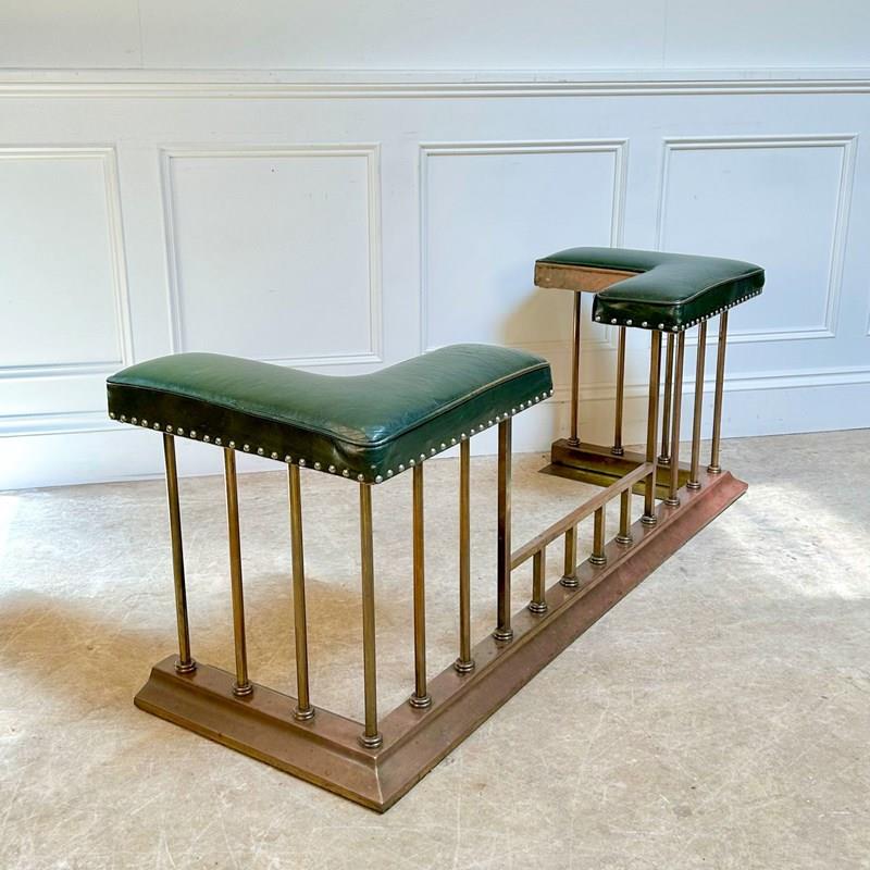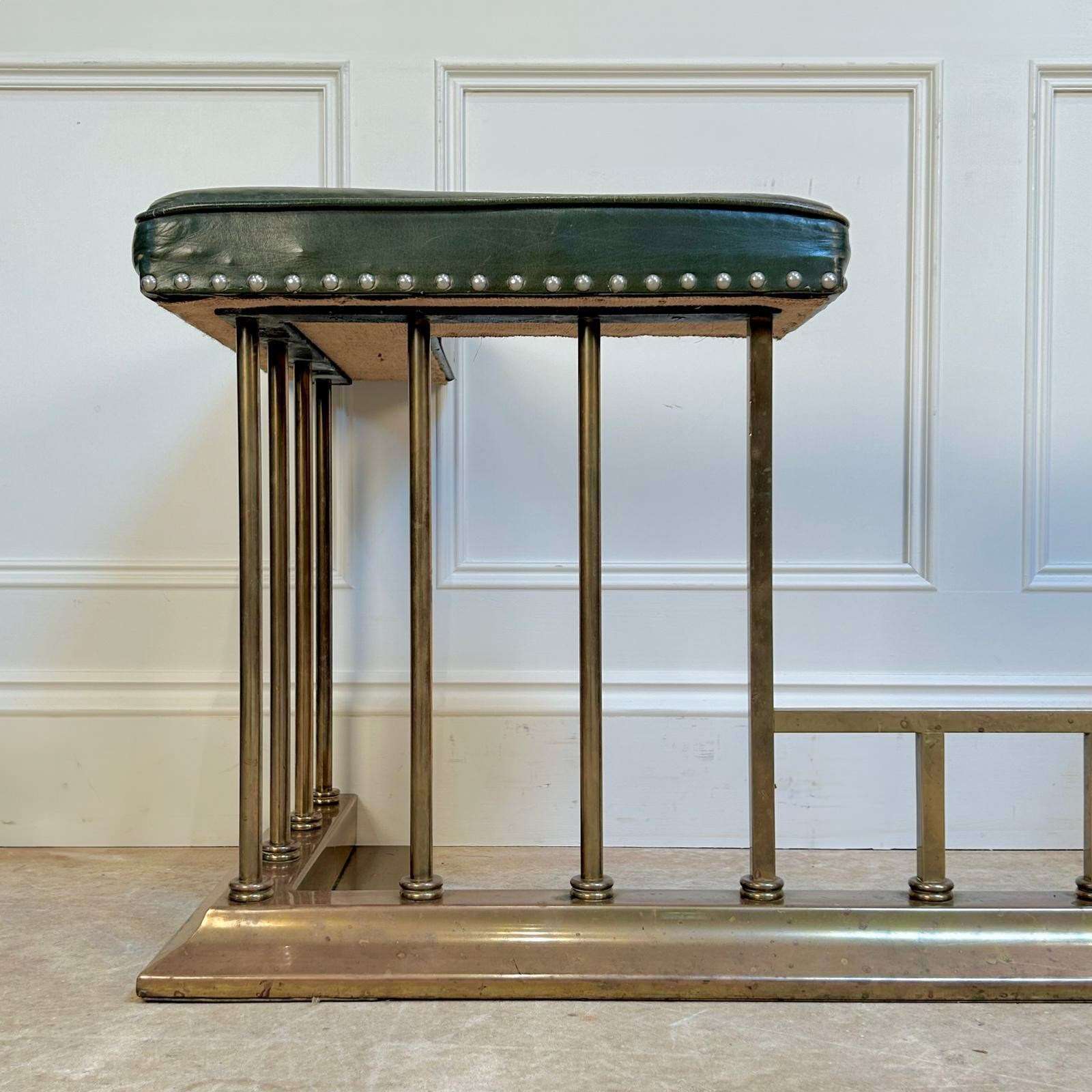 An early 20th century brass and leather club fender. Having a stepped plinth with brass columns which is beautifully patinated. Upholstered in the original green leather which retains the orignal brass guards to the inside of the seat. Firm standing and in super condition throughout. English, 1920's.