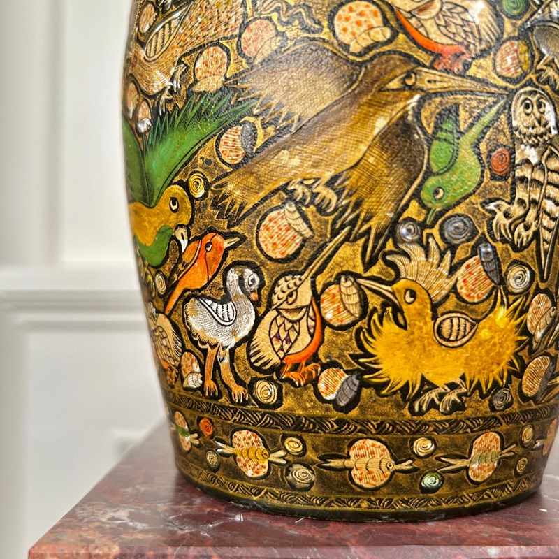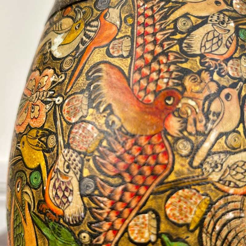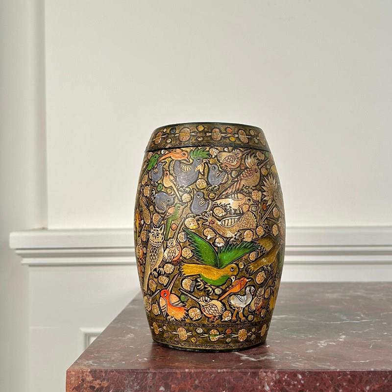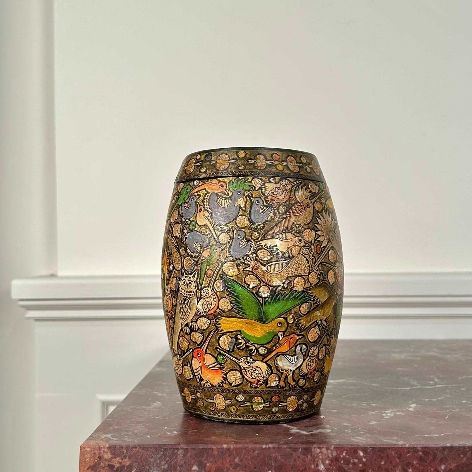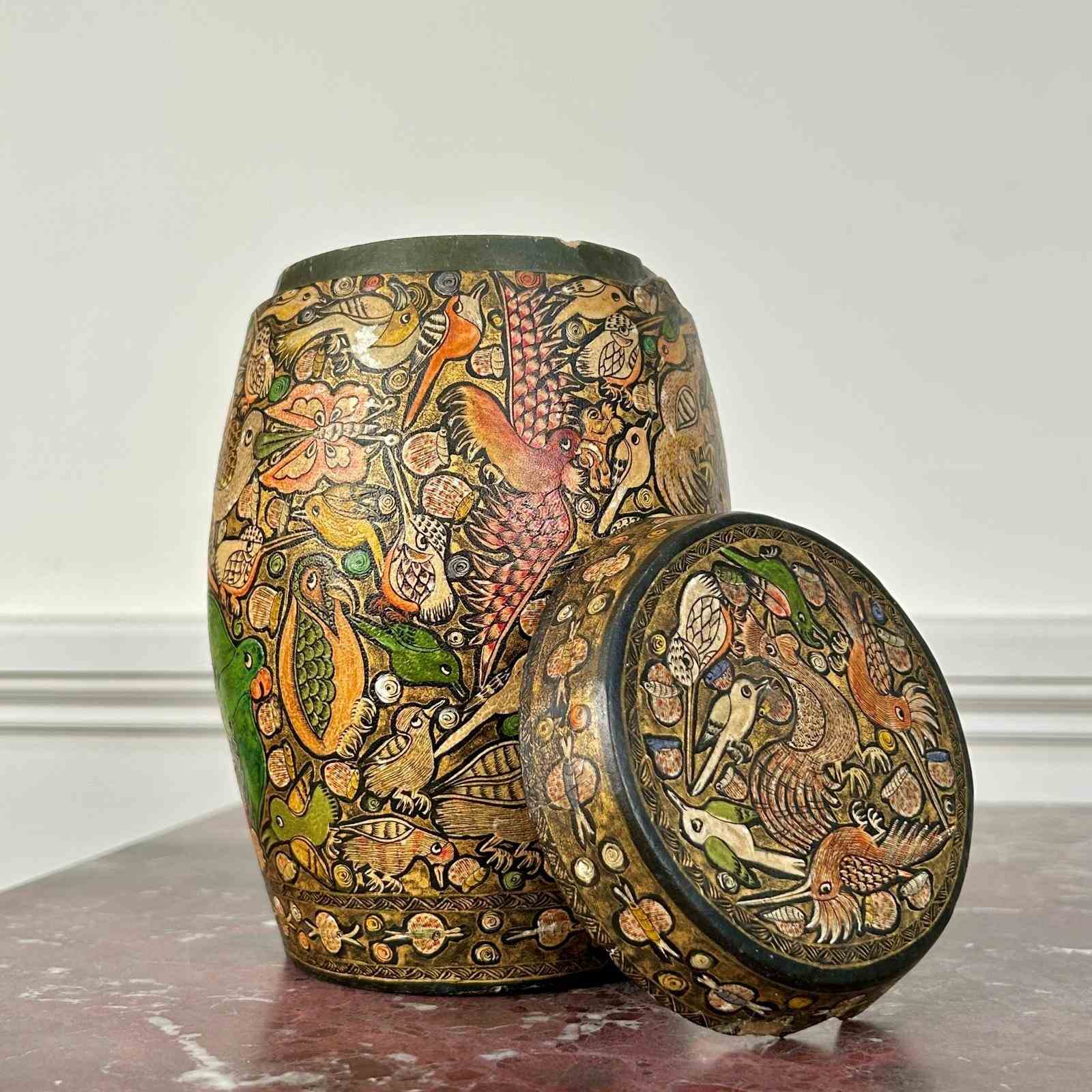 An early 20th century lidded pot which is profusely decorated with hand painted exotic birds. Retaining the original finish with a striking colourway. Indian, Circa 1910.