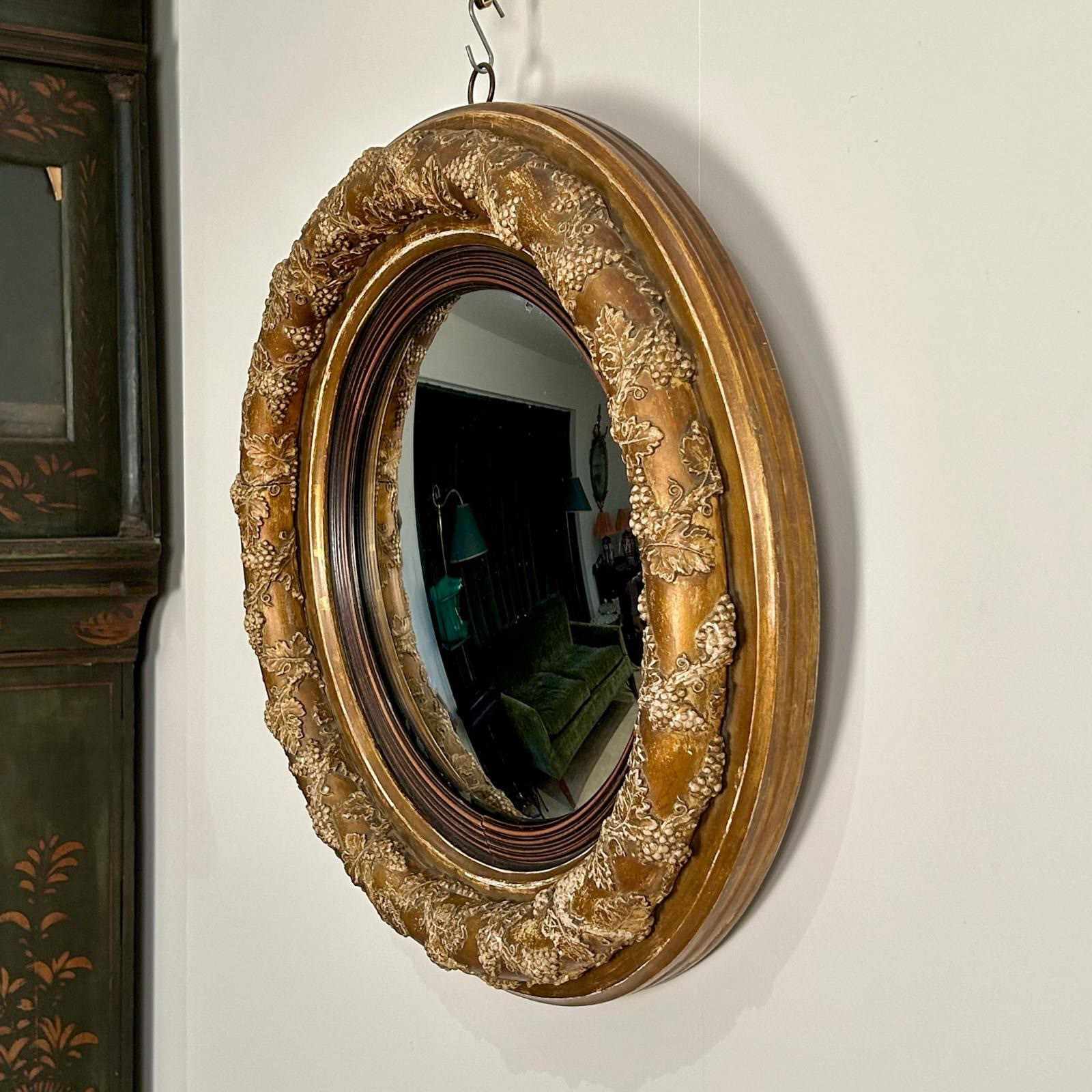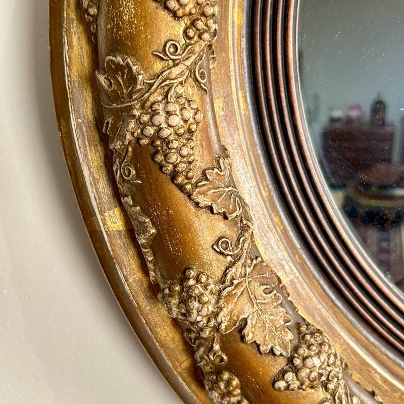 An early 19th century giltwood convex mirror. Having a mahogany reeded slip with a moulded giltwood surround with grape vine decoration. Retaining the original gilding, backboards and magical convex mirror plate, lovely condition throughout. English, Circa 1825.