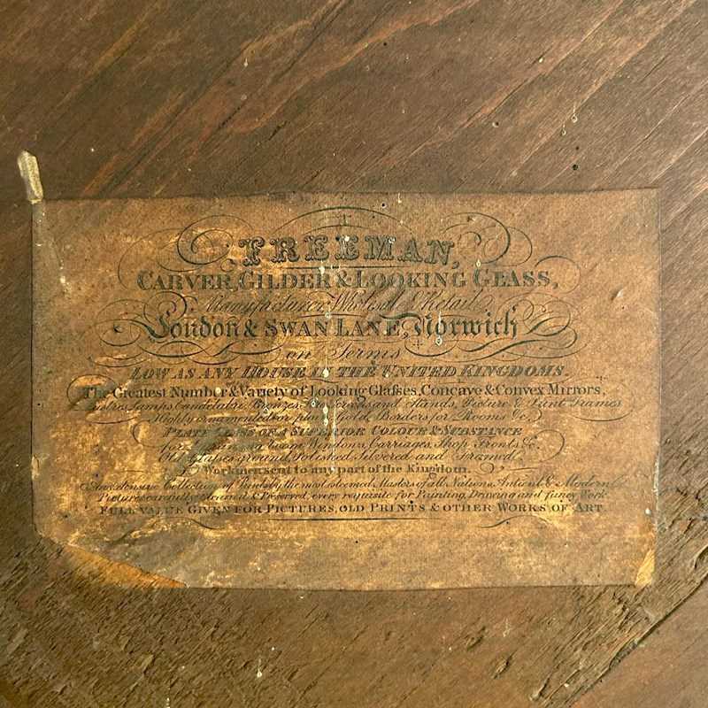 The mirror retains the original makers label for William & Jerimiah Freeman of Norwich, 1792 - 1859. Specialising in carving, gilding and manufacturers of looking glass. They supplied important country houses to include Blicking Hall & Felbrigg Hall in Norfolk. They were also exhibitors at the 1851 Great Exhibition. The full bio of the company can be found on the BIMFO website -https://bifmo.furniturehistorysociety.org/entry/freeman-jeremiah-1792-1850