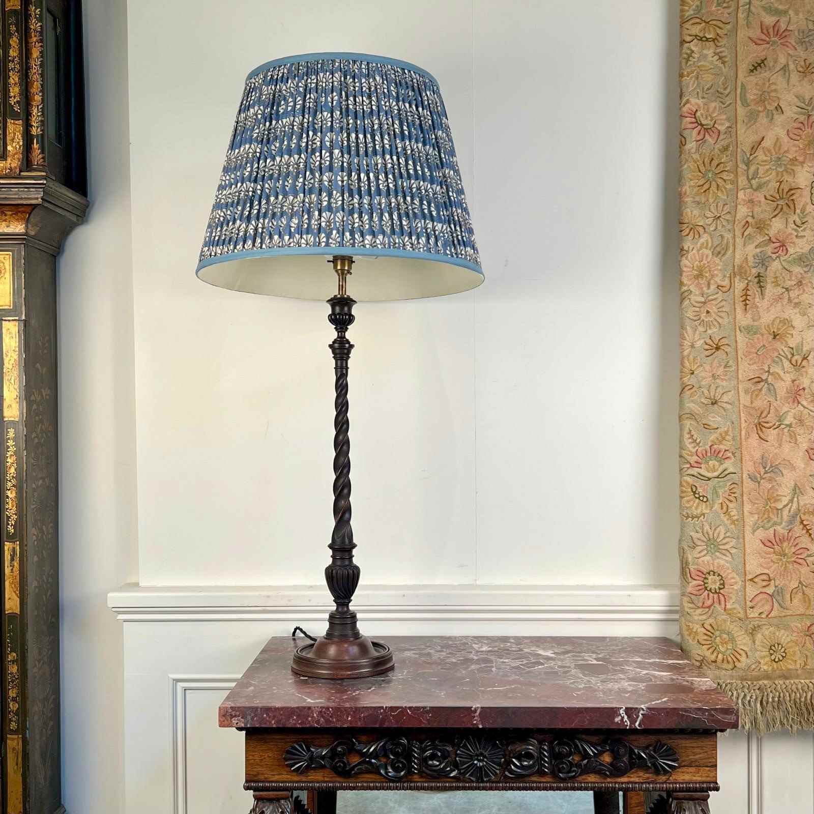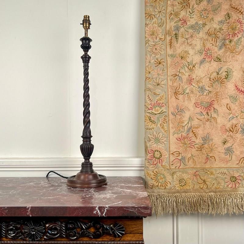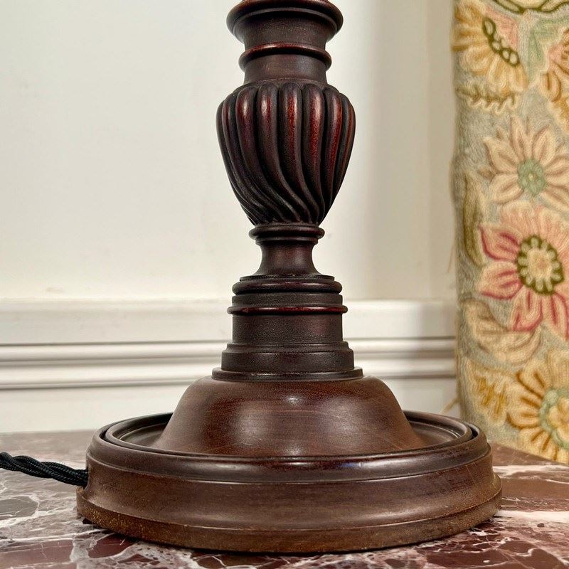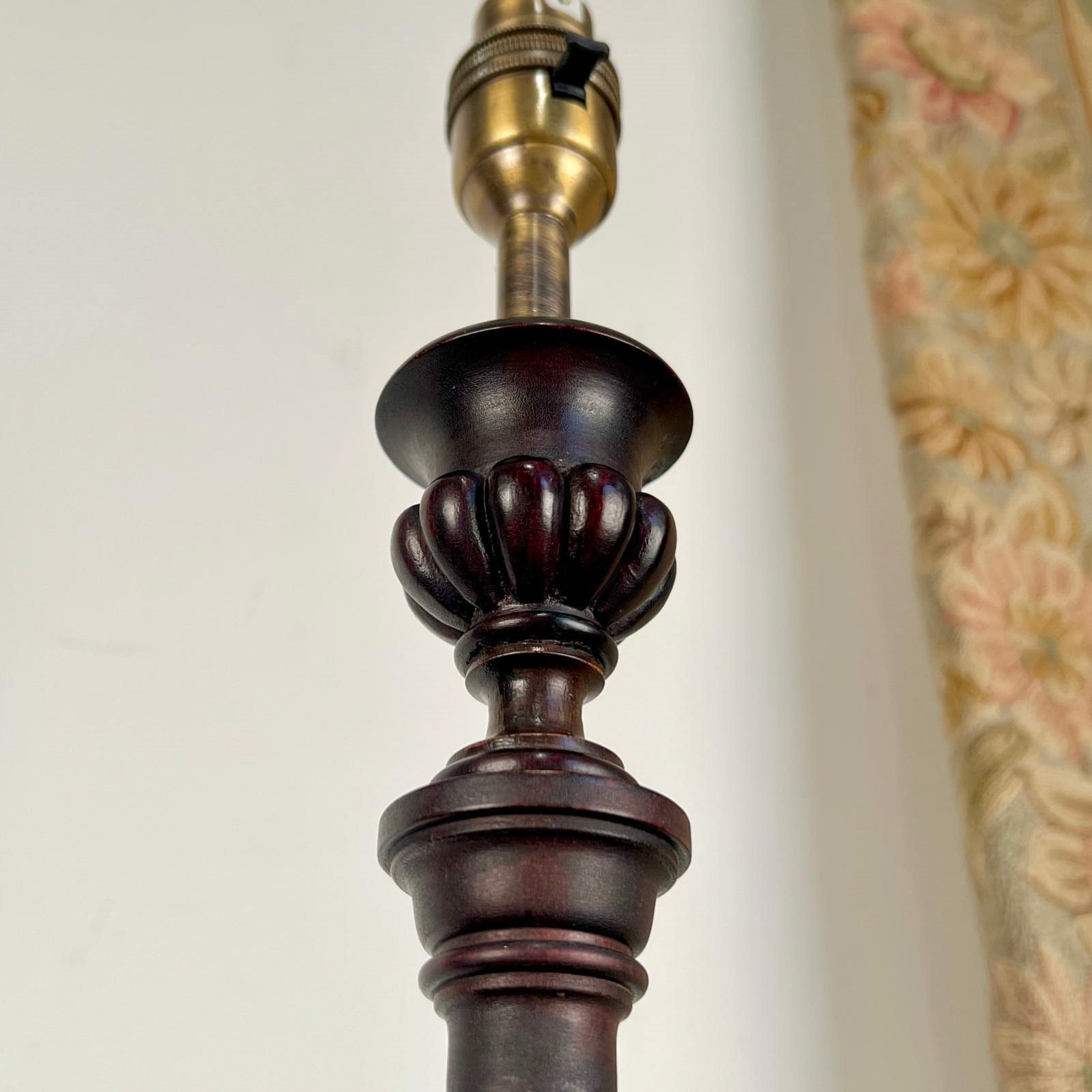 A tall Edwardian table lamp, made in solid Mahogany with a weighted base. This beautiful lamp with a twisted carved stem and gadrooned decoration. Lovely dense colour and high quality carving, converted from a candlestick to electric. Re-wired and PAT tested, shade not included. English, Circa 1910.