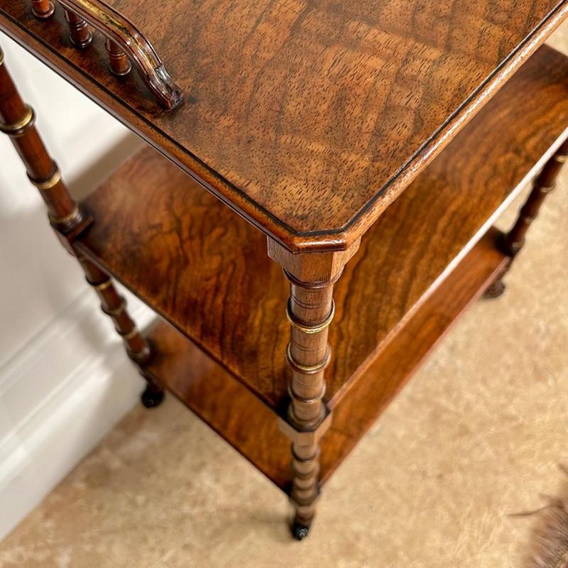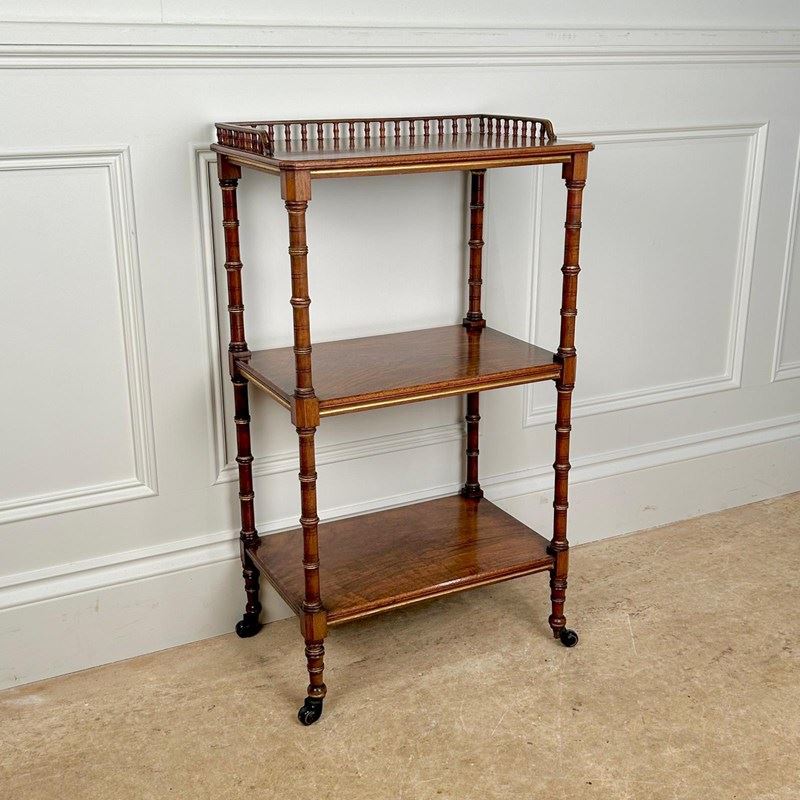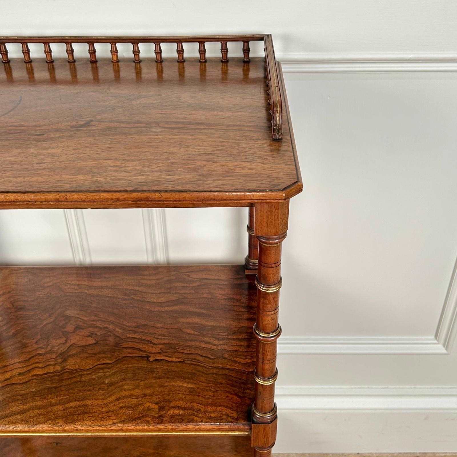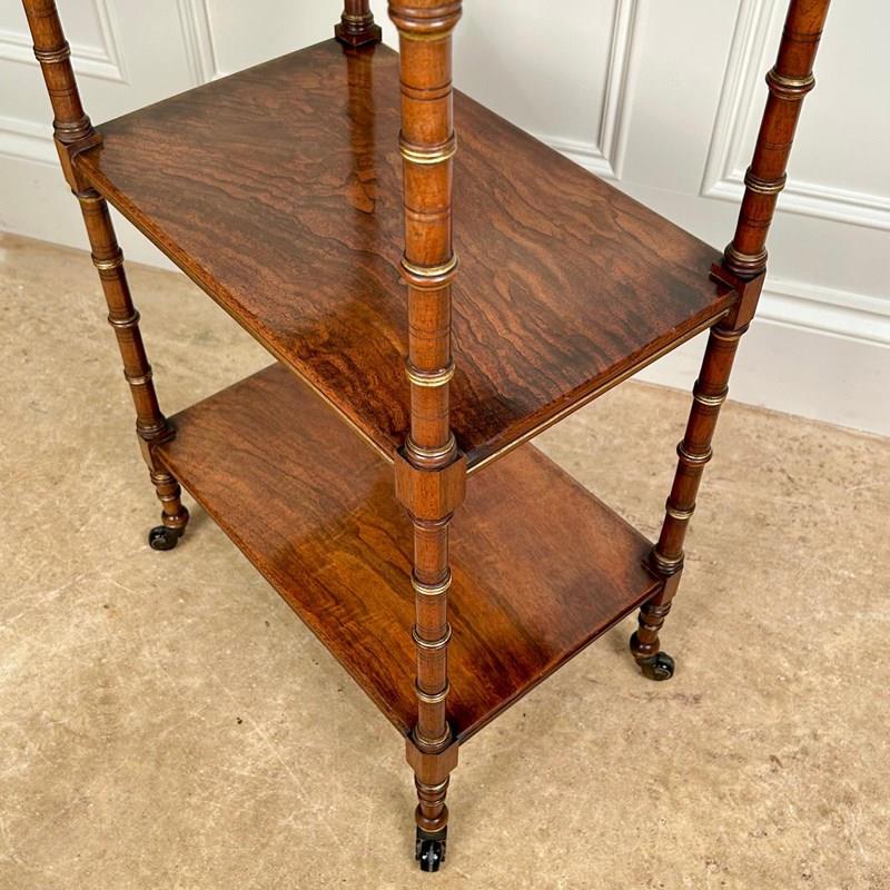 A beautiful diminutive figured walnut etagere. Perfect proportions and fine quality throughout with parcel gilt detailing to the ring turned bamboo style legs. Having a hand carved gallery with moulded gilded edge tiers. and raised on high quality Cope castors. The whole made in figured walnut with a lovely original finish and colour. English, Circa 1860.