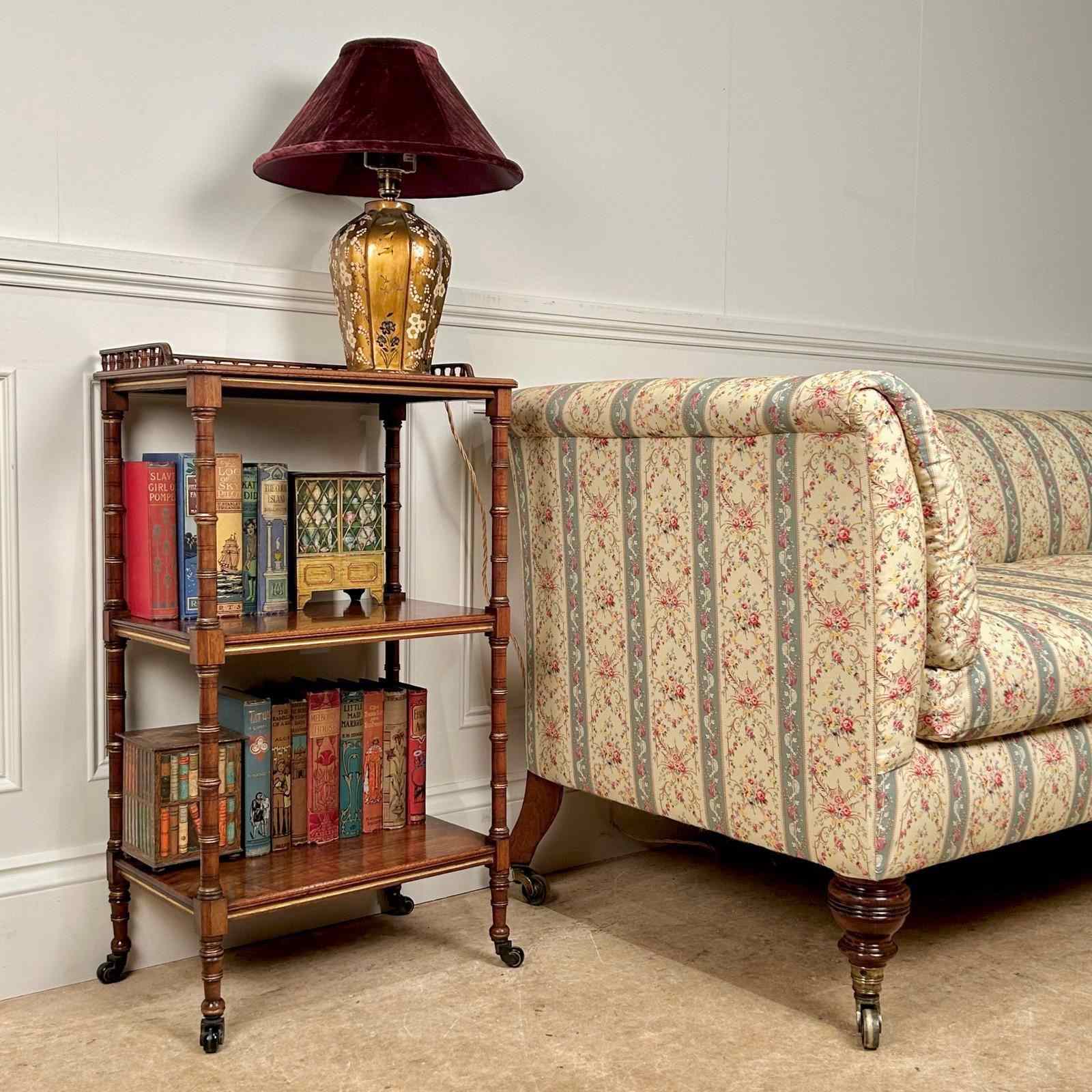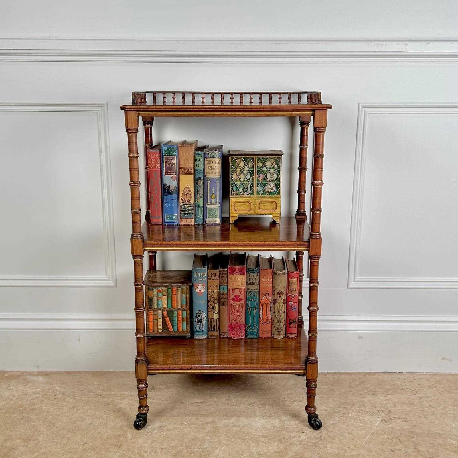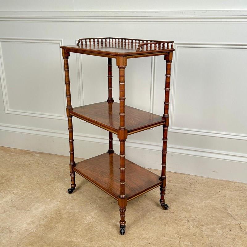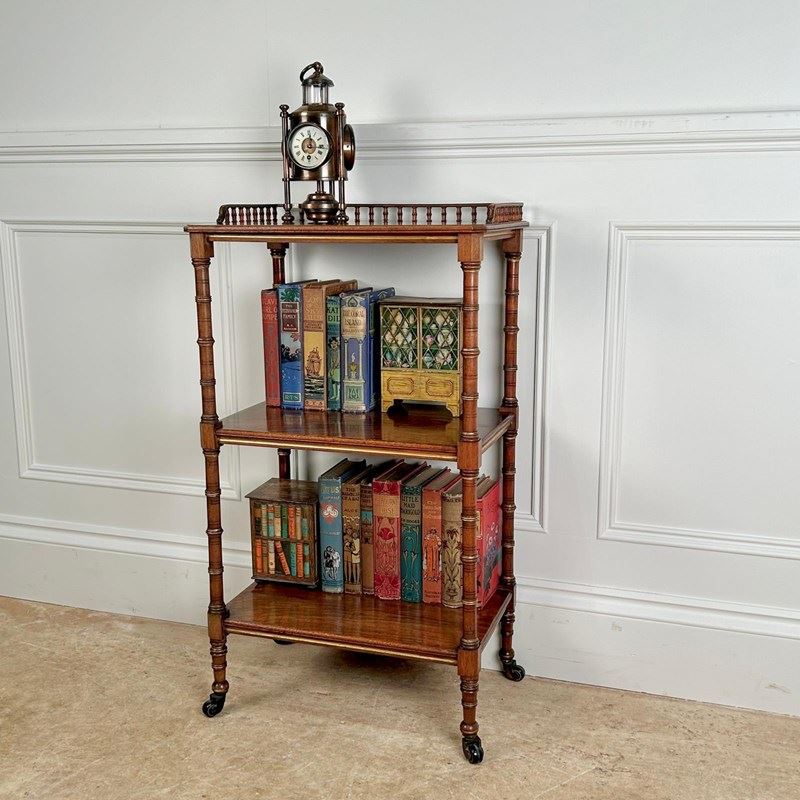 A beautiful diminutive figured walnut etagere. Perfect proportions and fine quality throughout with parcel gilt detailing to the ring turned bamboo style legs. Having a hand carved gallery with moulded gilded edge tiers. and raised on high quality Cope castors. The whole made in figured walnut with a lovely original finish and colour. English, Circa 1860.