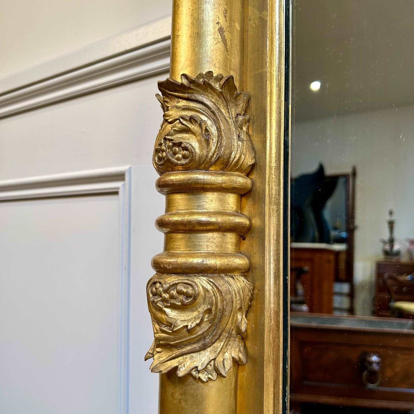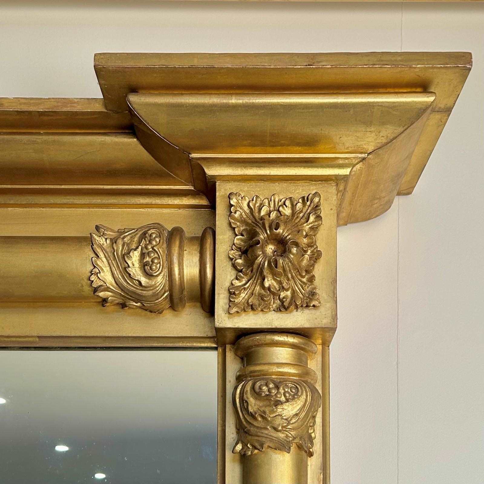 A superb fine quality, oversized Regency water gilded pier mirror of large proportions, framed by turned pilasters with scrolled acanthus decoration, having an inverted break fronted moulded cornice. Retaining the original mirror plate of which give a good clear reflection. superb original condition throughout. English Circa 1825