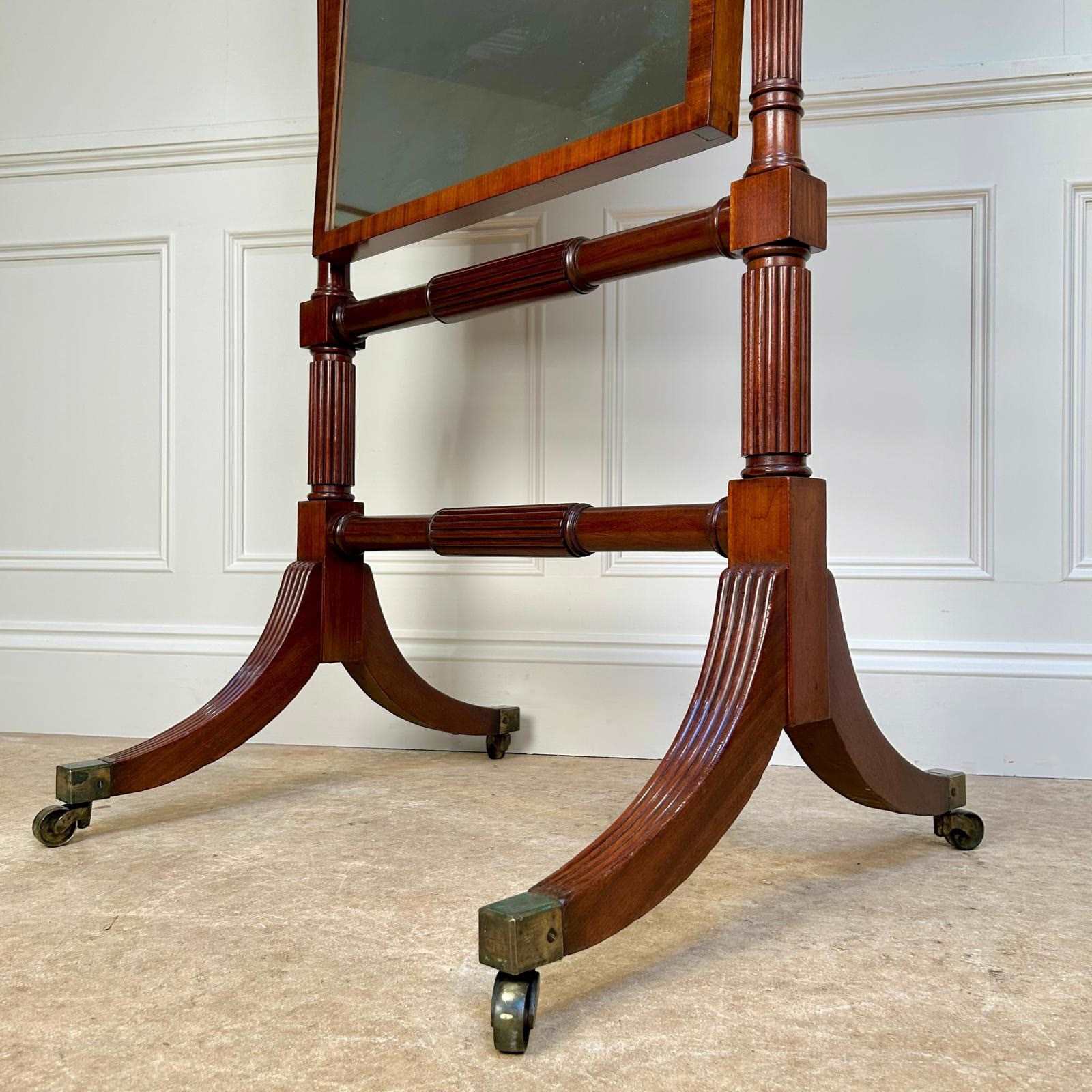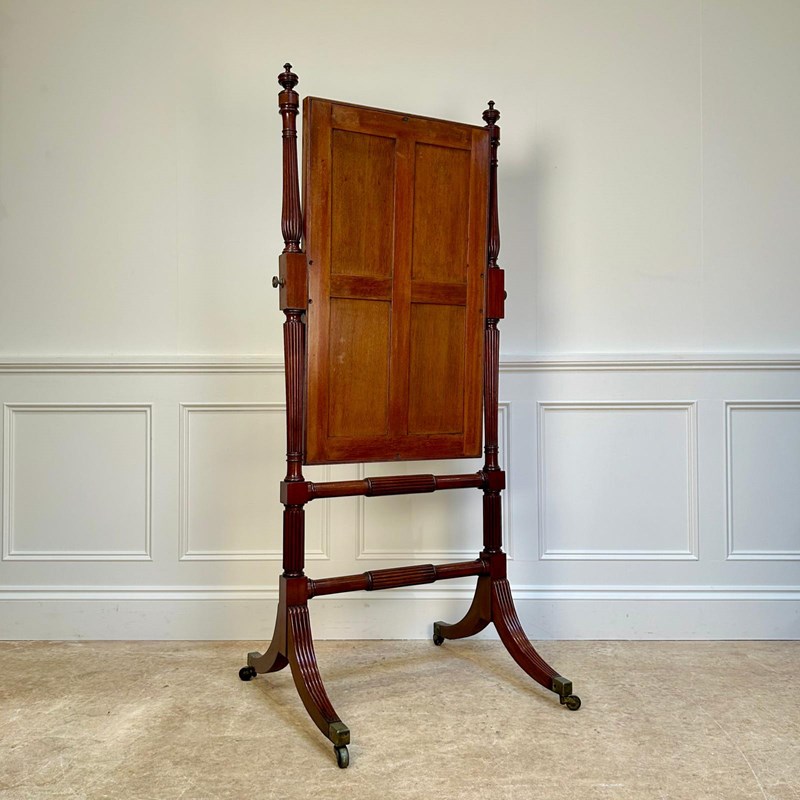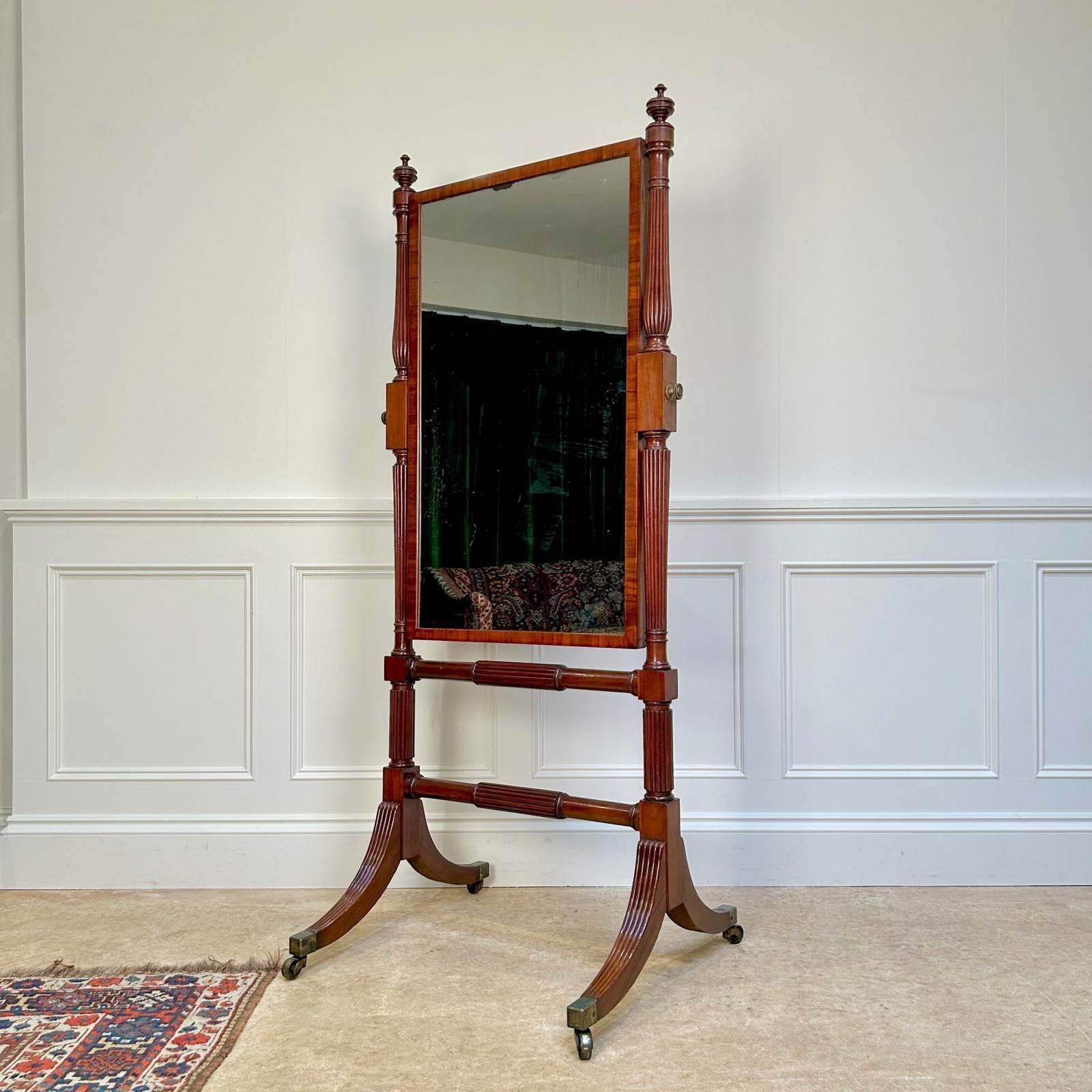 A Gillows mahogany cheval mirror of wonderful quality. The original rectangular mirror plate with a crosss-banded frame with reeded supports and turned finials. The whole raised on reeded outswept legs with original gilt lacquered brass castors. Super colour and condition throughout. Atb, English, Circa 1810.