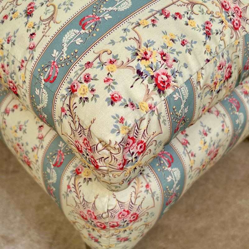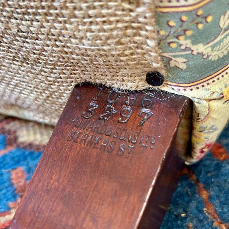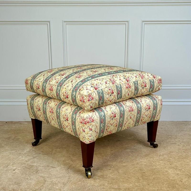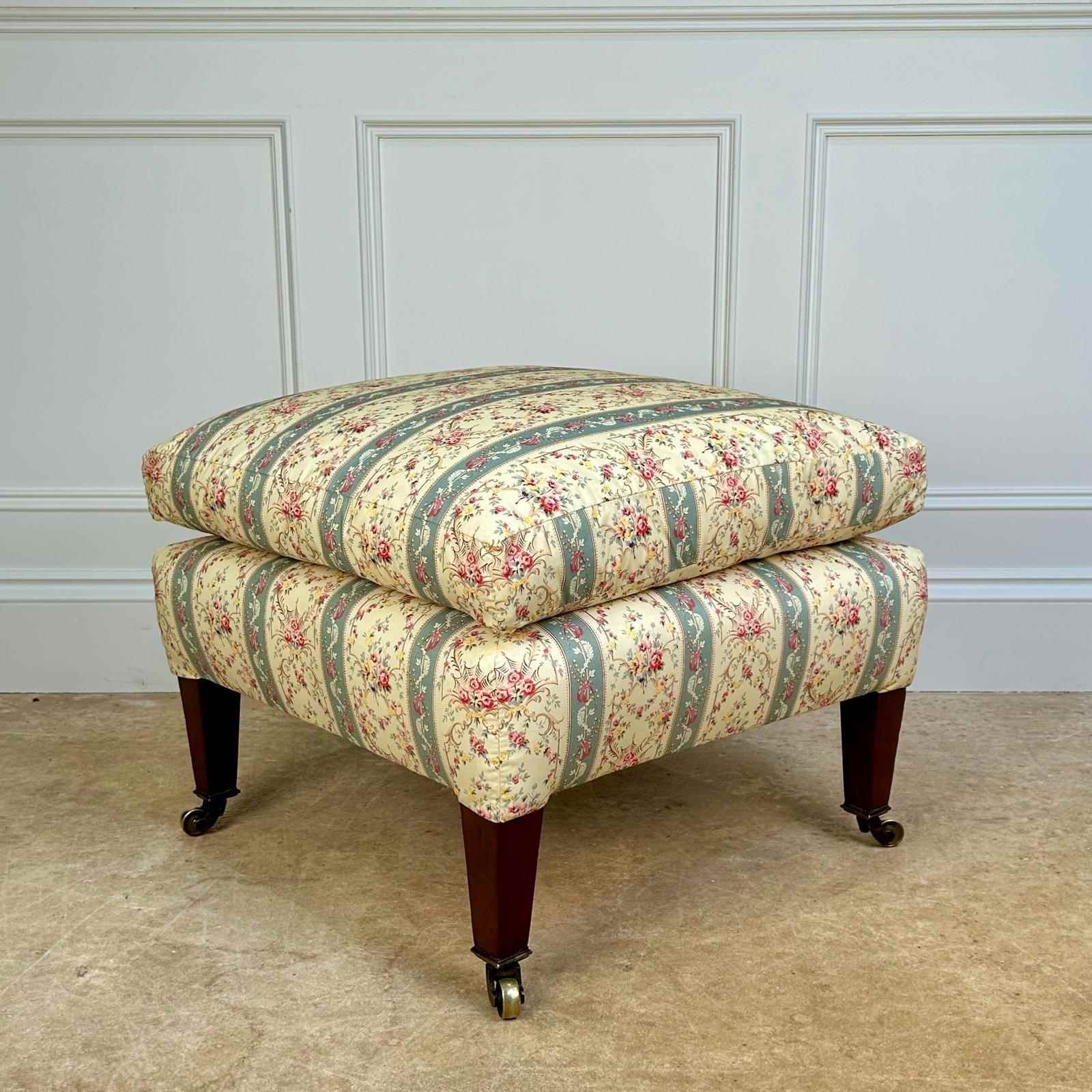 A Howard & Sons square ttoman stool. Retaining the original horsehair and down feather cushion, raised on tapered walnut legs with the original stamped gilt lacquered brass castors. English, Circa 1910, numbered and stamped "Howard & Sons Ltd, Berners Street."