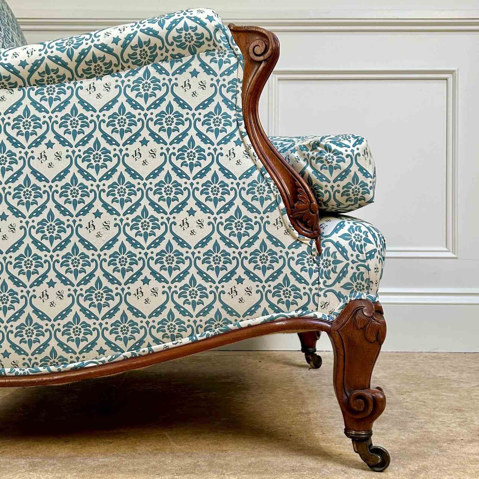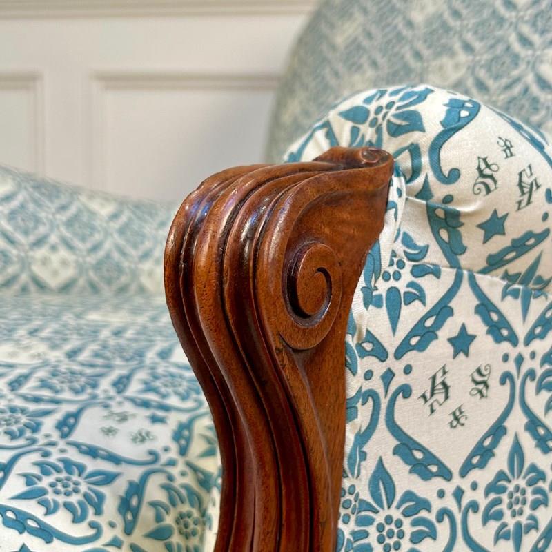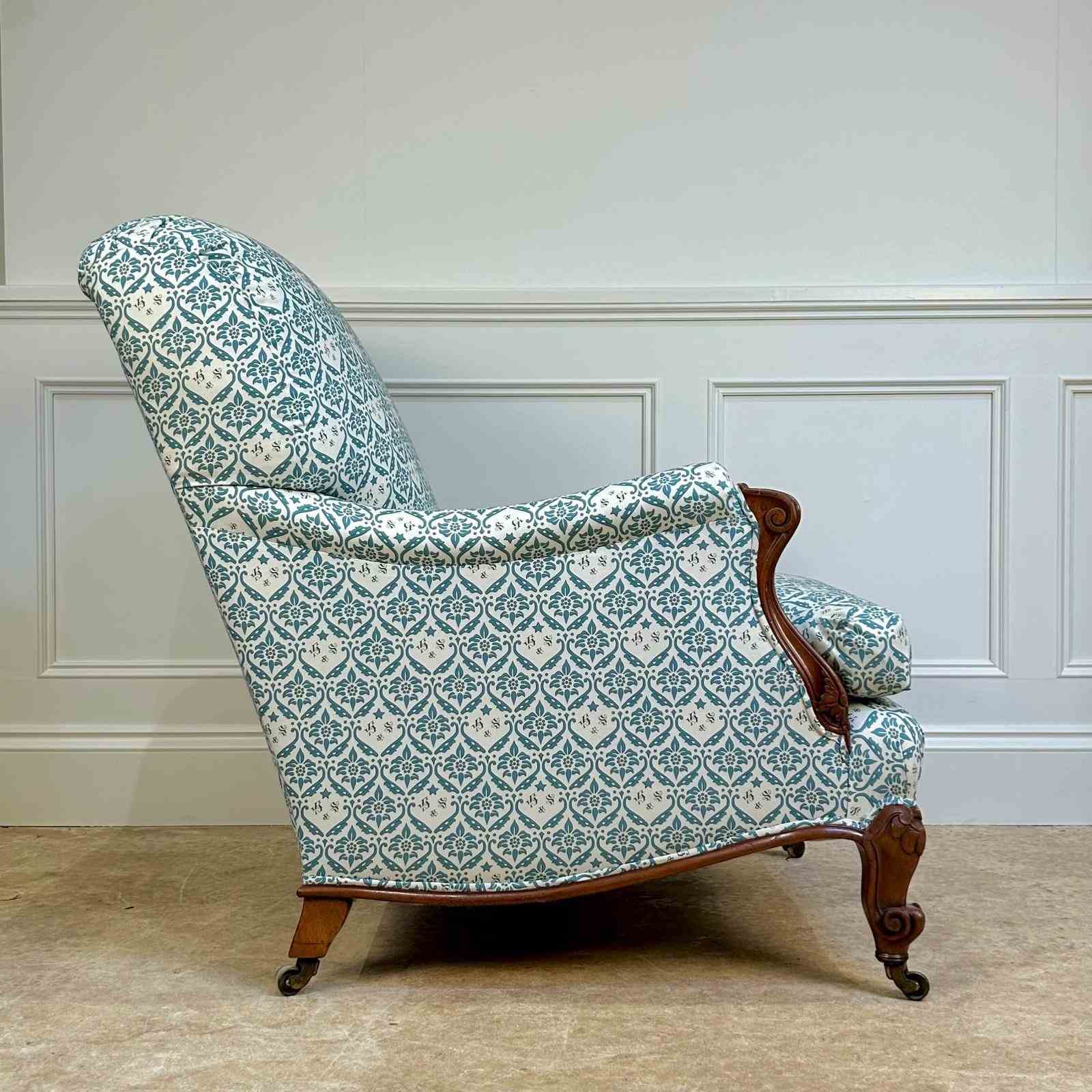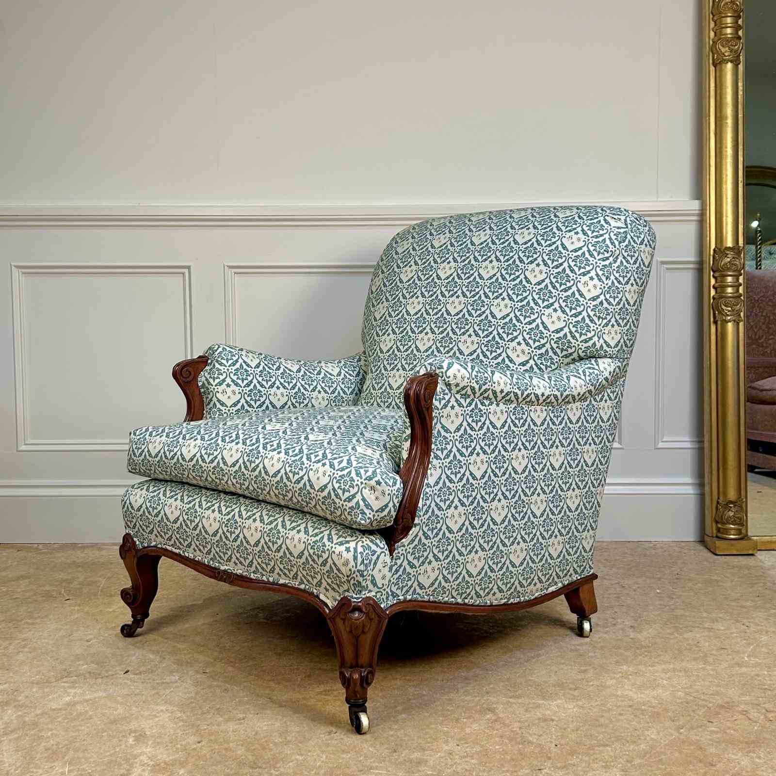 A wonderful and rare Howard & Sons "French" Bridgewater armchair. Having a sprung seat with Sierge de Duvet and a sprung back, the arms with scrolled mahogany carving. Retaining the original feather and down seat cushion and raised on fabulous scrolled mahogany legs with the original stamped gilt lacquered brass castors, stamped "Howard & Sons Ltd, Berners St" to the back leg. This chair has been stripped back to the frame and re-built using traditional upholstery methods. Retaining all the original horsehair and feather, re-covered in our Howard & Sons ticking. A rare example of this iconic model. English, Circa 1900.