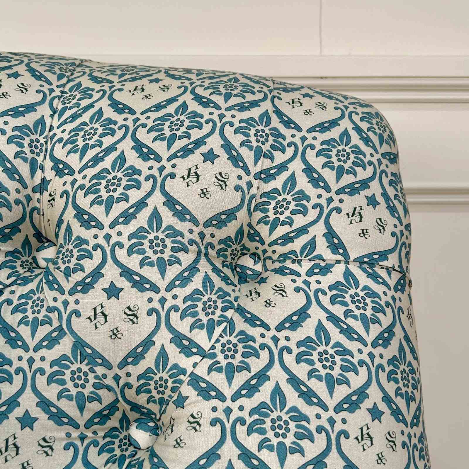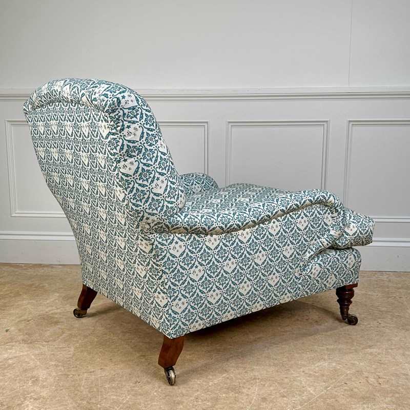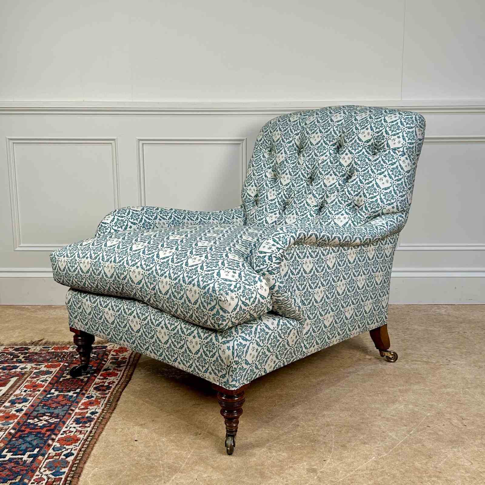 A wonderful Howard & Sons Grafton armchair. This beautiful chair retains the original horsehair and down feather cushion. Raised on walnut turned legs with the original stampled gilt lacquered brass castors. The back leg stamped Howard & Sons Ltd, Berners Street. A super original example. Re-upholstered in H&S monogrammed ticking. English, Circa 1910.