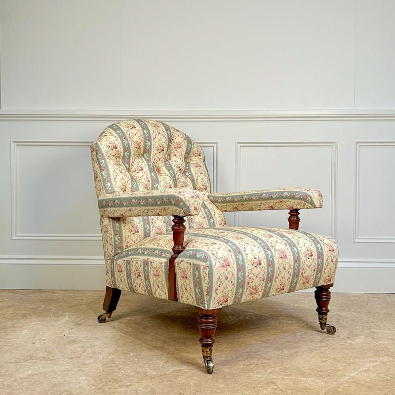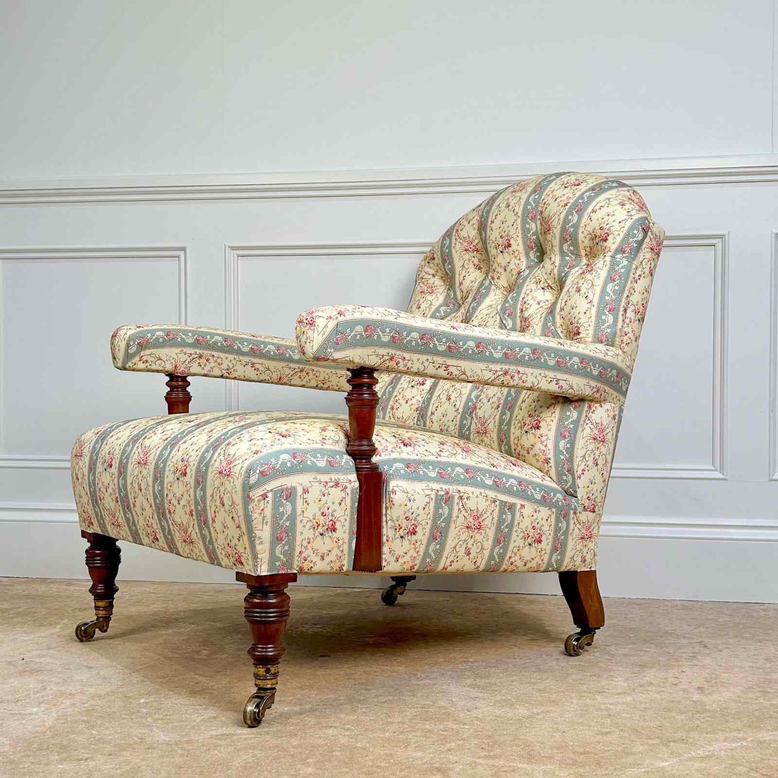 A Howard & Sons walnut open armchair. This lovely chair retaining the original horsehair and sprung seat and re-upholstered in our Howard & Sons striped ticking. This particular model with a stamped Howard & Sons Ltd, Berners Street and numbered back leg. Raised on turned walnut legs with the original gilt lacquered stamped brass castors. English, Circa 1900.