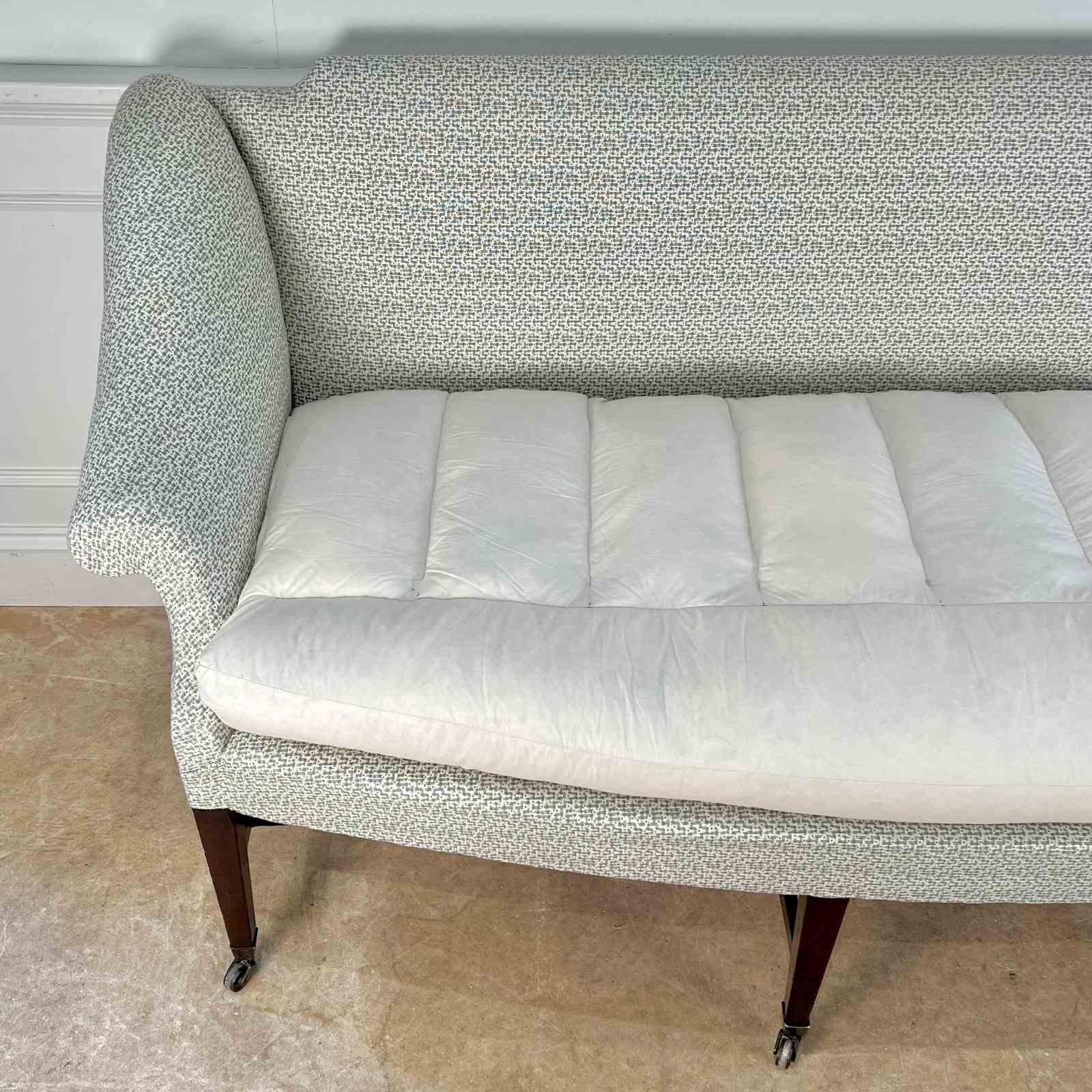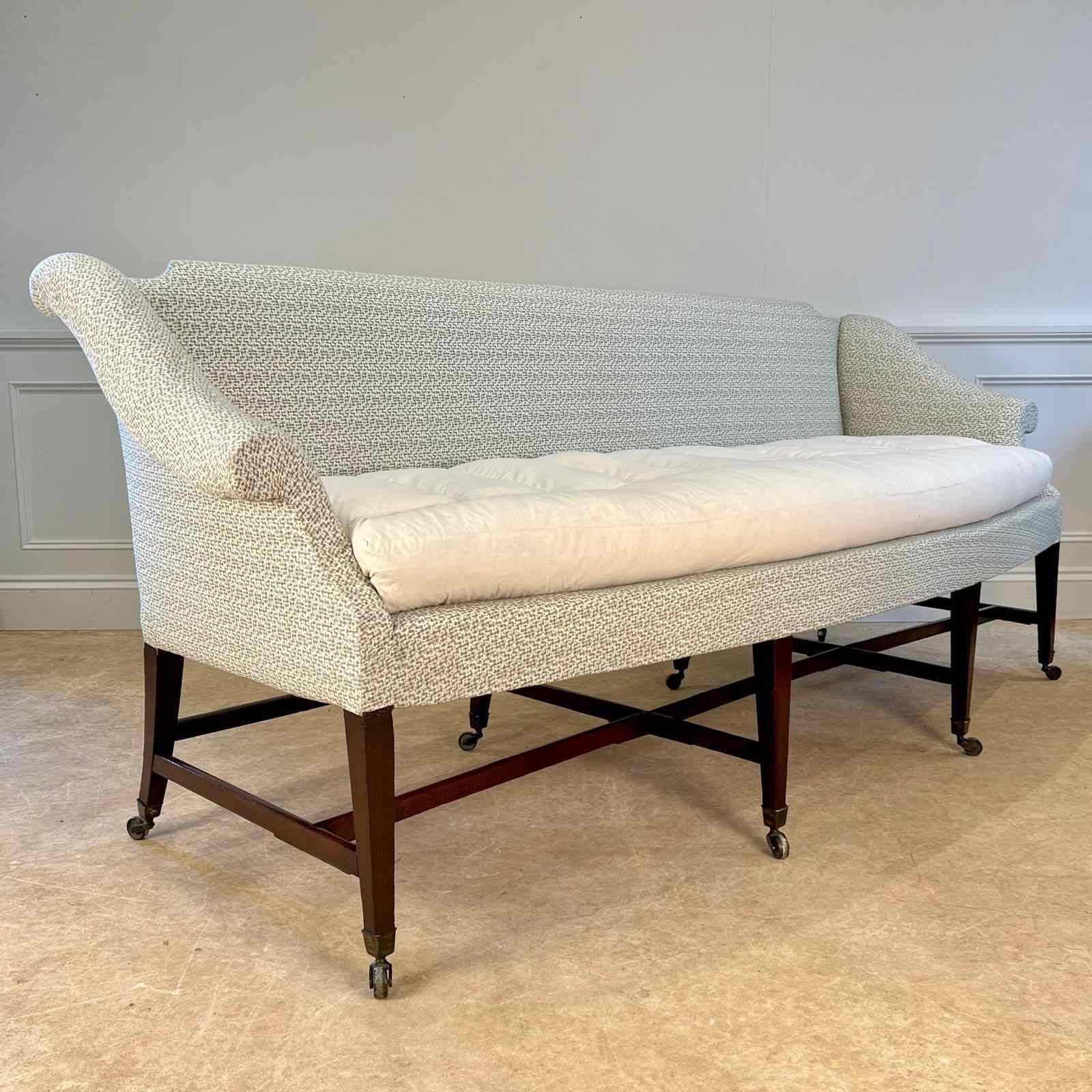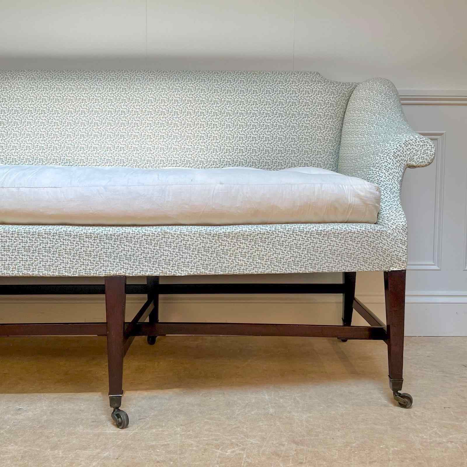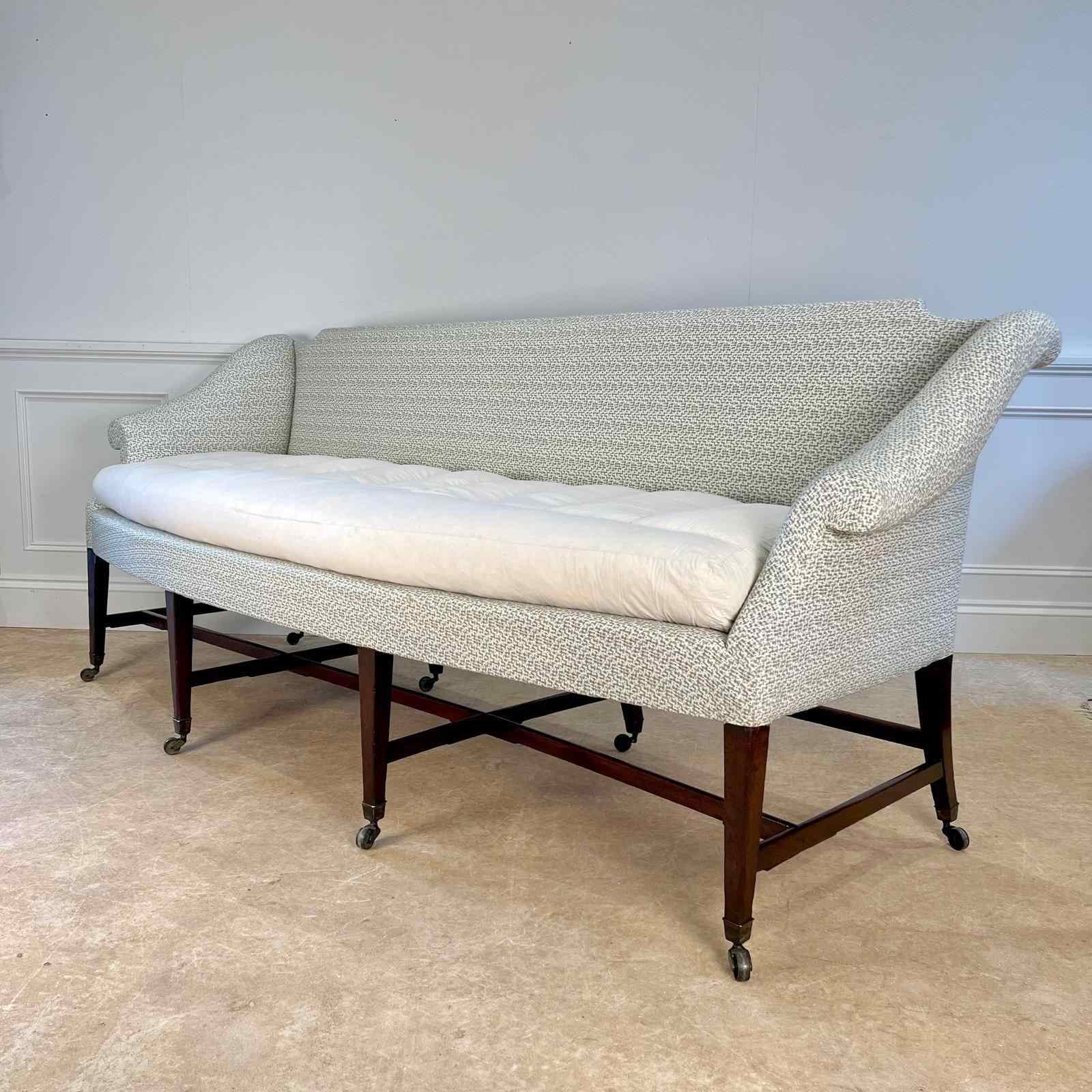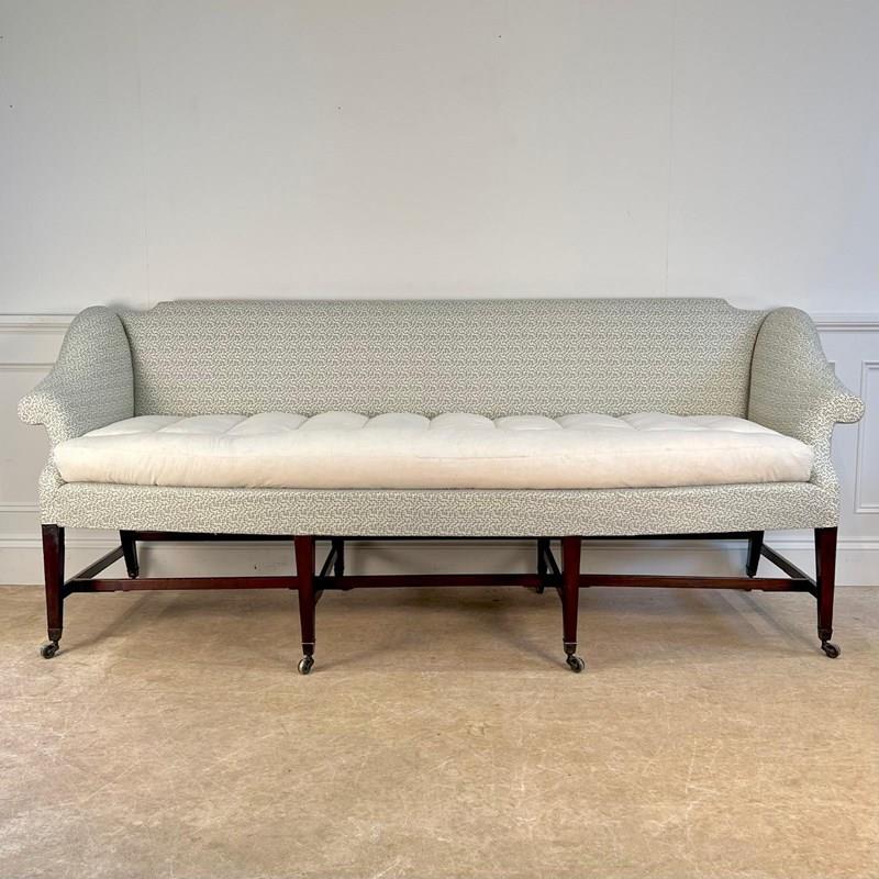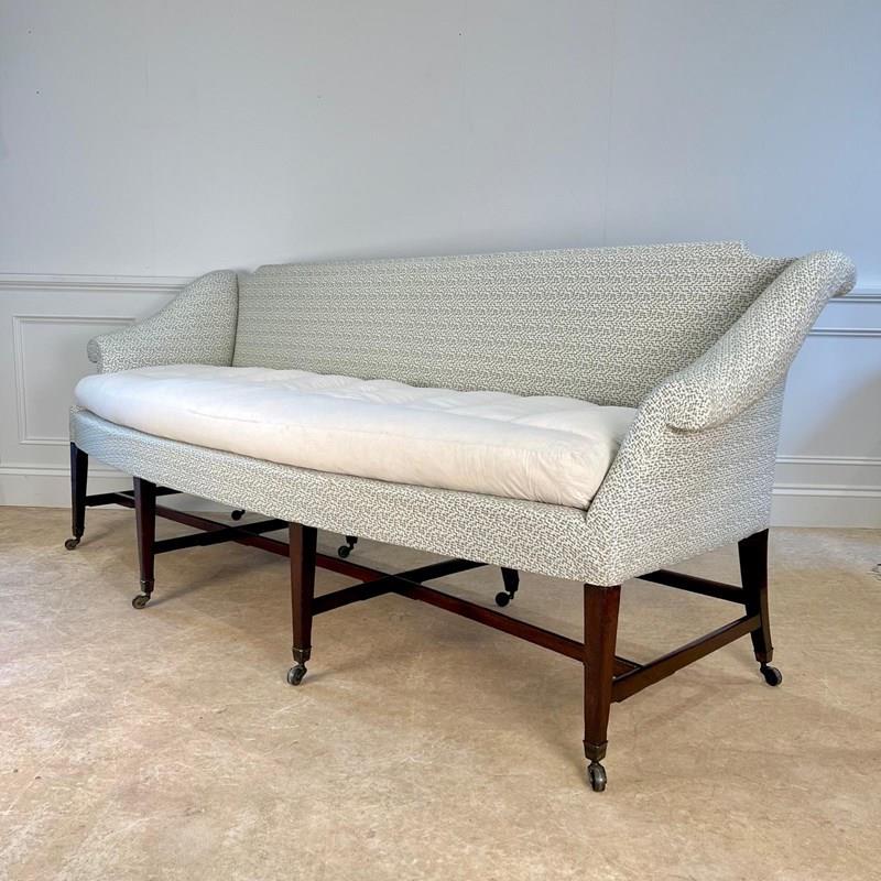 An elegant 18th century mahogany sofa. Raised on 8 mahogany legs with adjoining stretchers and original brass castors. Having the loveliest subtle detailing throughout with good colour and original finish. Super condition and now ready for re-upholstery. English, Circa 1790.