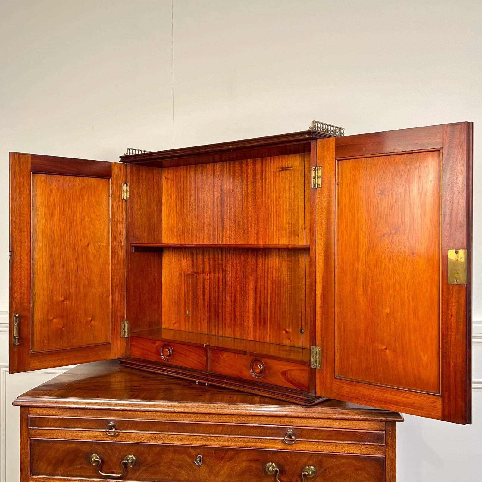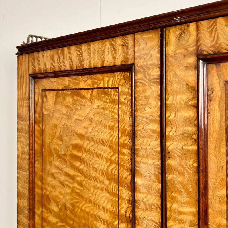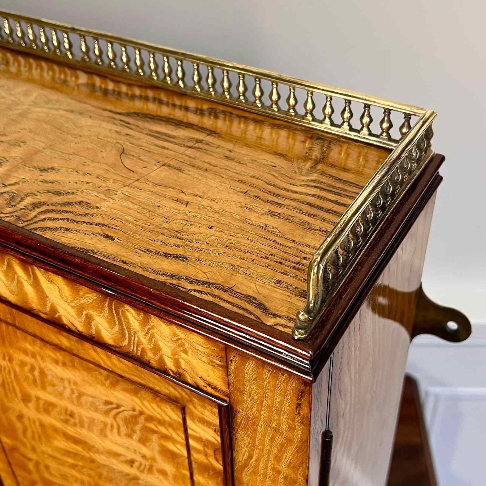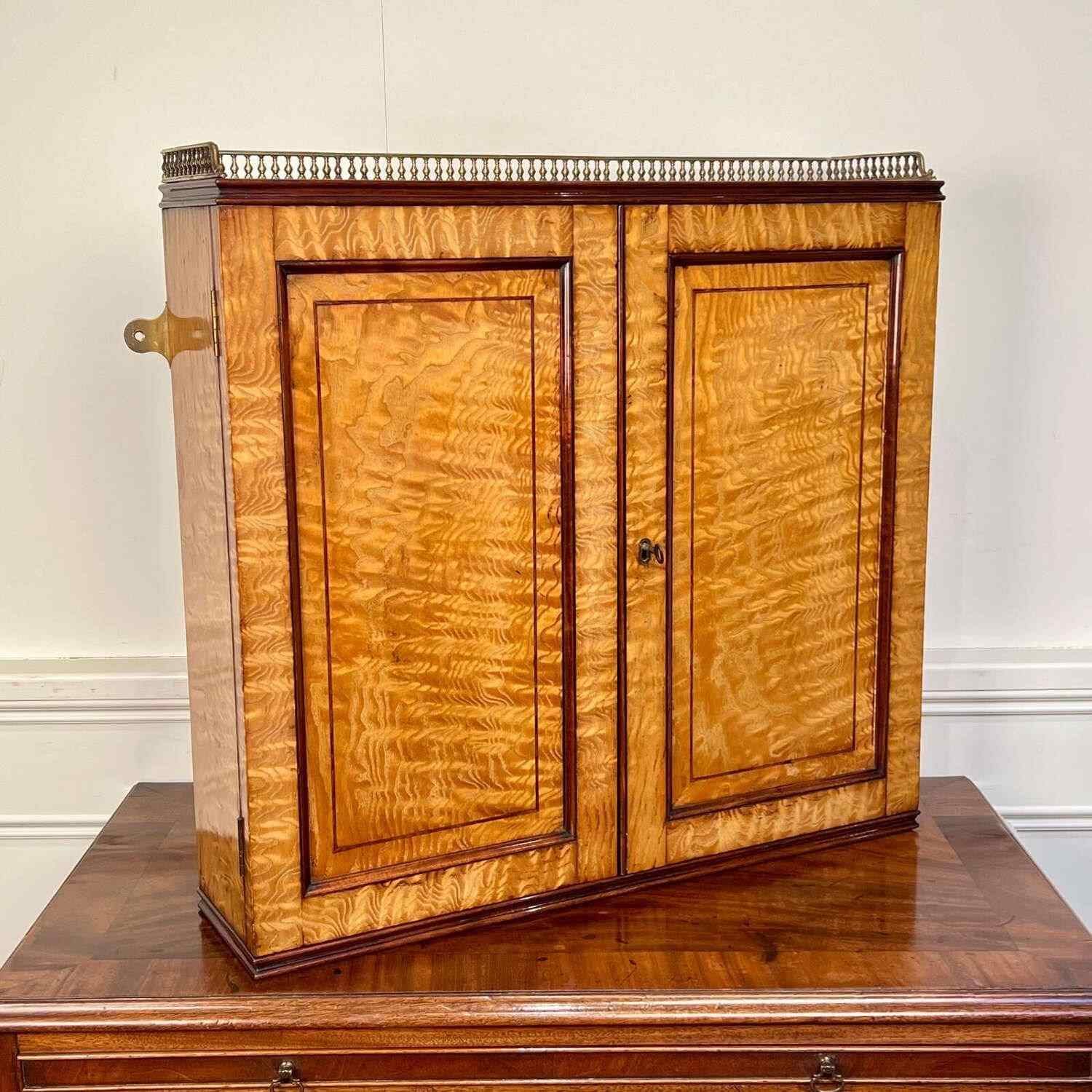 A rare Holland & Sons wall cabinet in Hungarian Ash and Purpleheart wood. Having a three-quarter gallery in lacquered brass and finished in showood to the underside. The panelled doors open to reveal a fixed shelf and 2 drawers, all beautifully Mahogany lined. Retaining a wonderful original finish. English, Circa 1850, Atb.