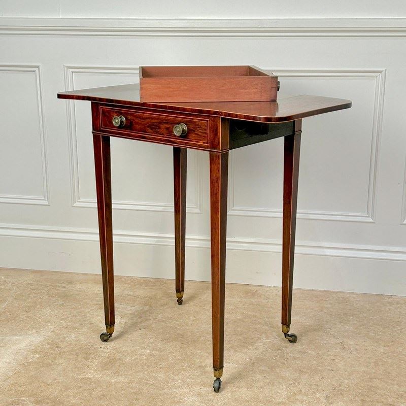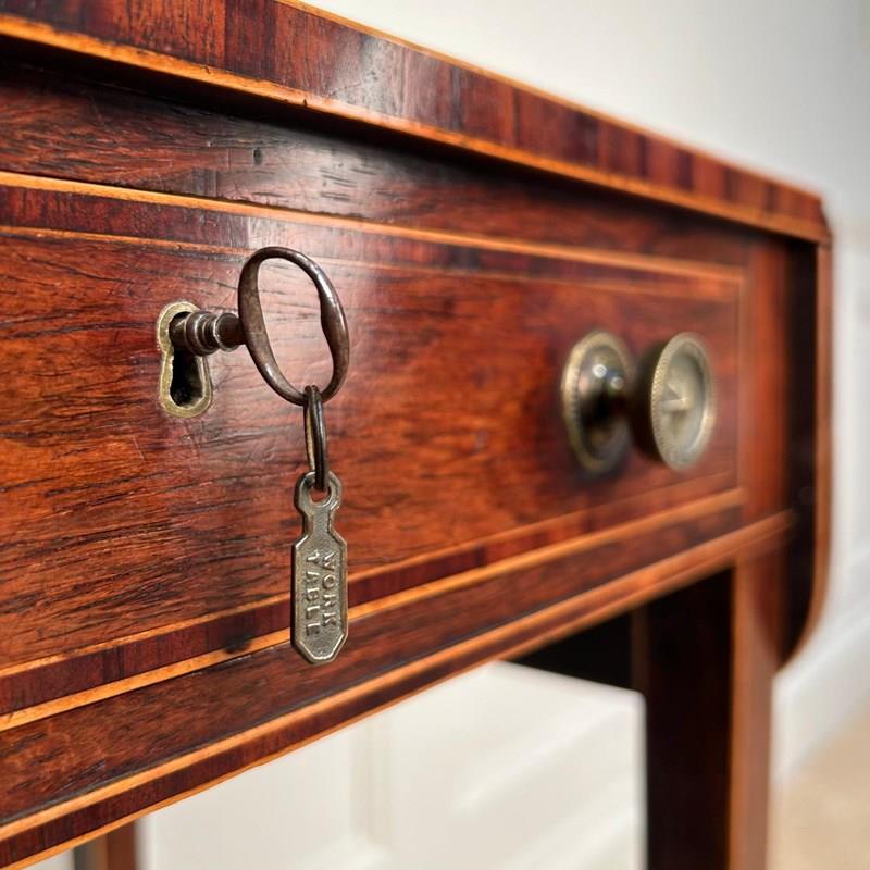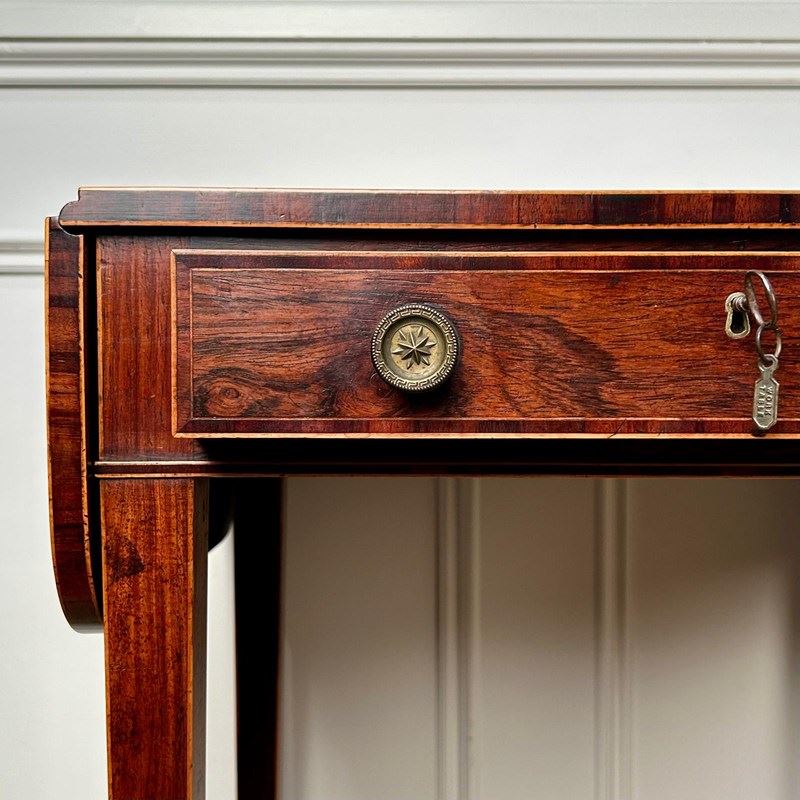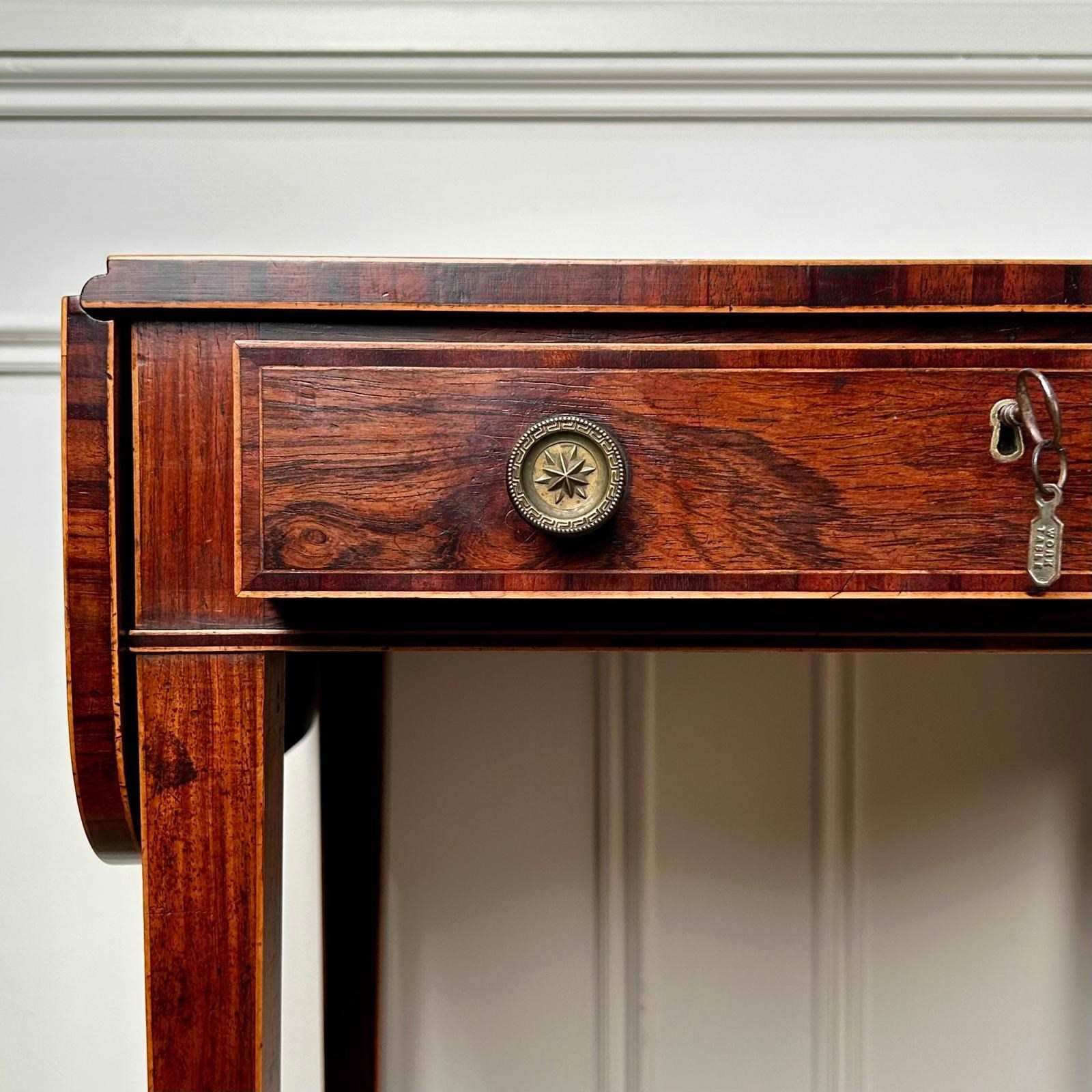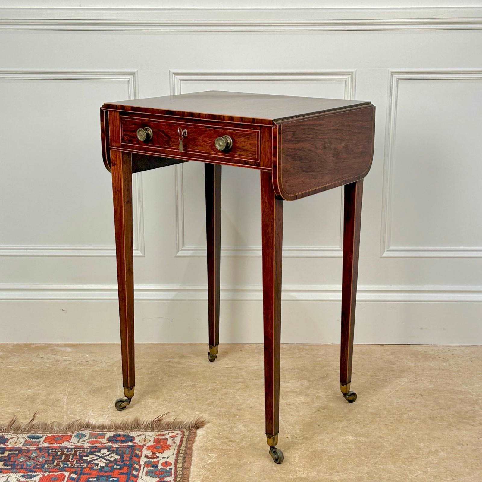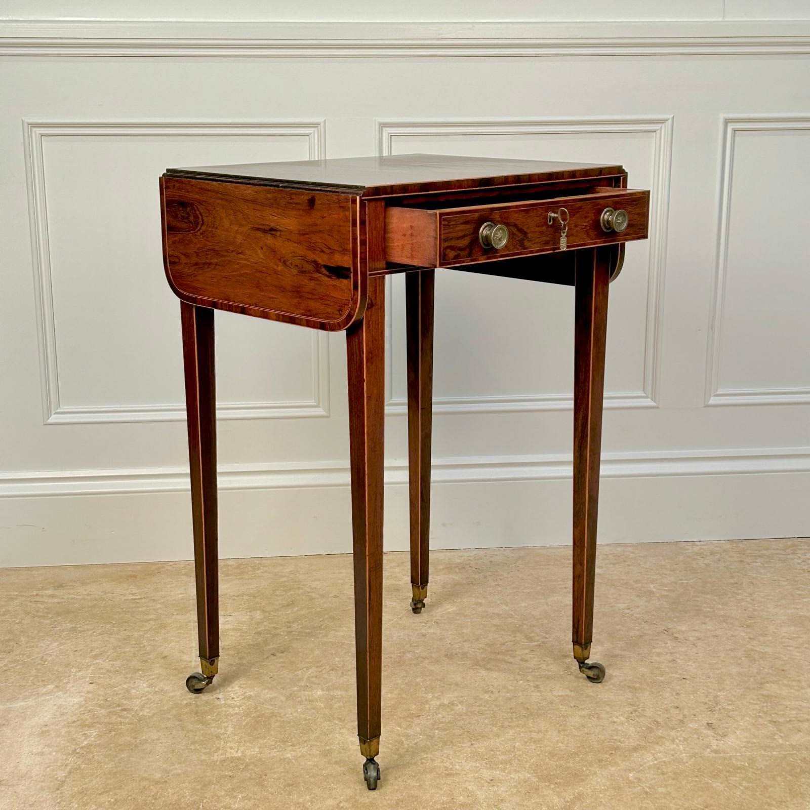 A small and beautiful Rosewood side / sofa table with boxwood line inlay. Having a single drawer which is all mahogany lined and double sided.. Retaining the original brass knob handles, lock and key. The whole raised on slender tapering legs with original brass castors. Superb colour and original condition throughout. English, Circa 1815.