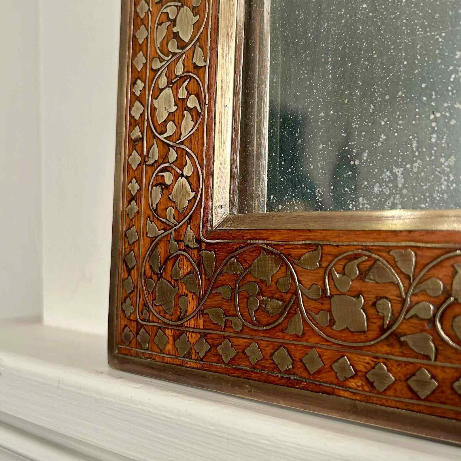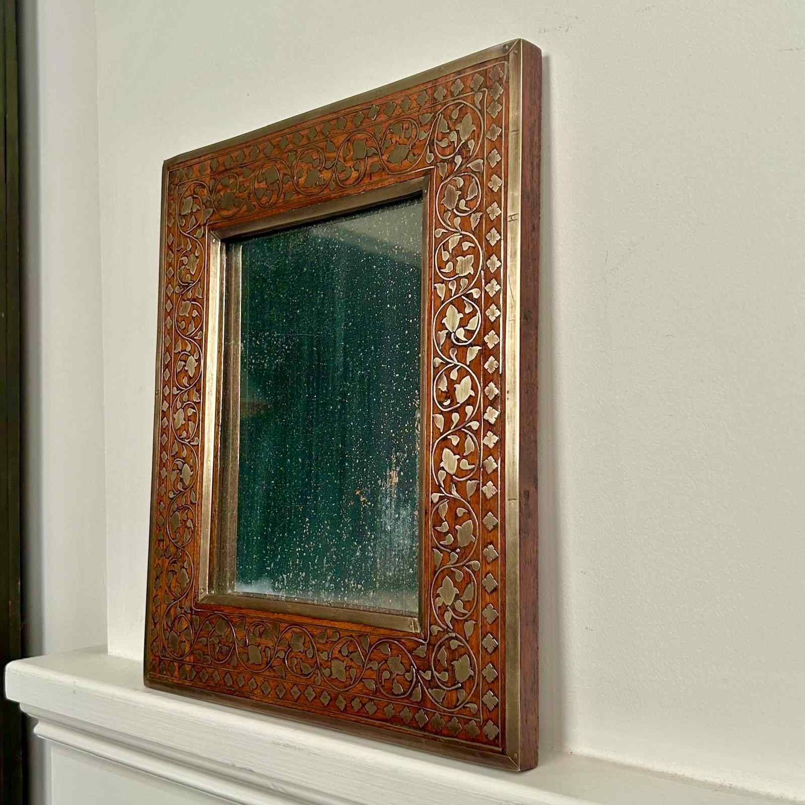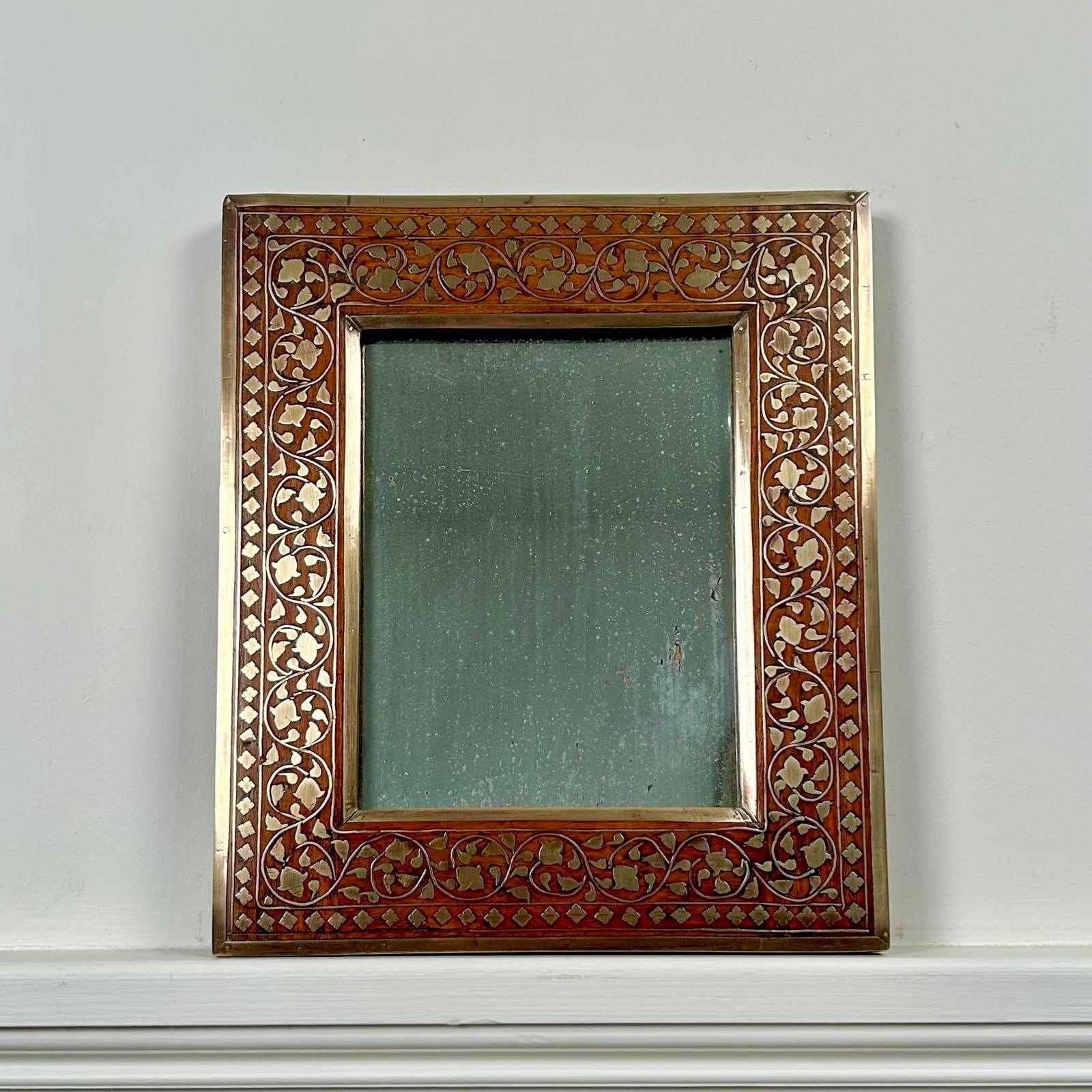 A small and very pretty brass inlaid mirror with good colour. Having a brass bevelled slip and brass outer moulding. Retaining the original foxed mirror plate, lovely original condition throughout. Indian, Circa 1890.