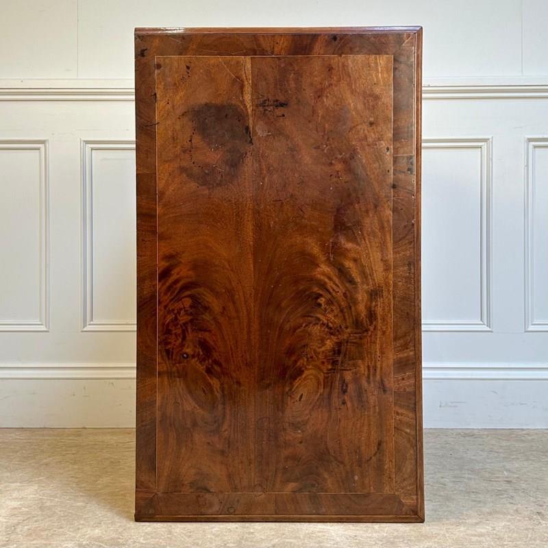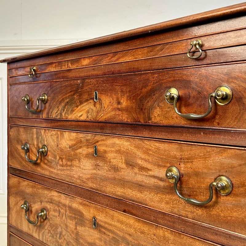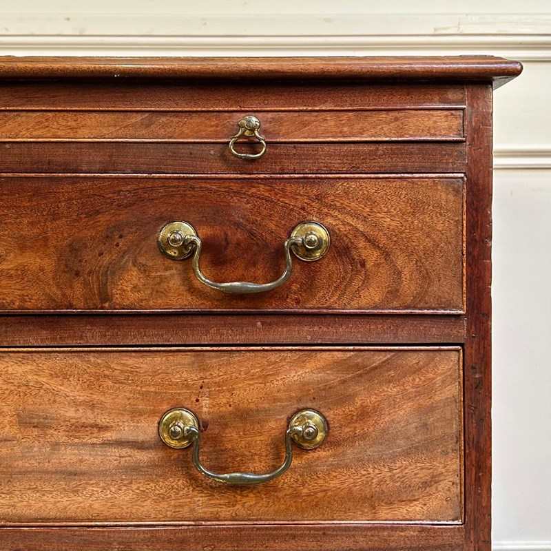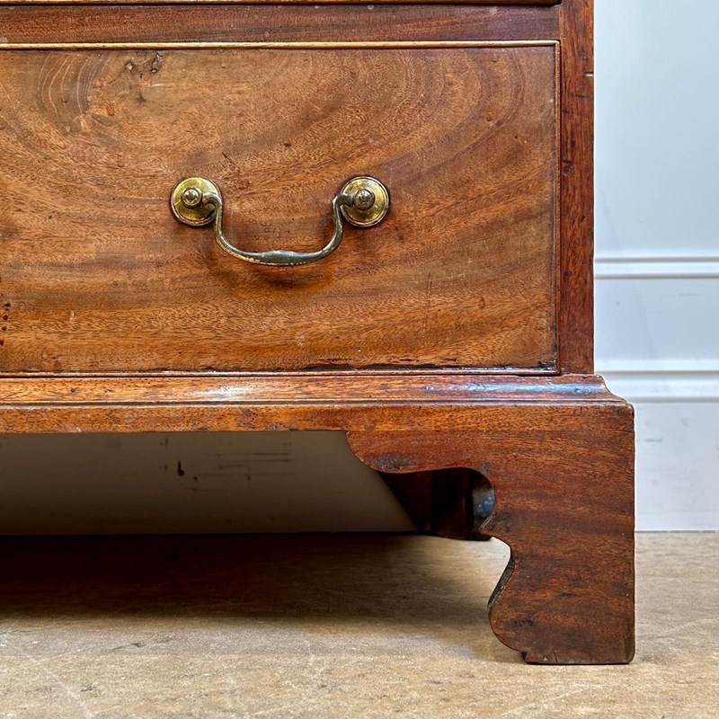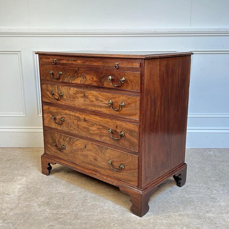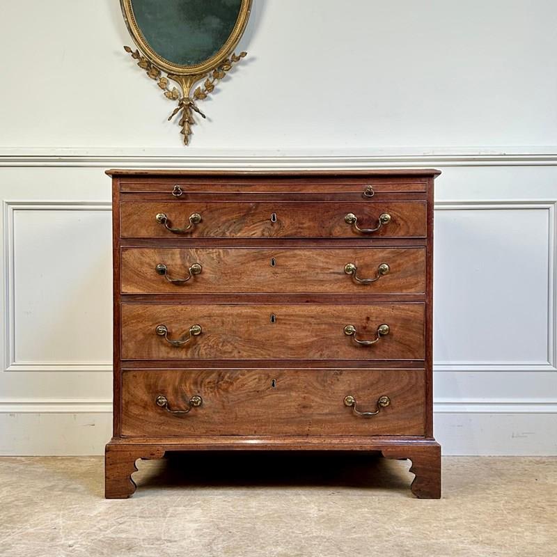 A George III mahogany bachelors chest with a wonderful original finish. This small and well proportioned chest with a brushing slide and having an arrangement of 4 graduated drawers, all beautifully oak lined and retaining the original, locks, handles and escutcheons. The moulded top cross-banded with boxwood line inlay, the whole raised on shaped bracket feet. Super colour with wonderful timber throughout. English, late 18th century.