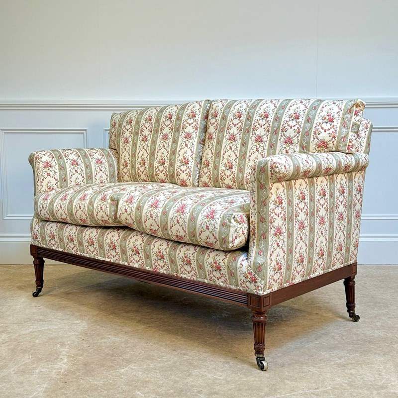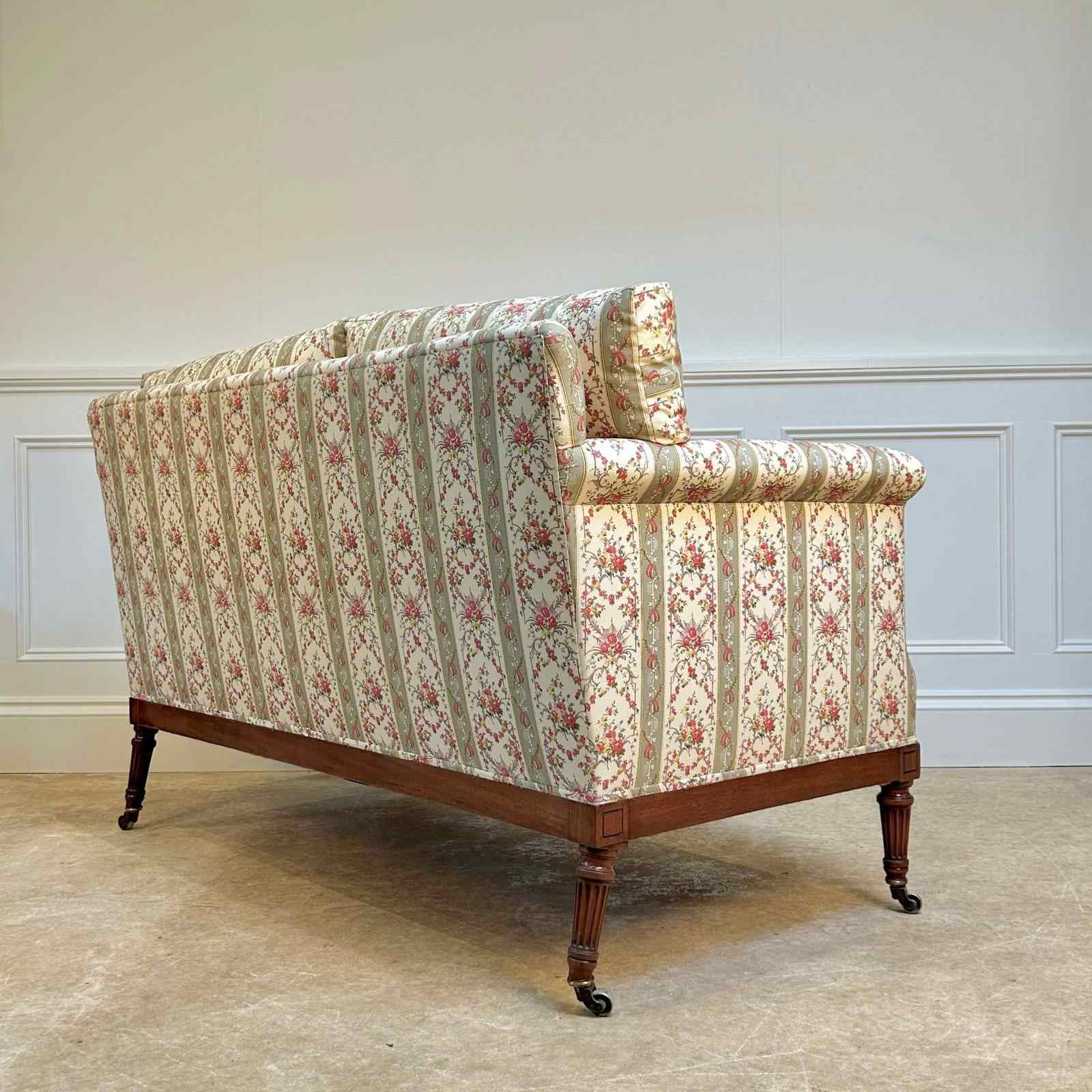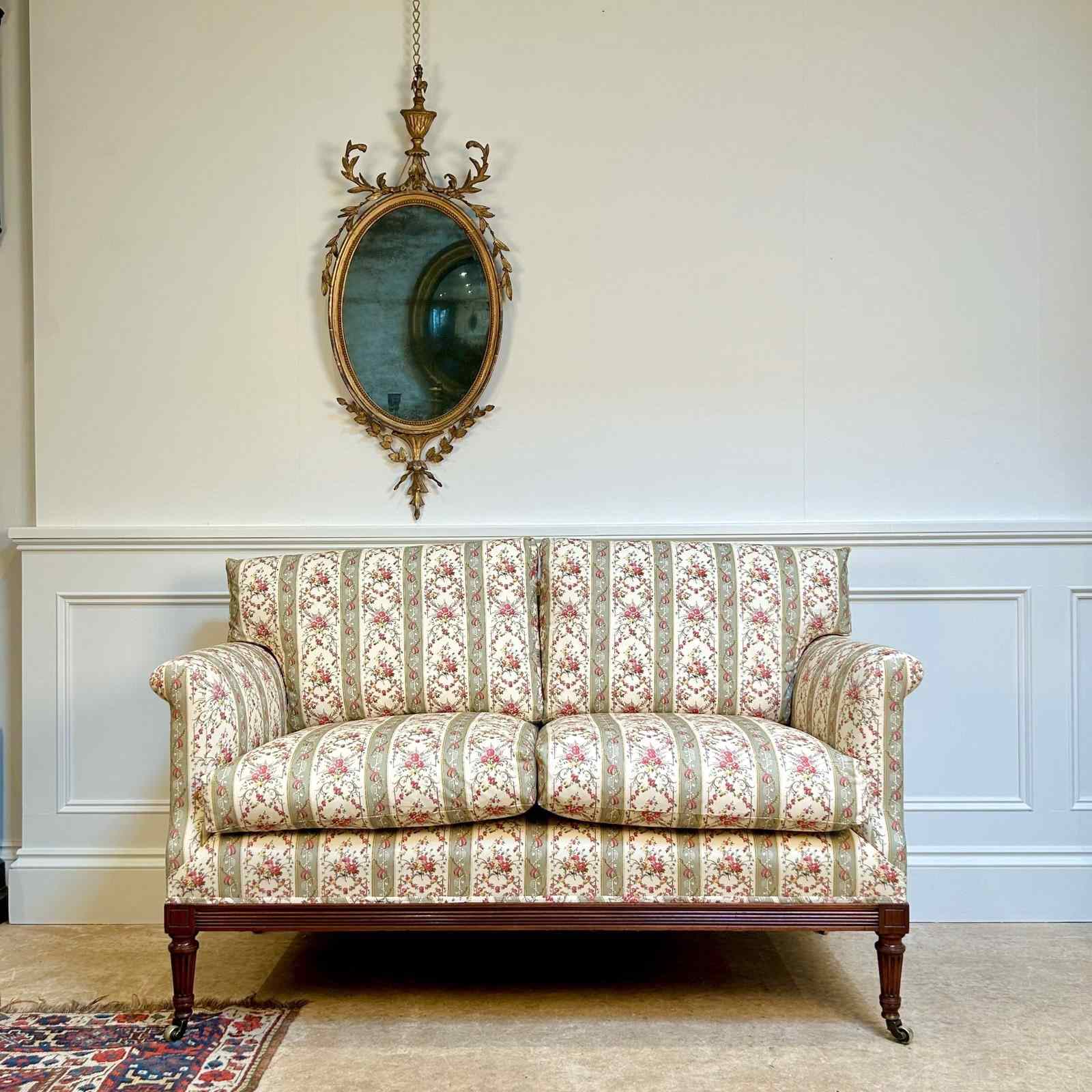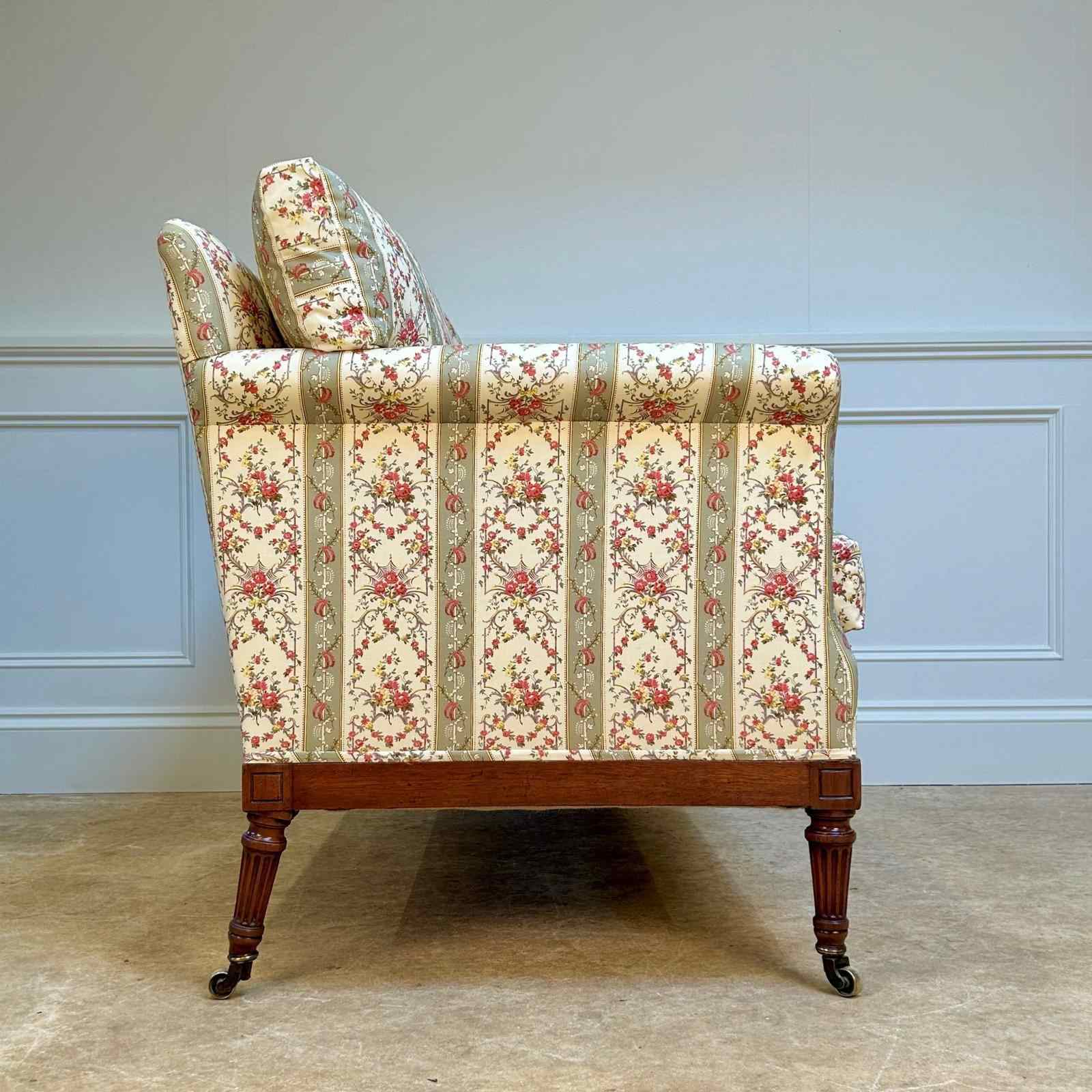 A superb small Howard & Sons mahogany sofa, having a sprung back and seat with down and feather cushions. The mahogany rail to all 4 sides and fluted carving to the front. The whole raised on 4 tapered fluted legs with the original gilt lacquered brass Howard & Sons stamped castors. Recently re-upholstered in Howard floral ticking. The back leg numbered and stamped to the rail "Howard & Sons Ltd, Berners St". English, Circa 1900.