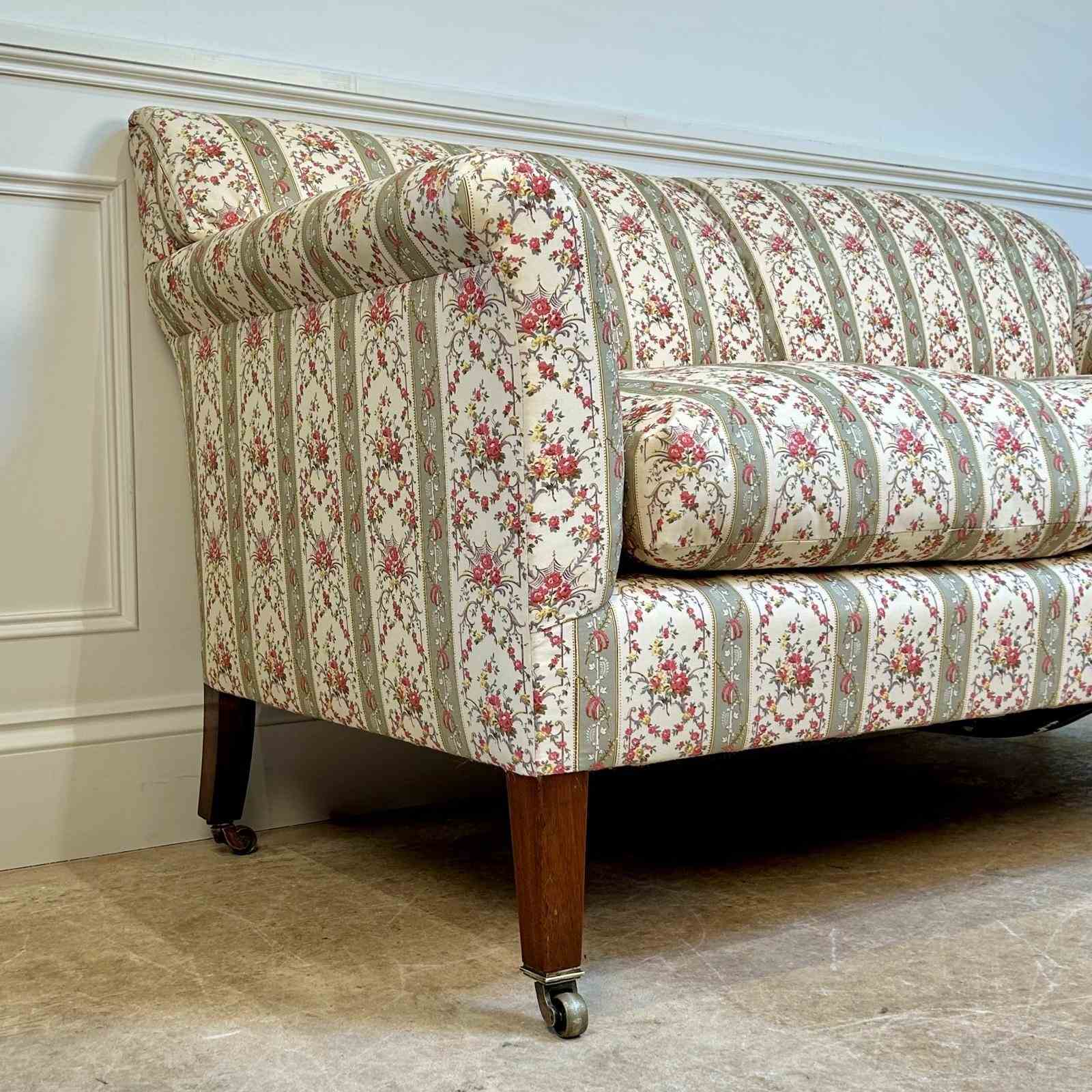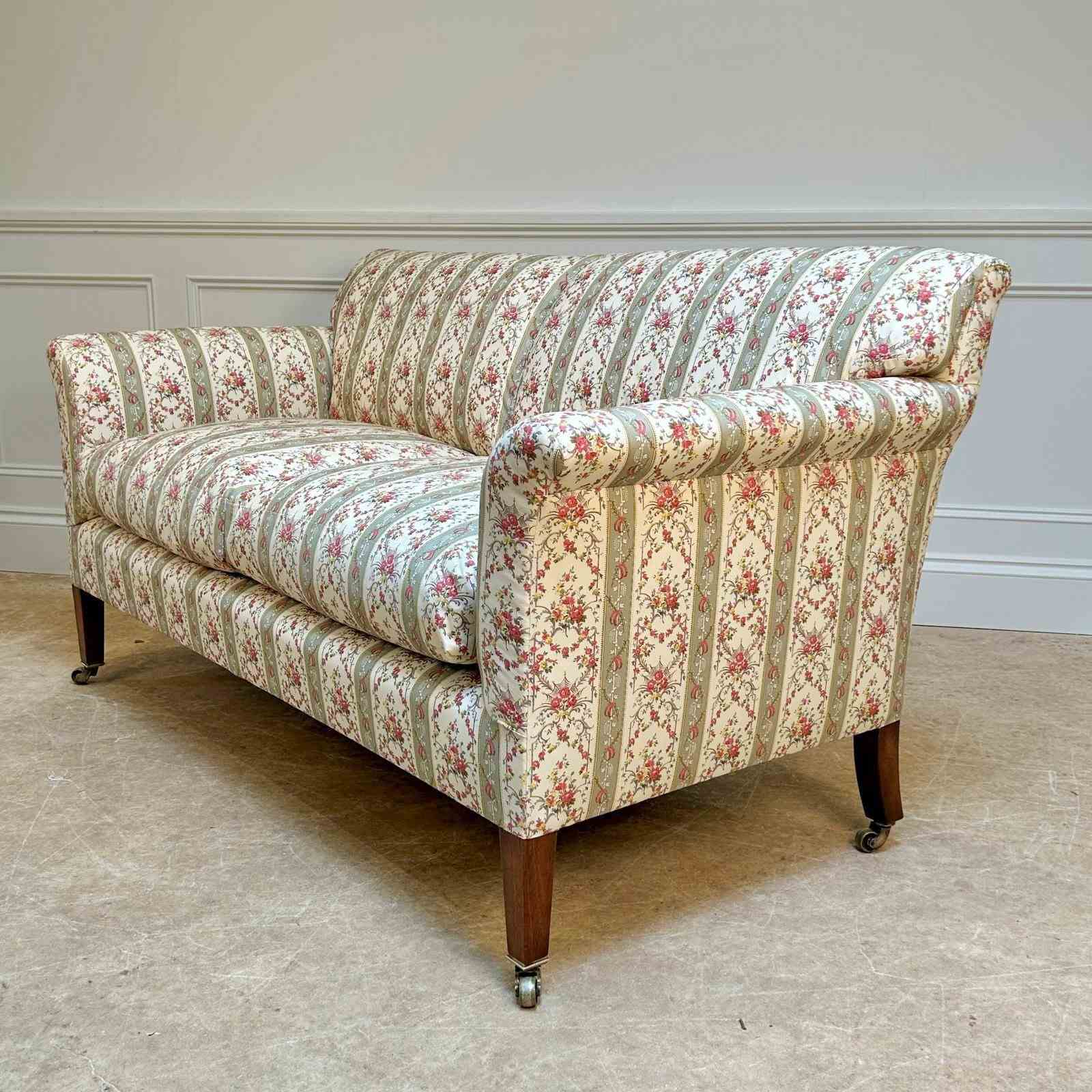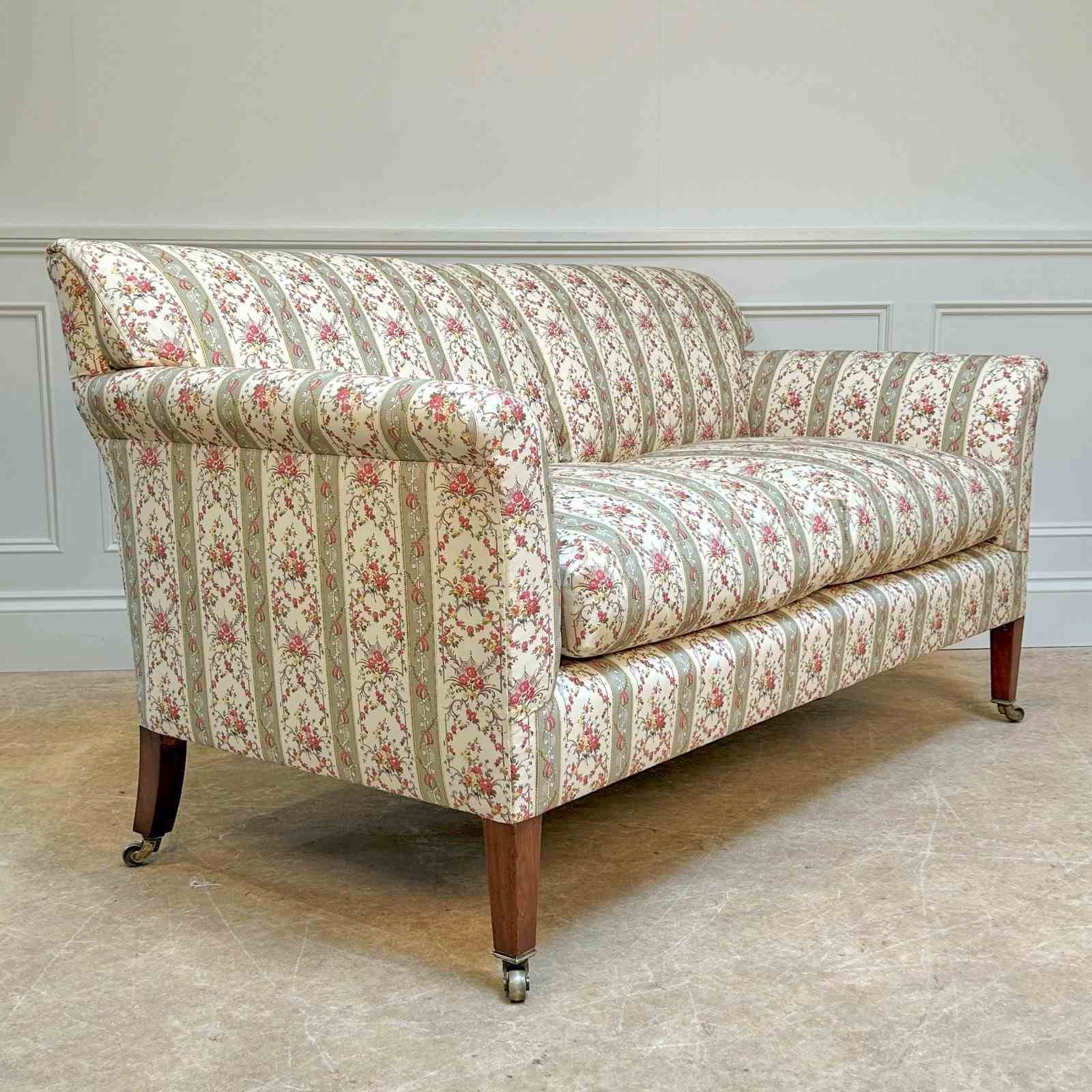 A small and perfectly proportioned Howard & Sons sofa. Having the original horsehair and Siege de Duvet feather and down cushions to both the back and seat. The whole raised on walnut tapering legs with the original brass lacquered stamped H & S castors. The back leg numbered and stamped "Howard & Sons Ltd, Berners St, London". Superb condition throughout, recently re-upholstered in our Howard & Sons ticking. English, Circa 1910.