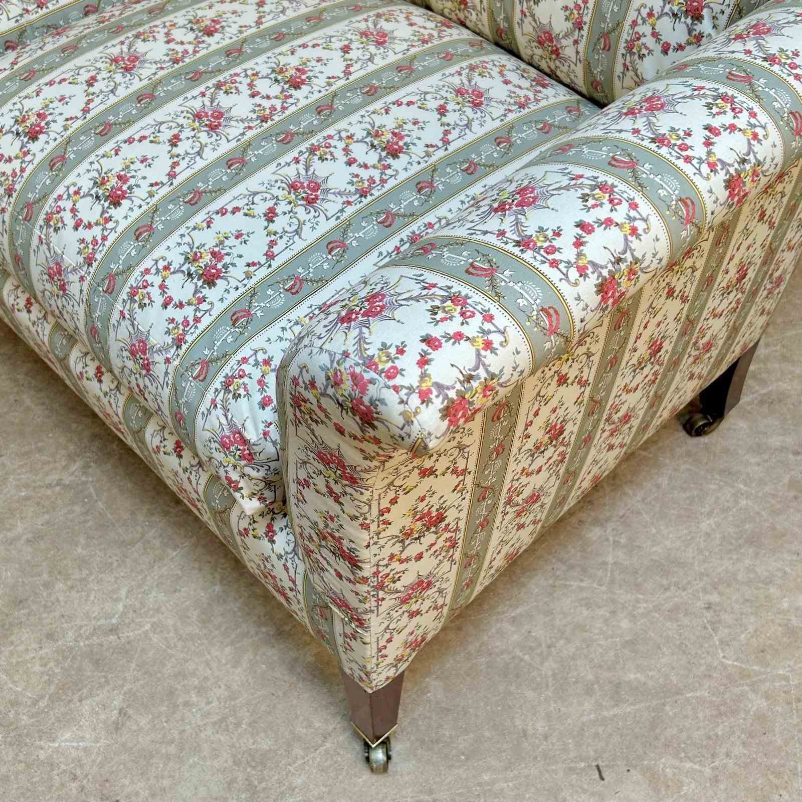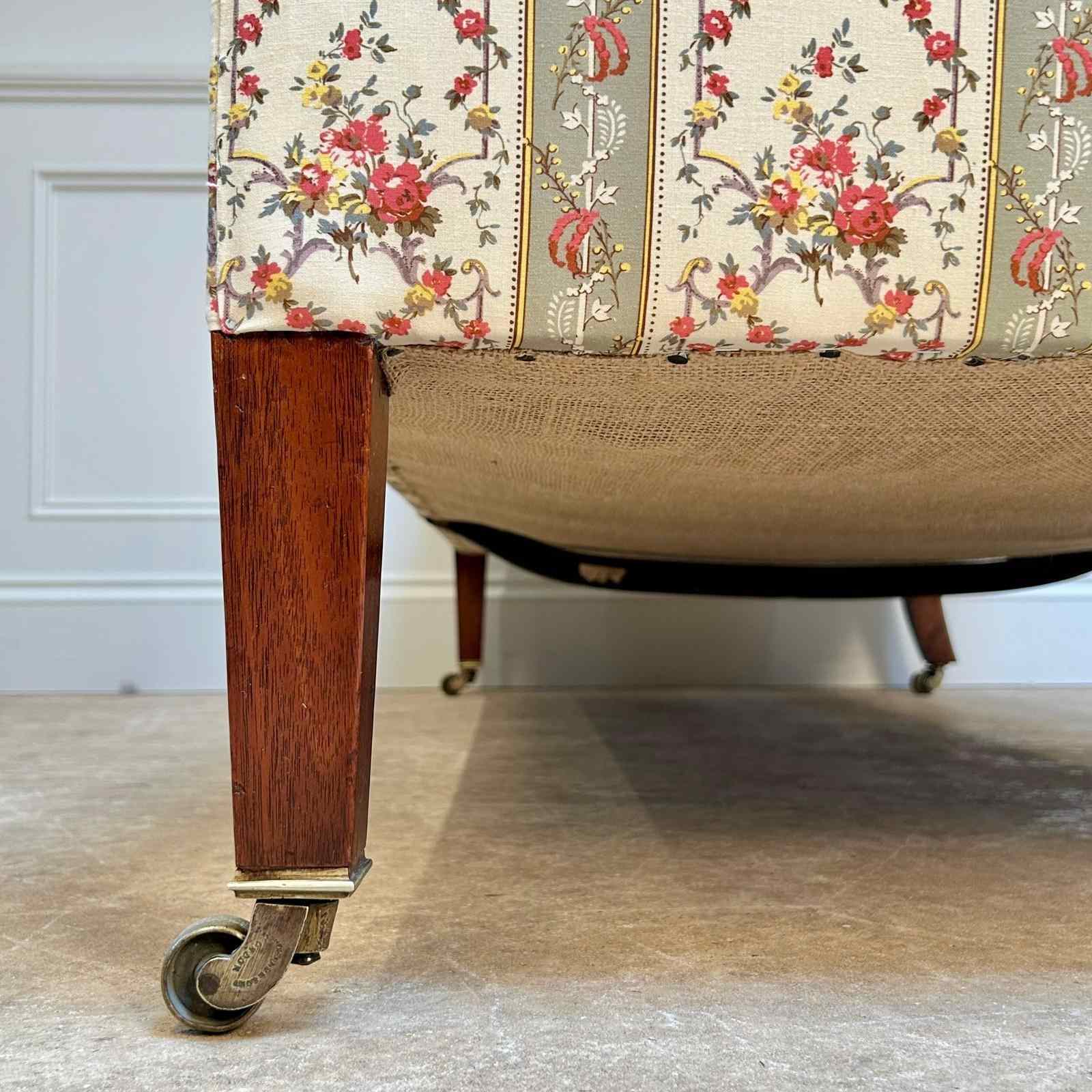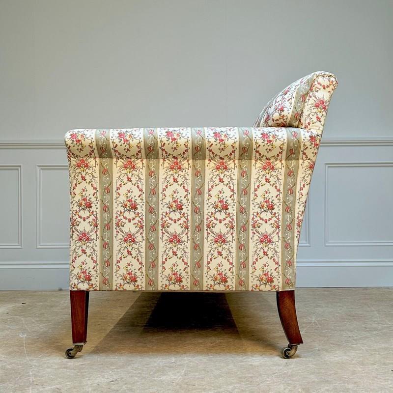 A small and perfectly proportioned Howard & Sons sofa. Having the original horsehair and Siege de Duvet feather and down cushions to both the back and seat. The whole raised on walnut tapering legs with the original brass lacquered stamped H & S castors. The back leg numbered and stamped "Howard & Sons Ltd, Berners St, London". Superb condition throughout, recently re-upholstered in our Howard & Sons ticking. English, Circa 1910.