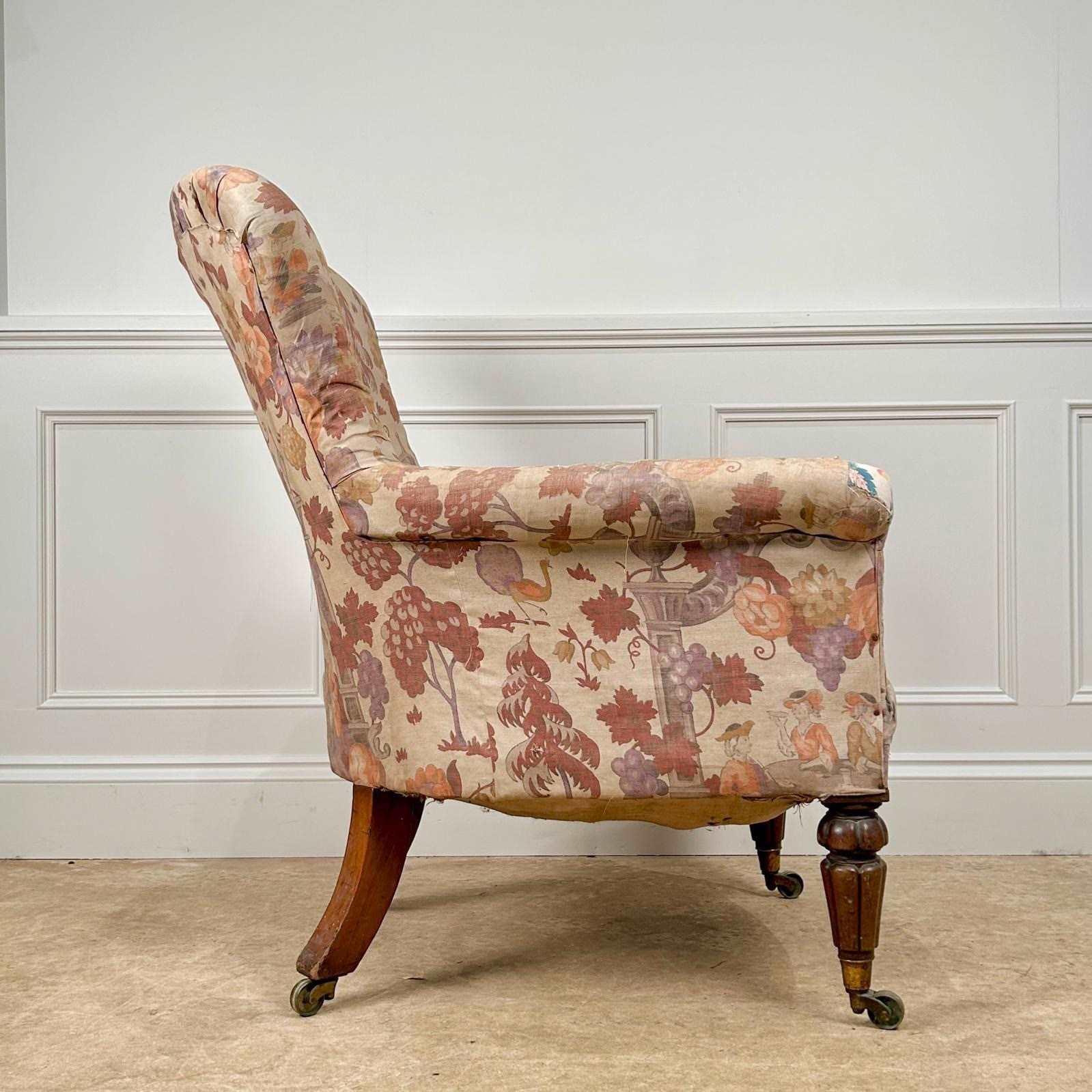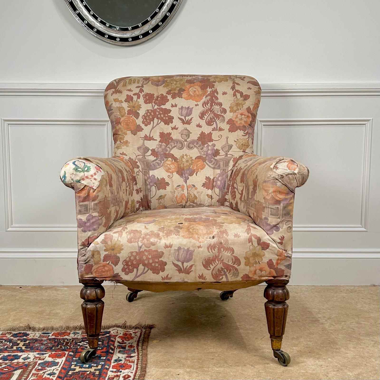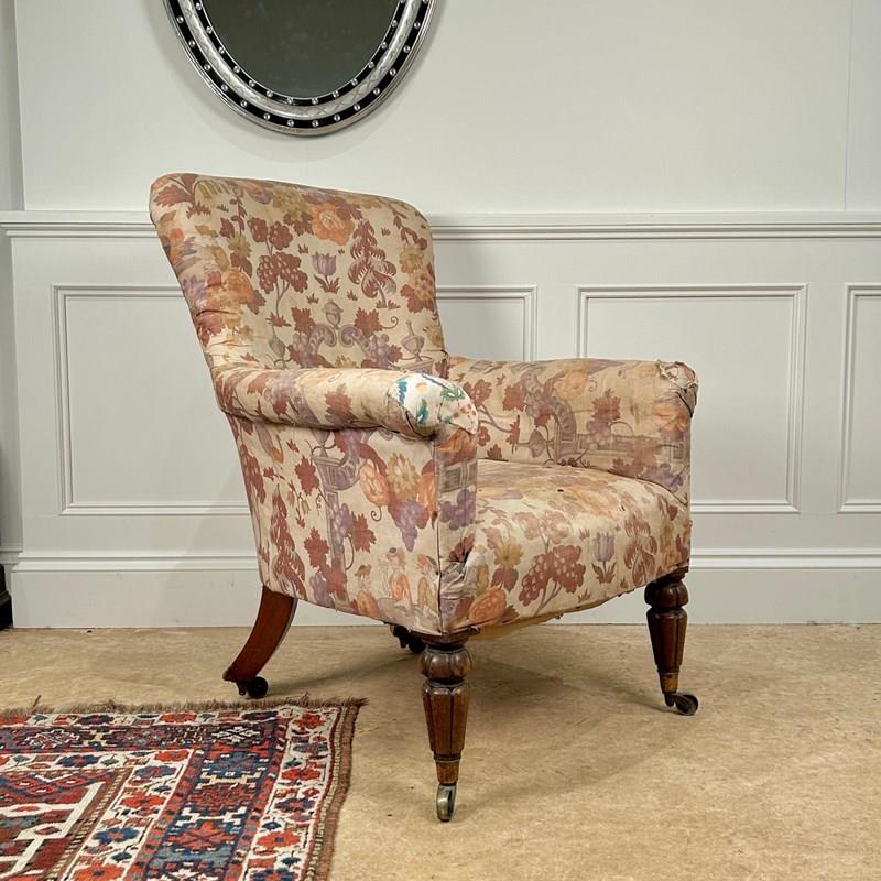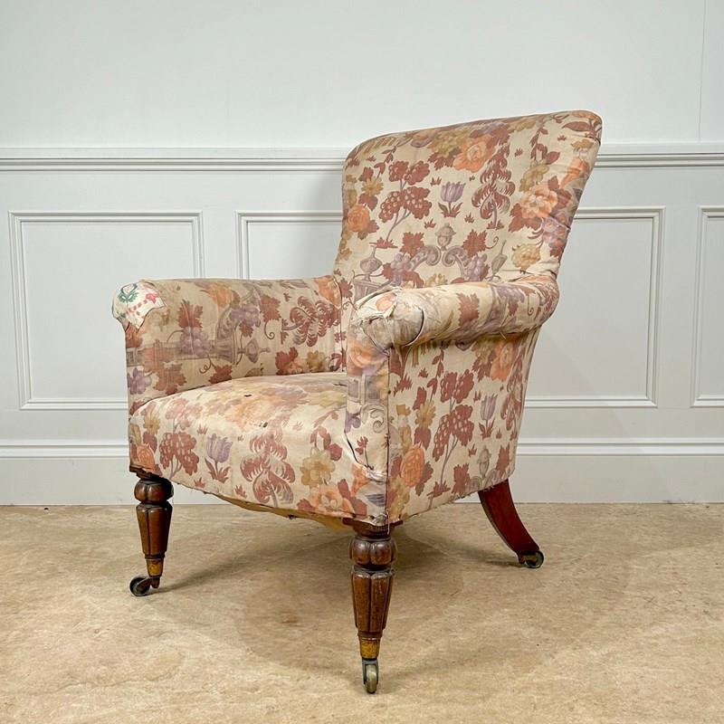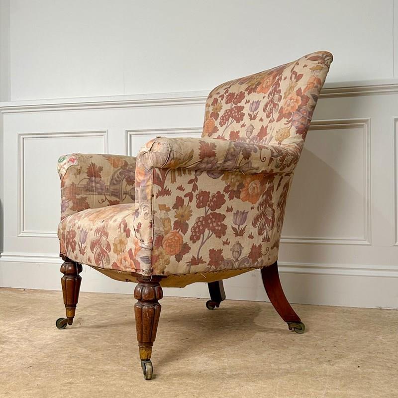 A William IV mahogany country house armchair, raised on bulbous reeded legs with original gilt lacquered brass castors, having a sprung seat and retaining the original horsehair. A beautifully drawn chair with a strong frame, for re-upholstery. English, Circa 1830.