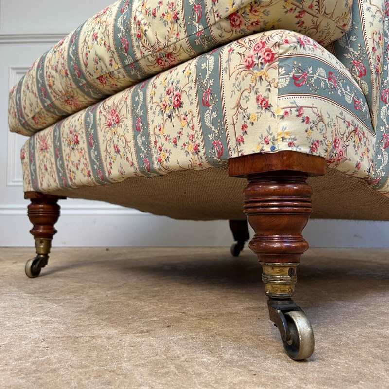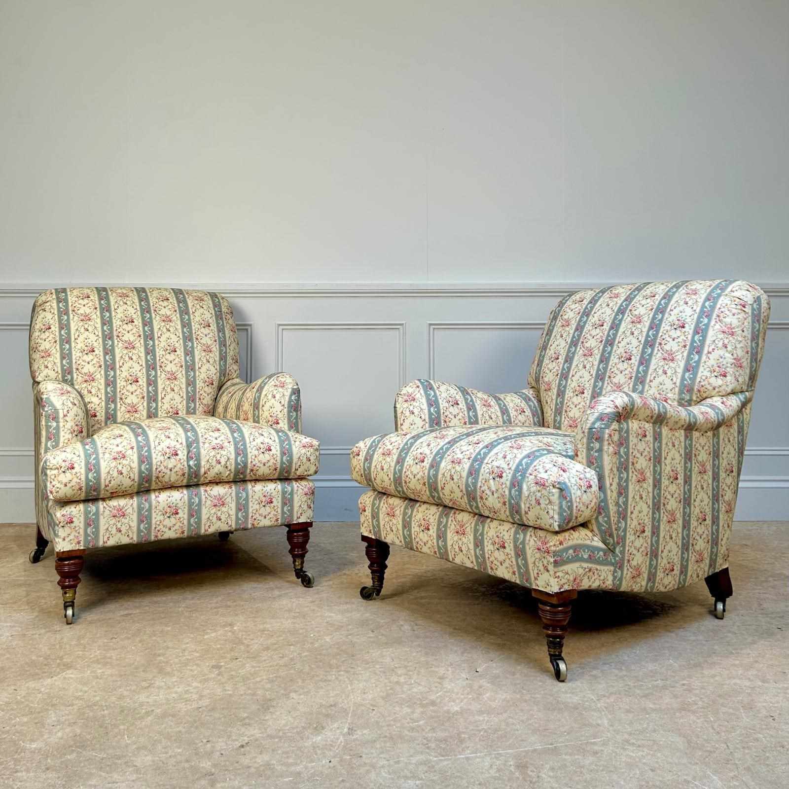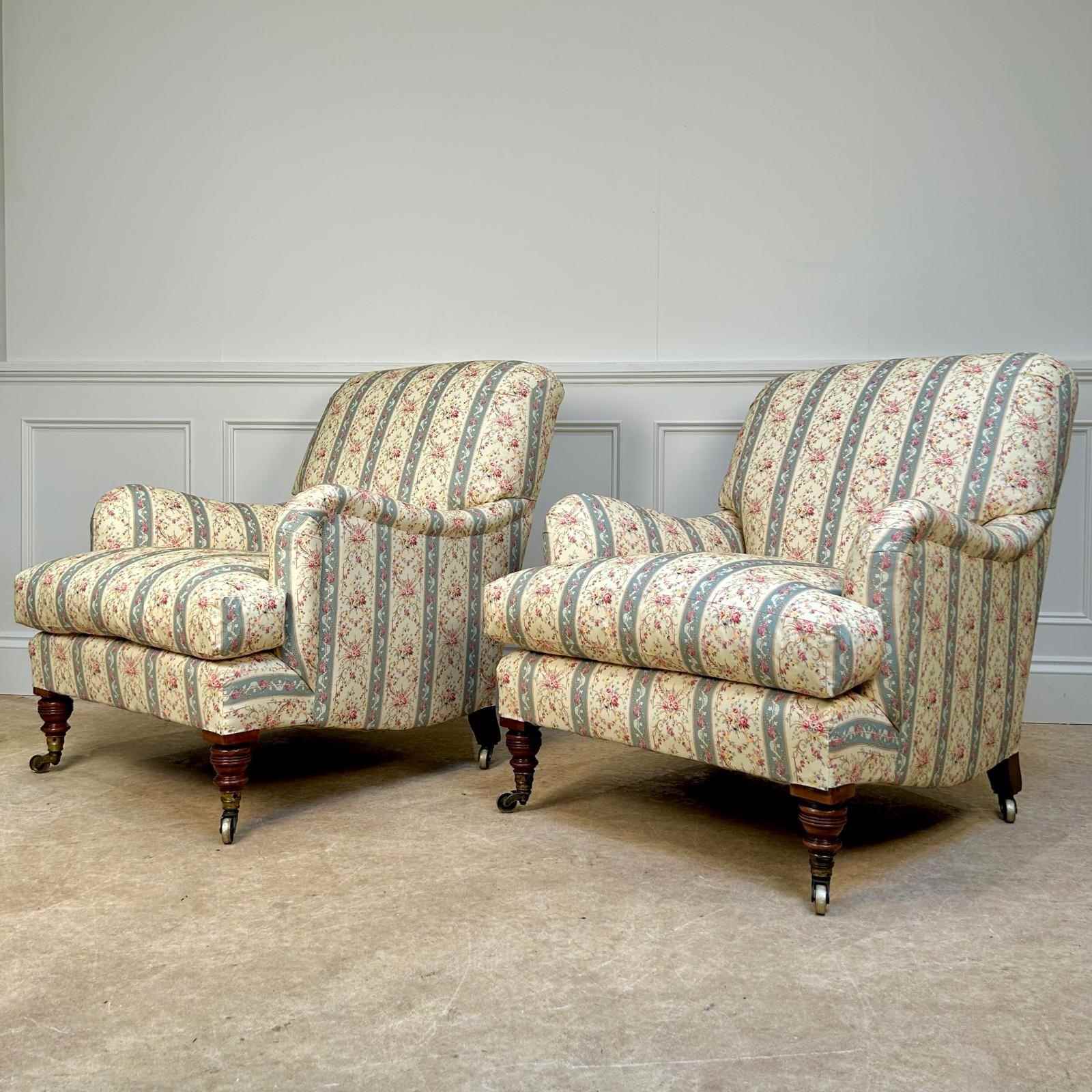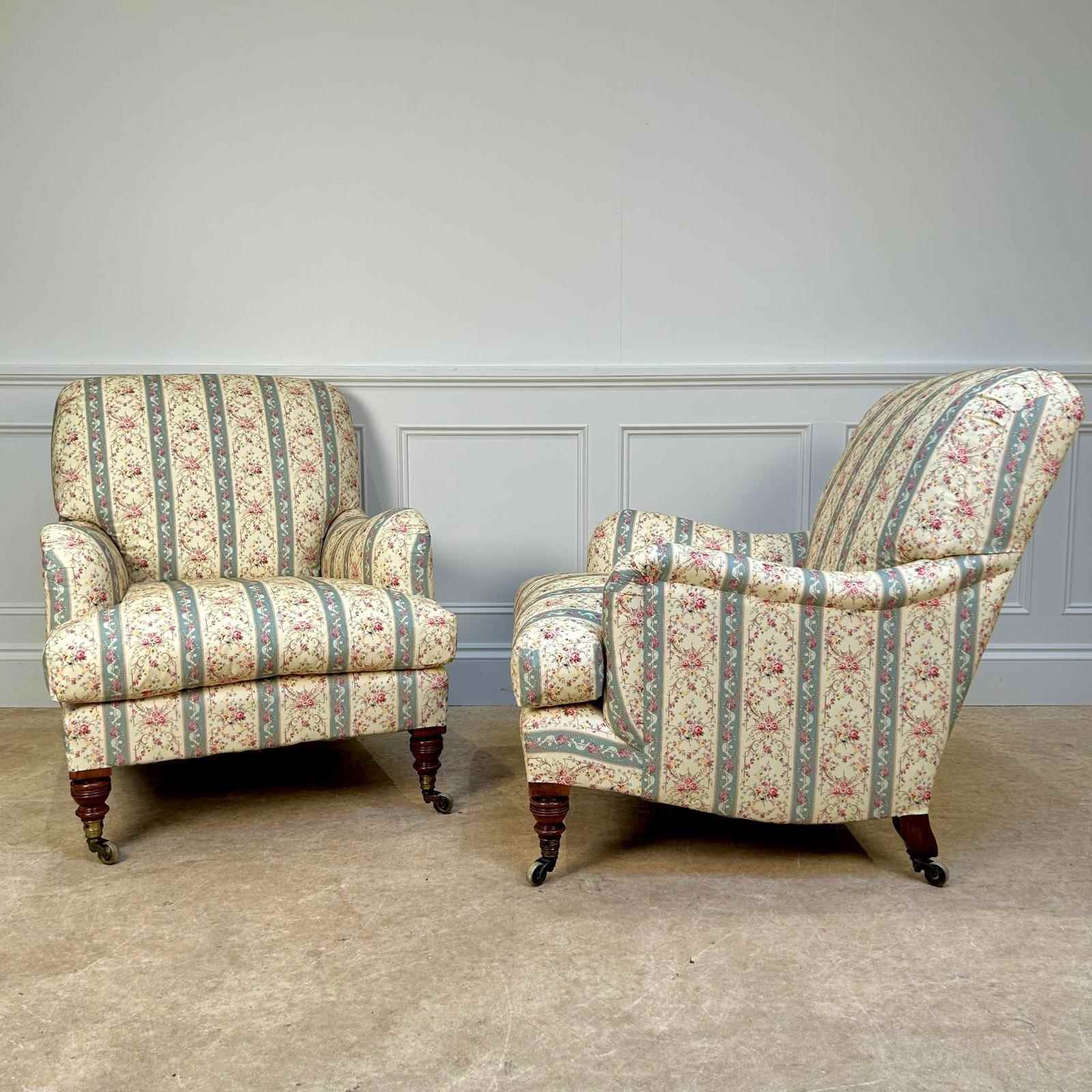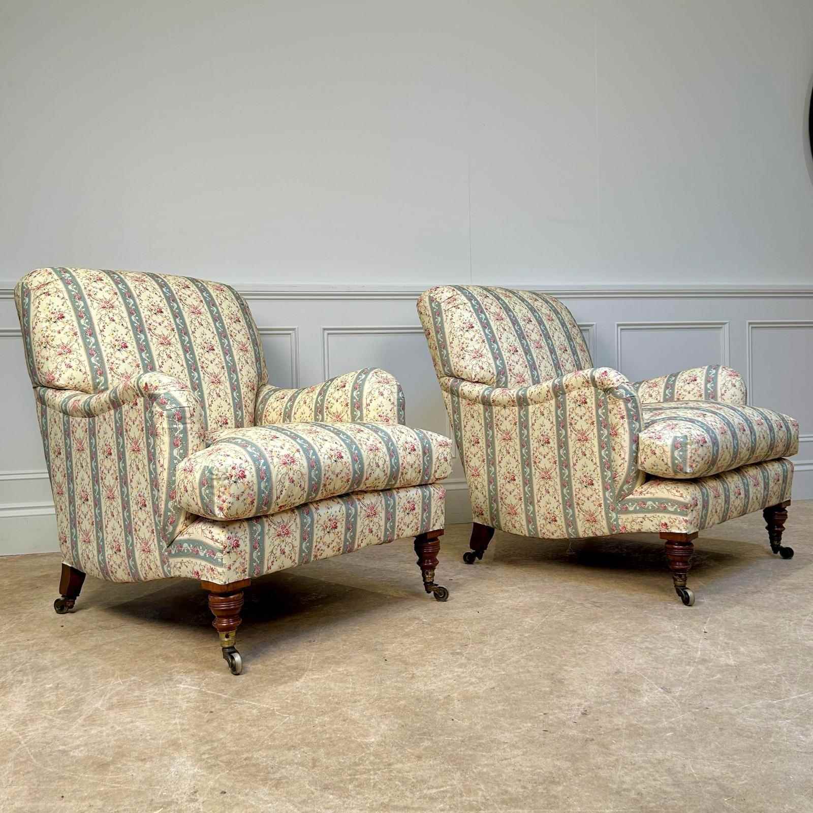 A true pair of Howard & Sons Bridgewater armchairs. Having sprung seats with the wonderful Sierge de Duvet and sprung backs. The seats retaining the original feather and down seat cushions and the whole raised on walnut ring turned legs. Retaining the original stamped gilt lacquered brass castors and stamped "Howard & Sons Ltd, Berners St" to the back leg. These chairs have been stripped back to the frame and re-built using traditional upholstery methods. Retaining all the original horsehair and feather, re-covered in Howard & Sons ticking,. A superb example of this iconic model. English, Circa 1900.