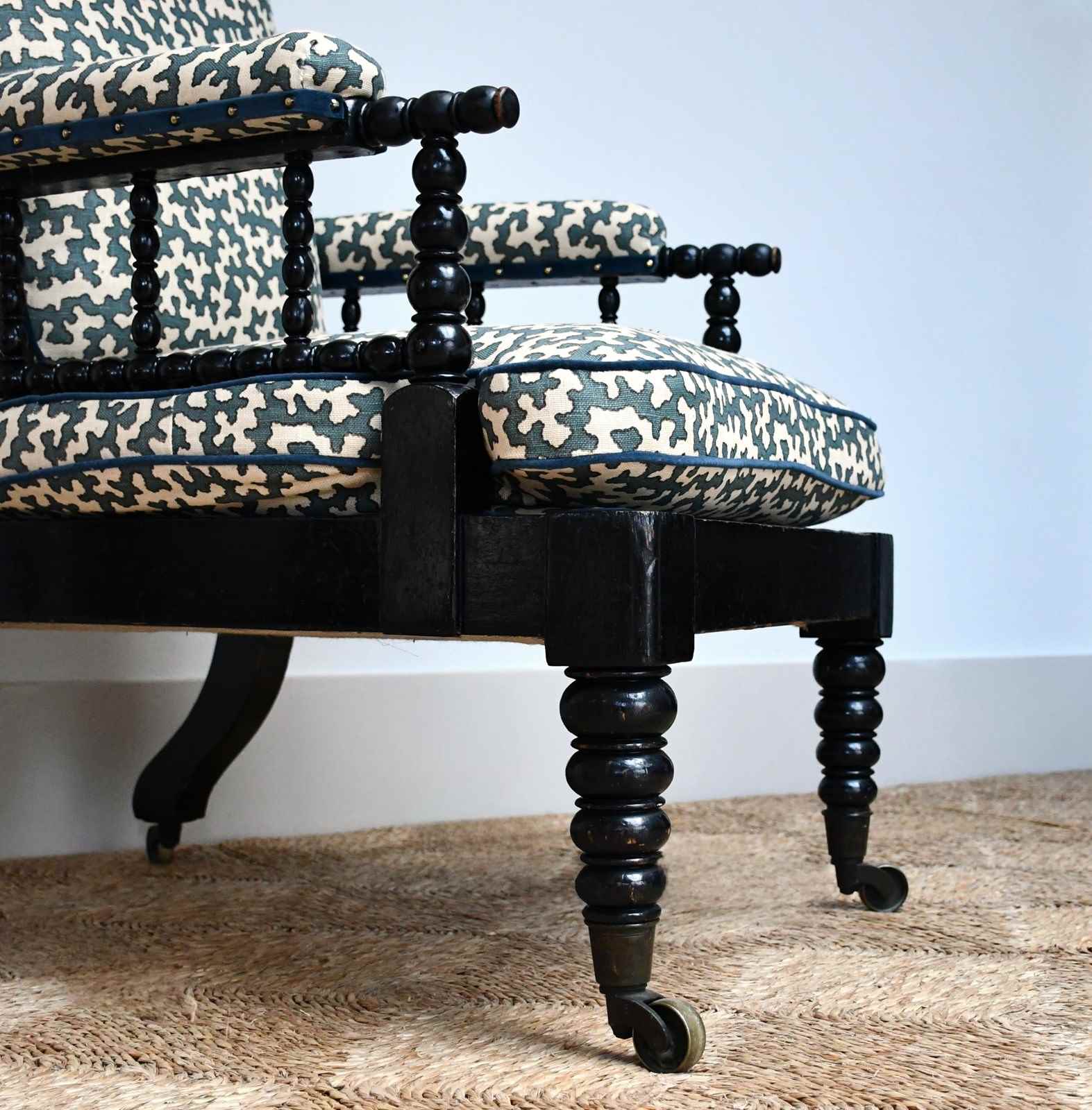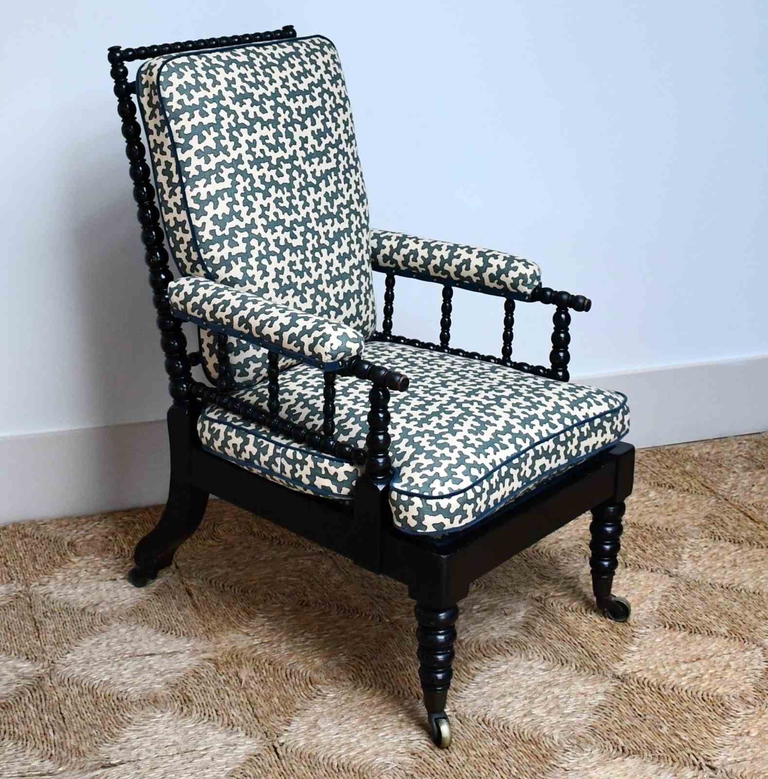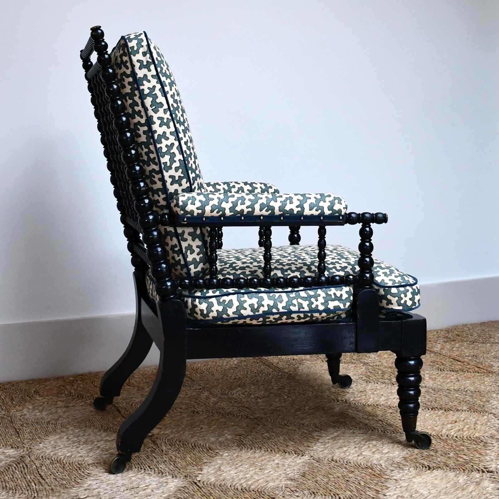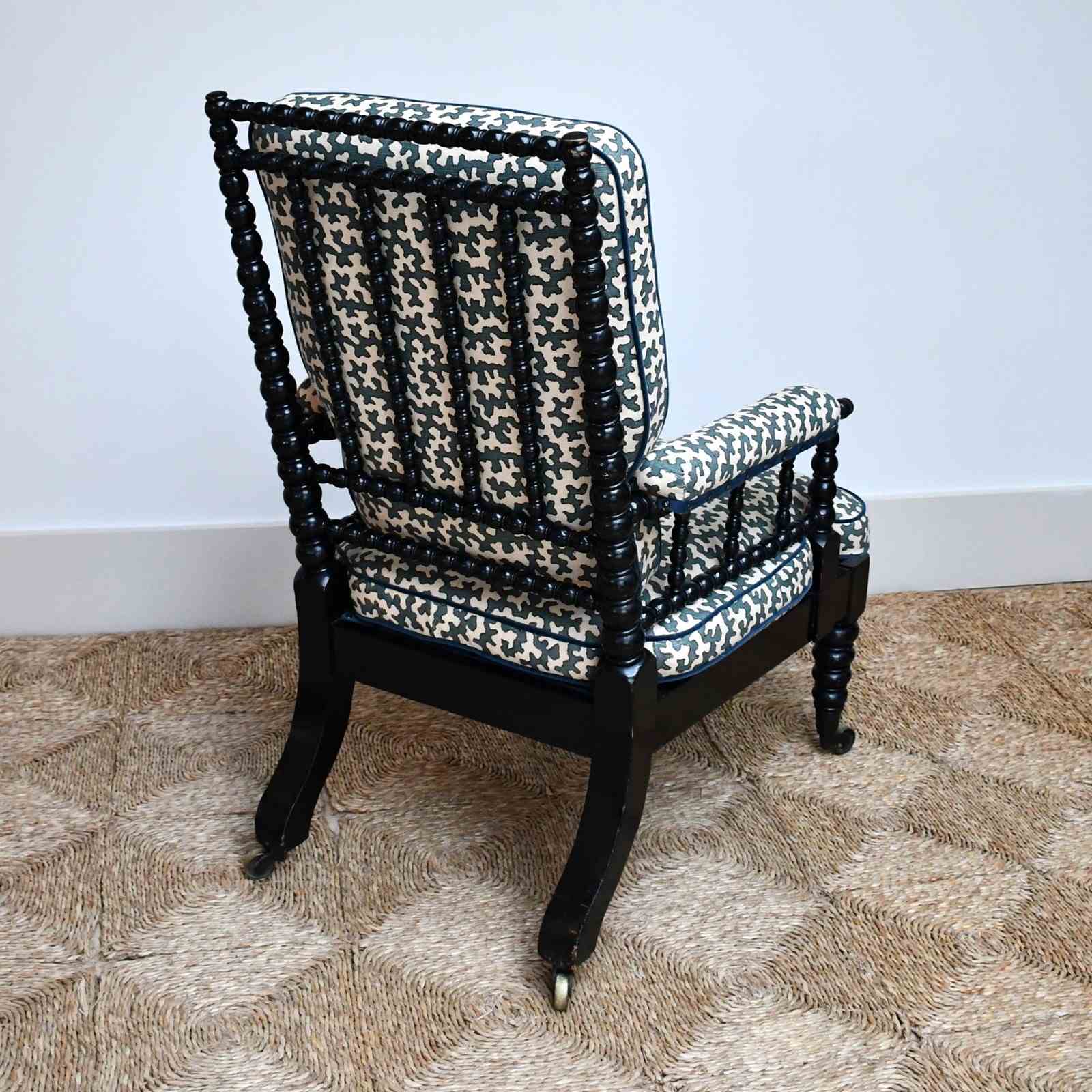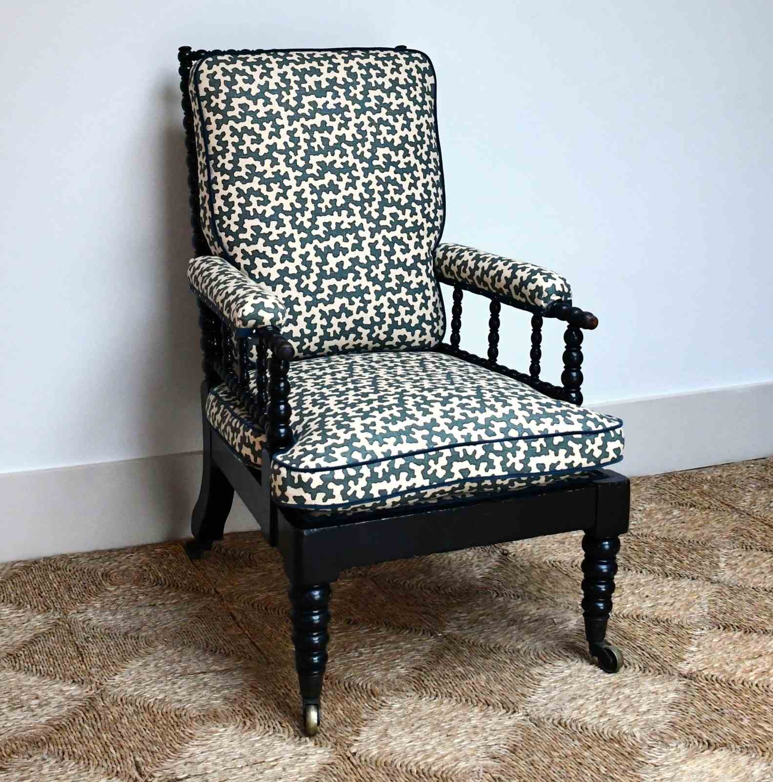 Victorian armchair of bobbin turned form, displaying an ebonised finish raised on brass castors.
