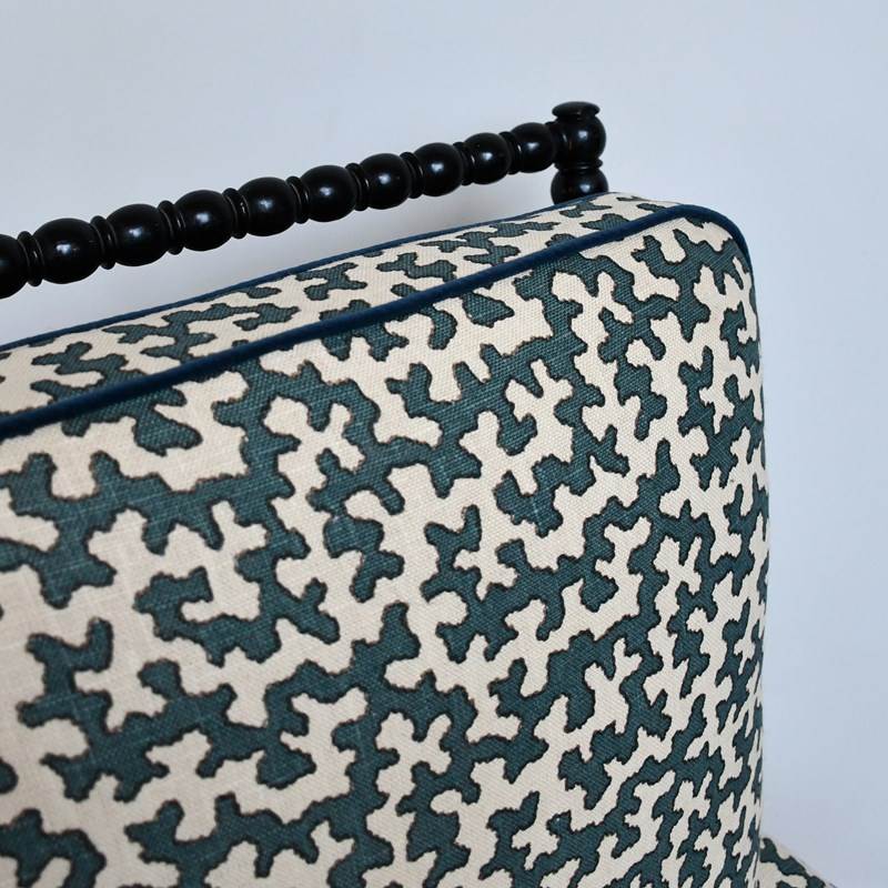 Newly upholstered in Colefax and Fowler - Squiggle fabric with navy velvet piping.