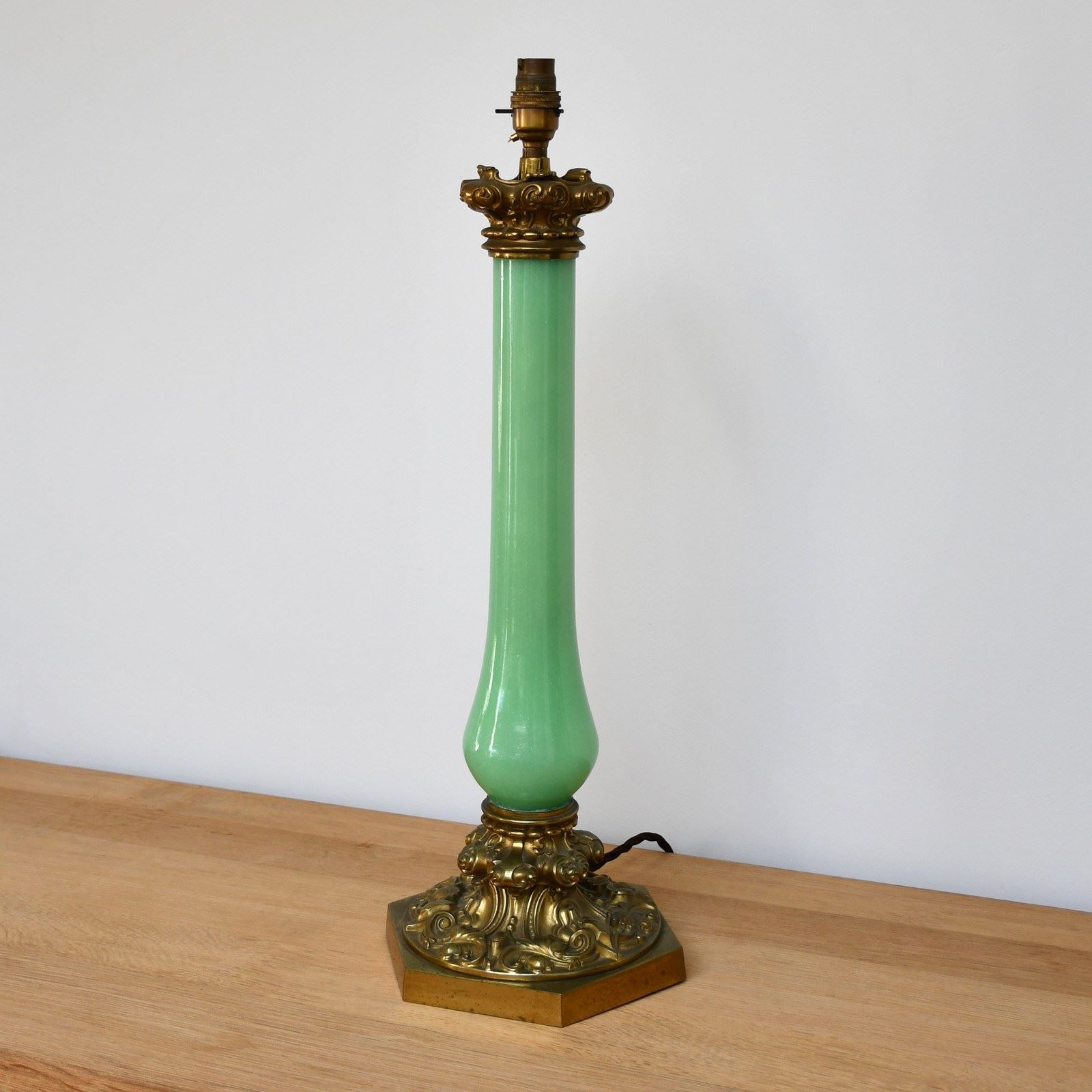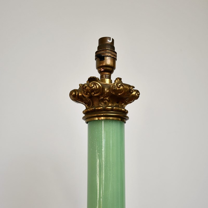 Beautiful apple green - opaline glass body with a decorative brass base and capital.