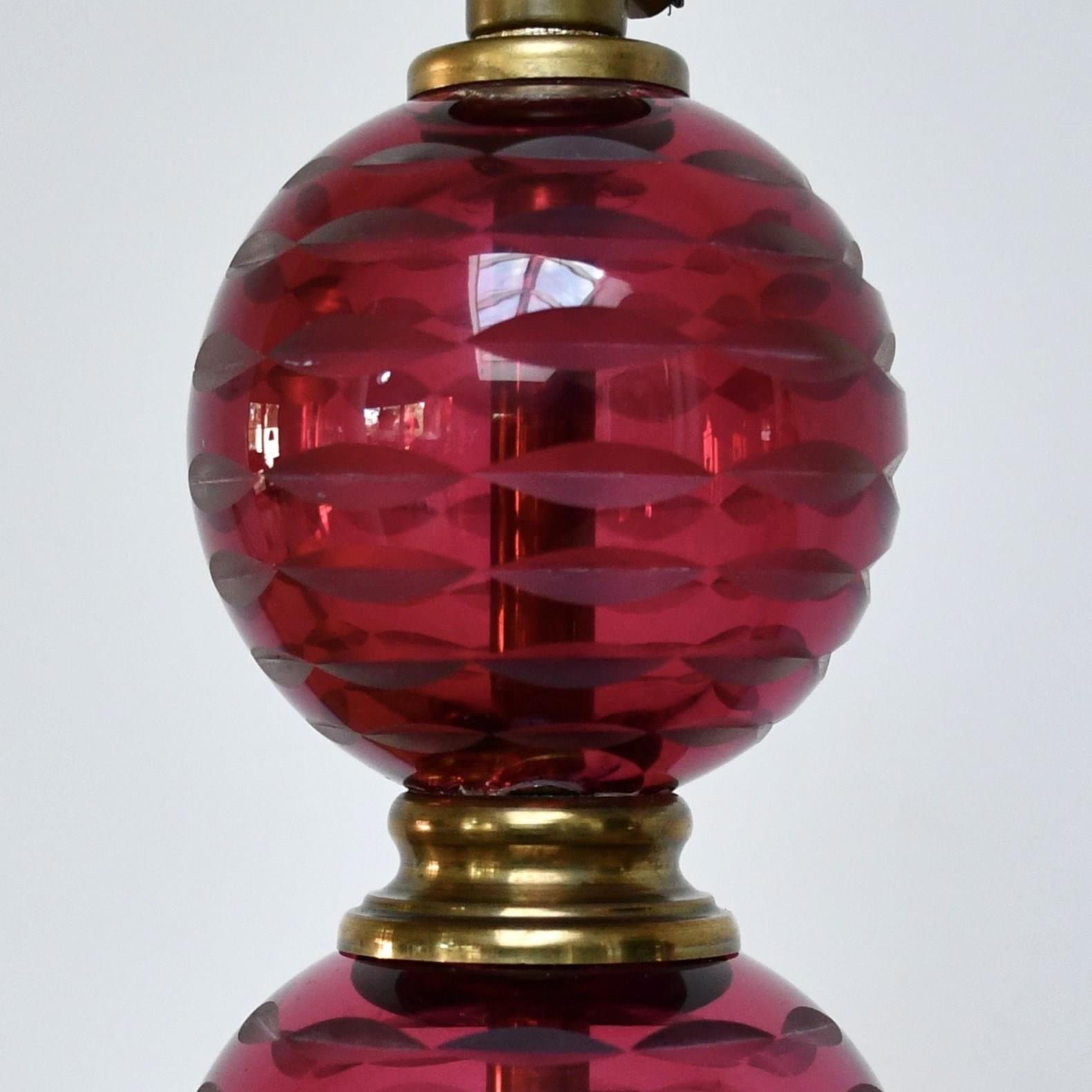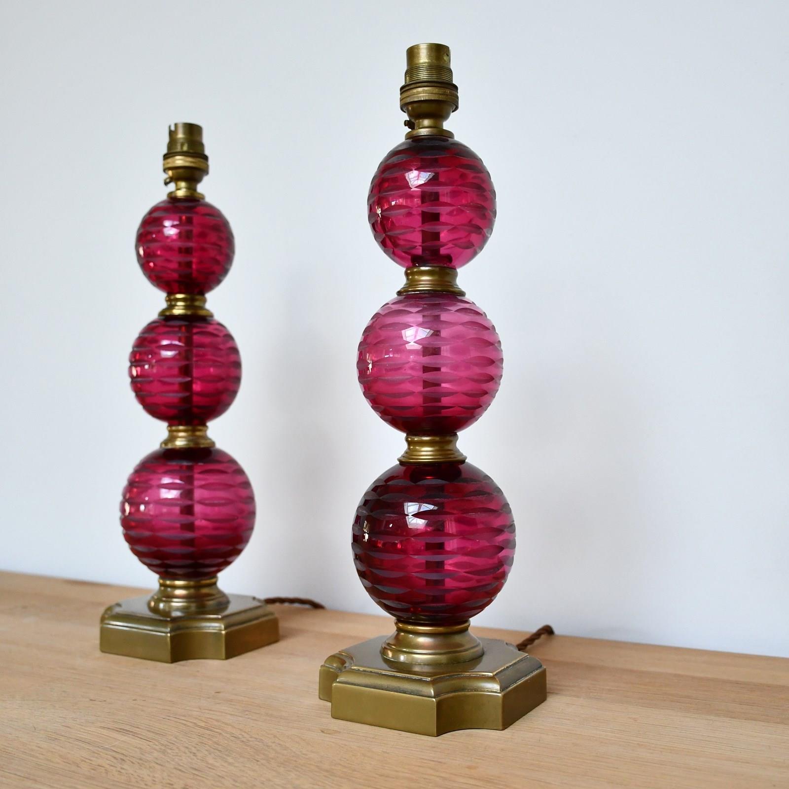 Cut glass, cranberry coloured ball formed table lamps with brass fittings.