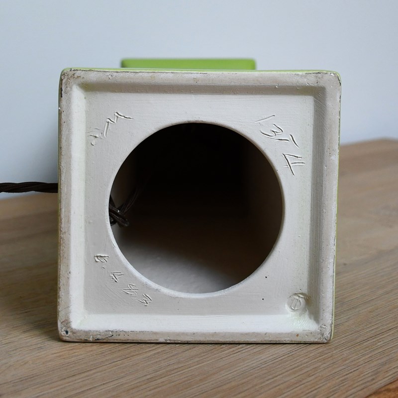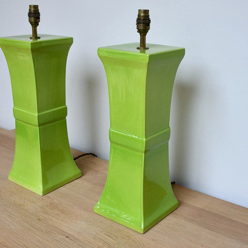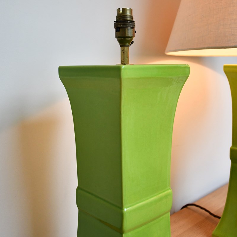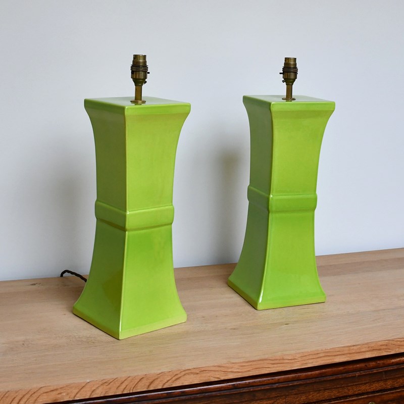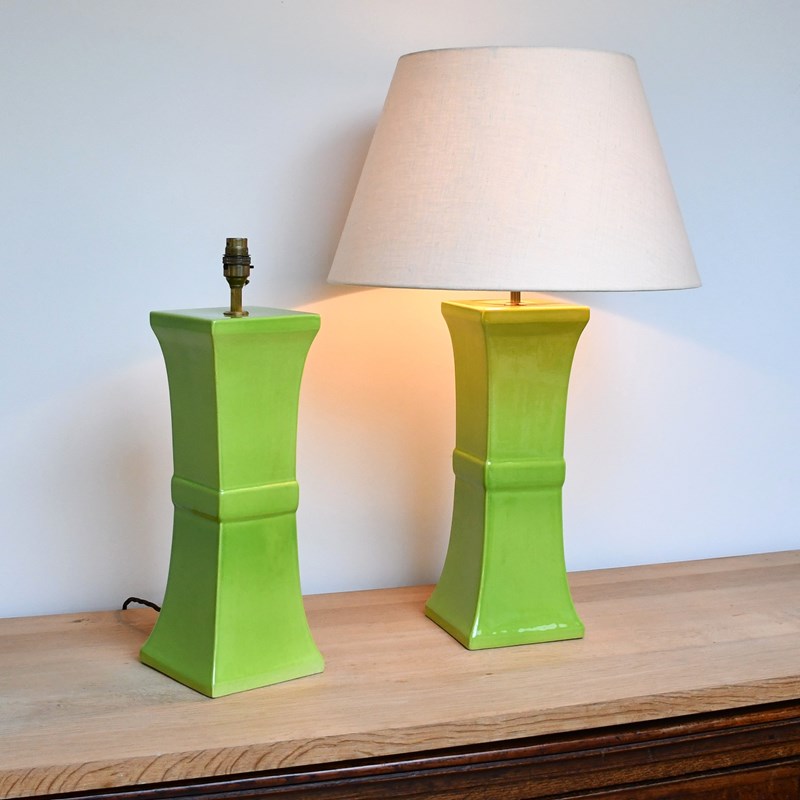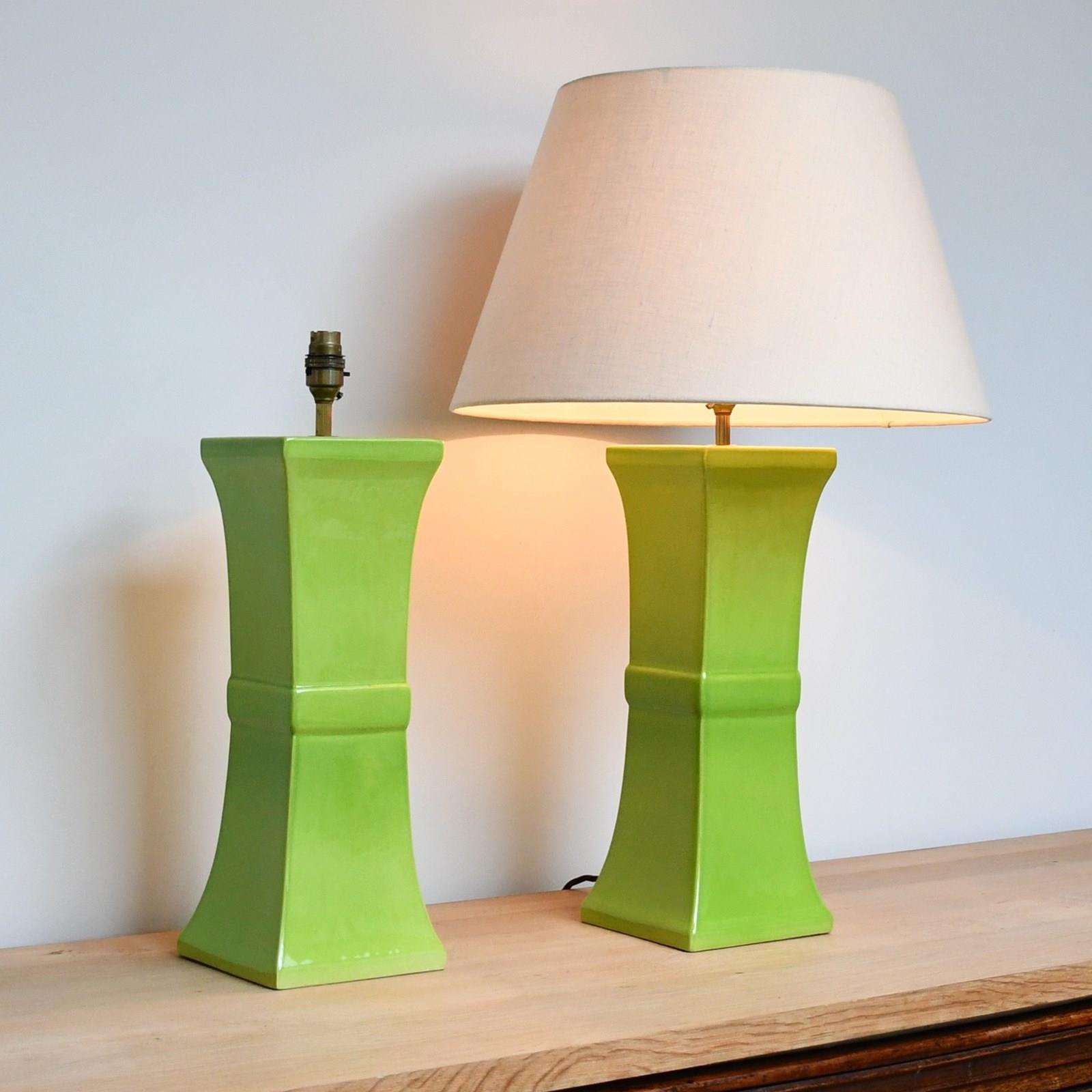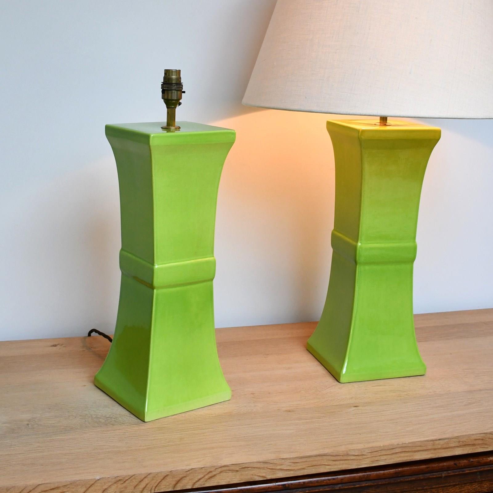 Wonderful apple green pottery lamps designed by David Hicks and made by Tingewick Pottery, both dated 1983 to the underside.