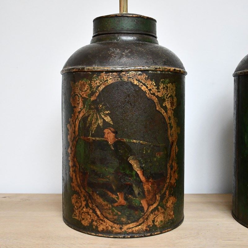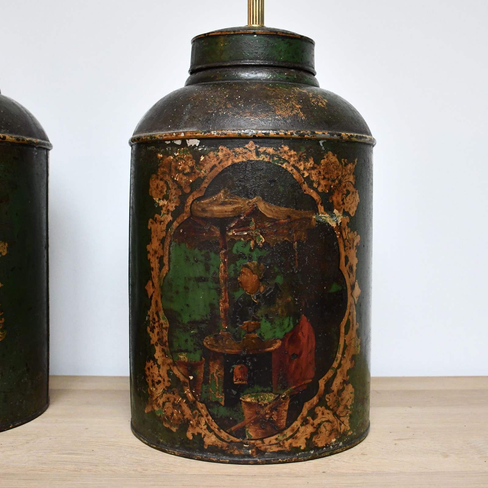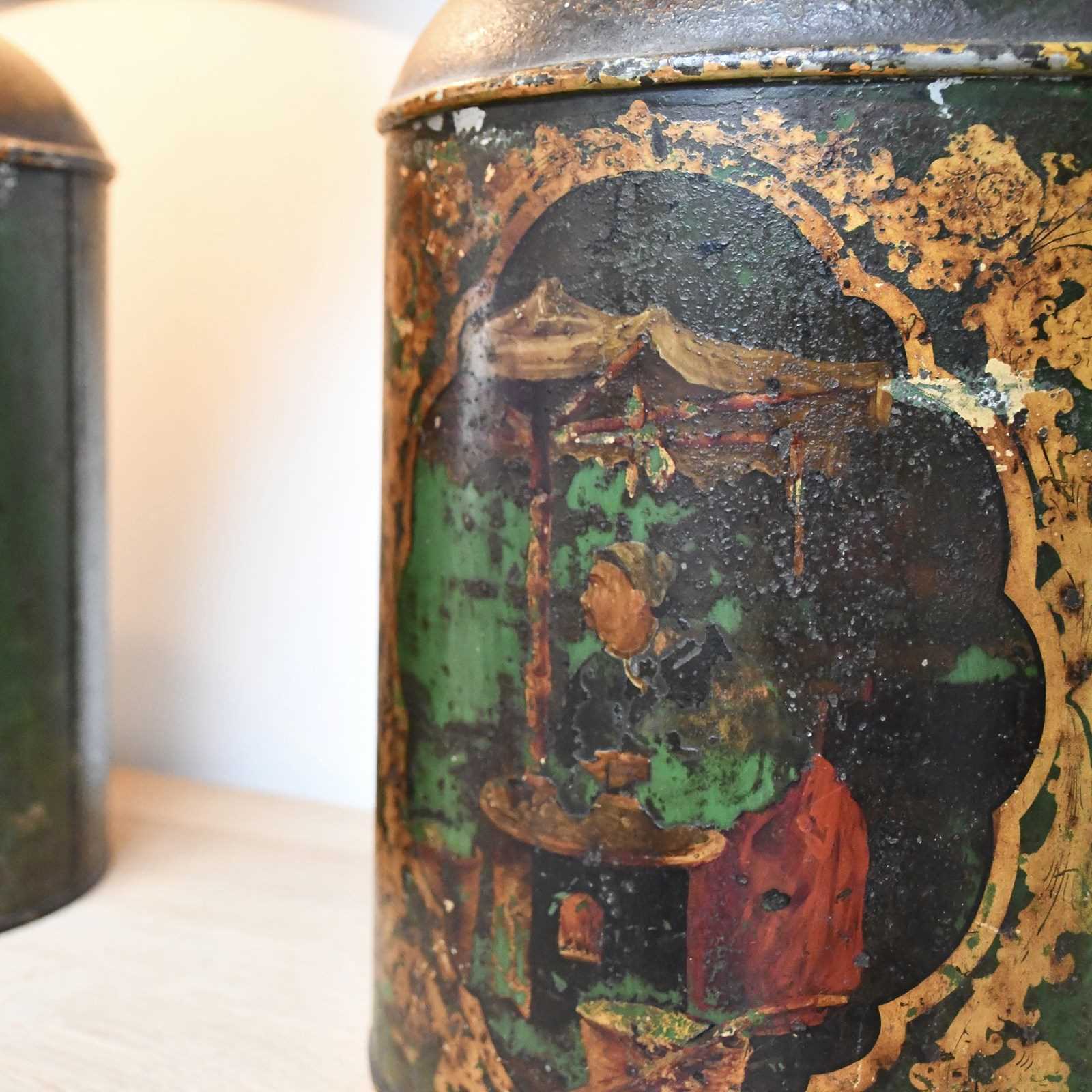 19th century green metal toleware - tea canisters of cylindrical form displaying gilded figurative oriental scenes.
