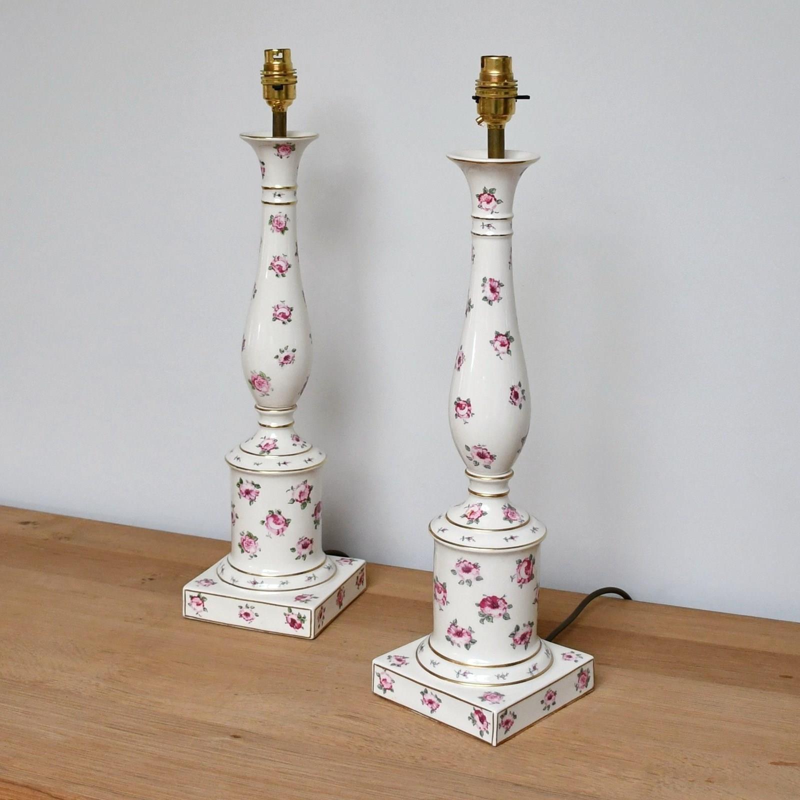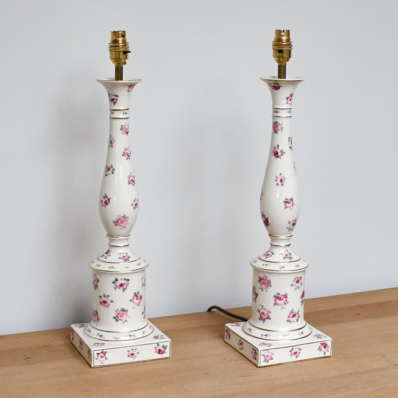 Vintage ceramic baluster column lamps, displaying decorative Rose decorations and gilt highlights.