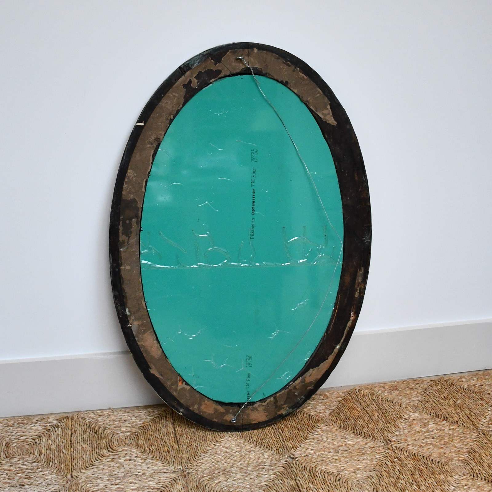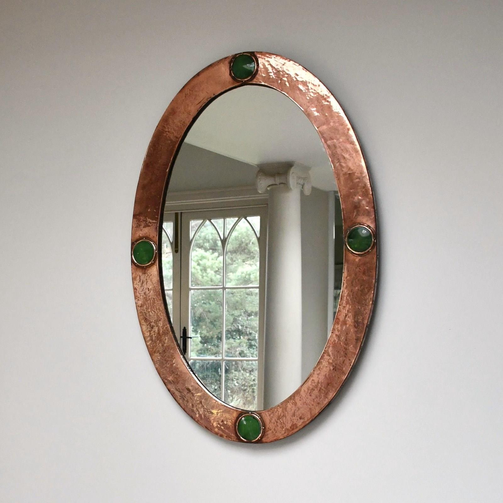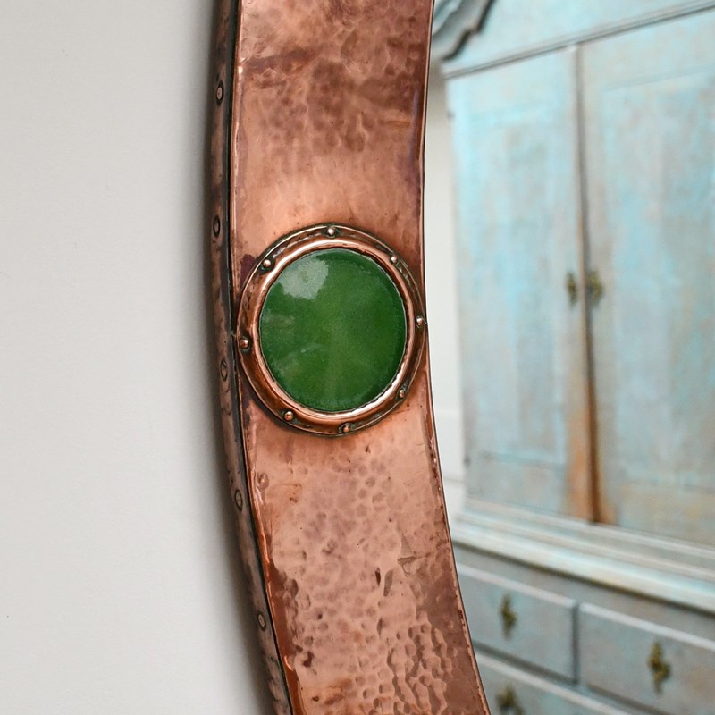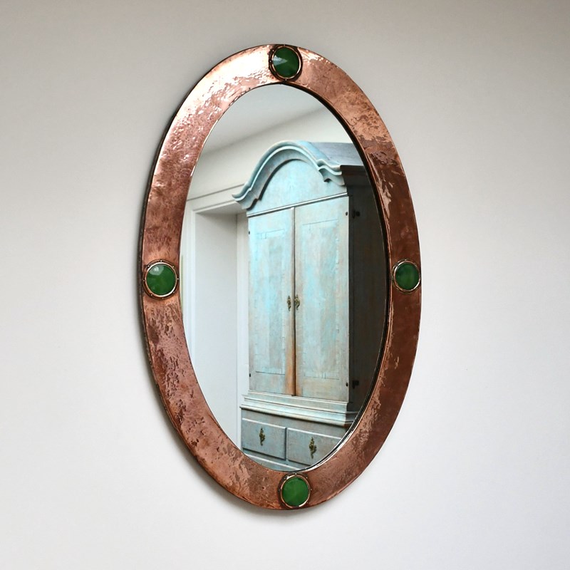 Large oval framed copper mirror, displaying a planished finish - inset with four green Ruskin pottery cabochons in the manner of Liberty & Co.