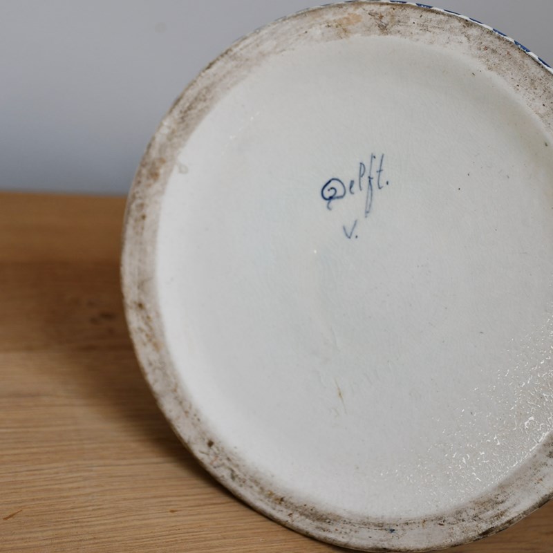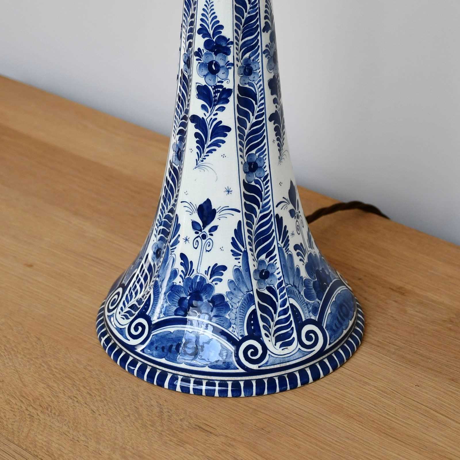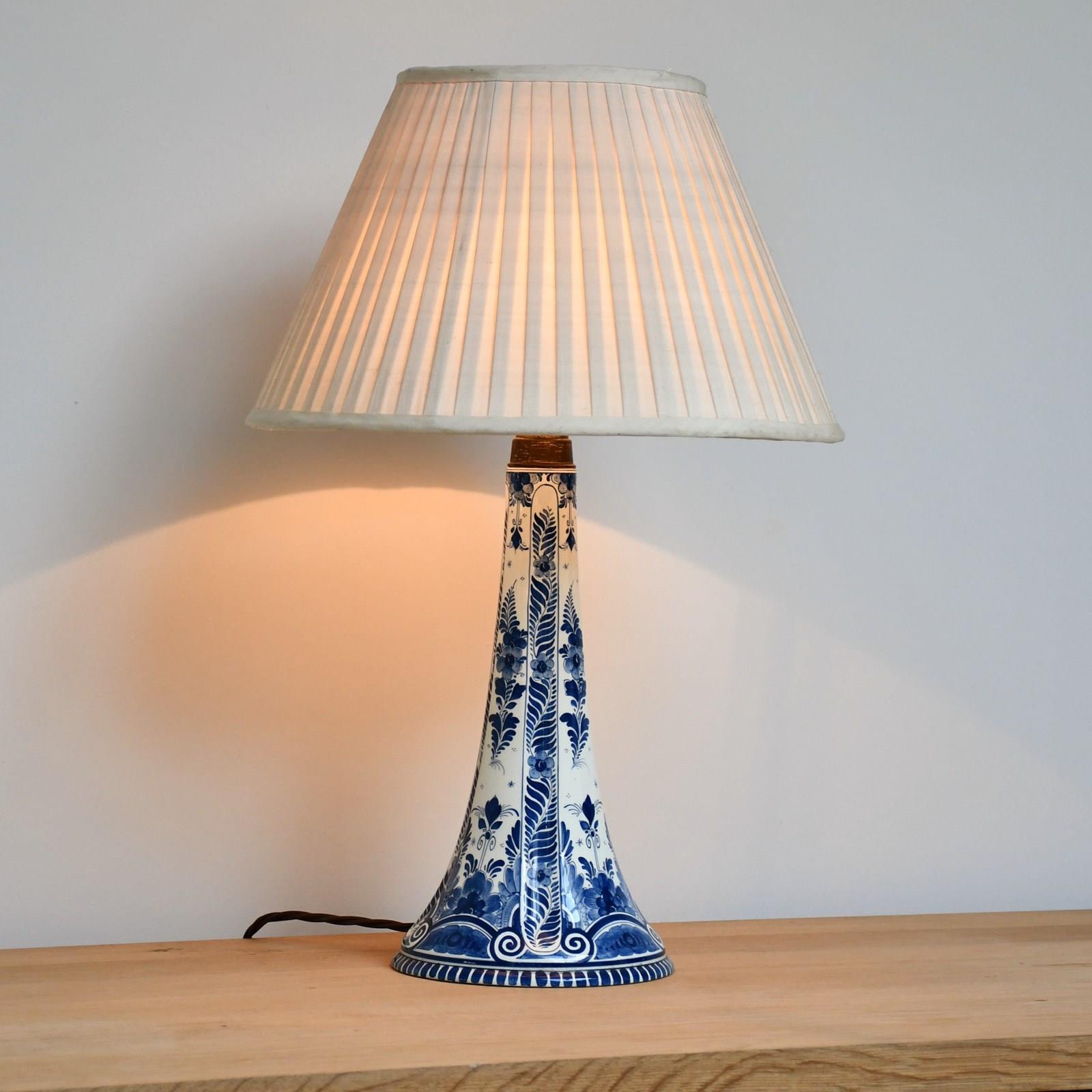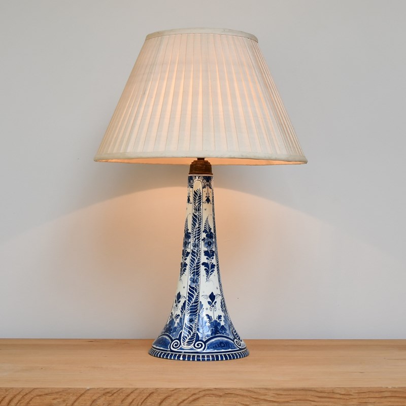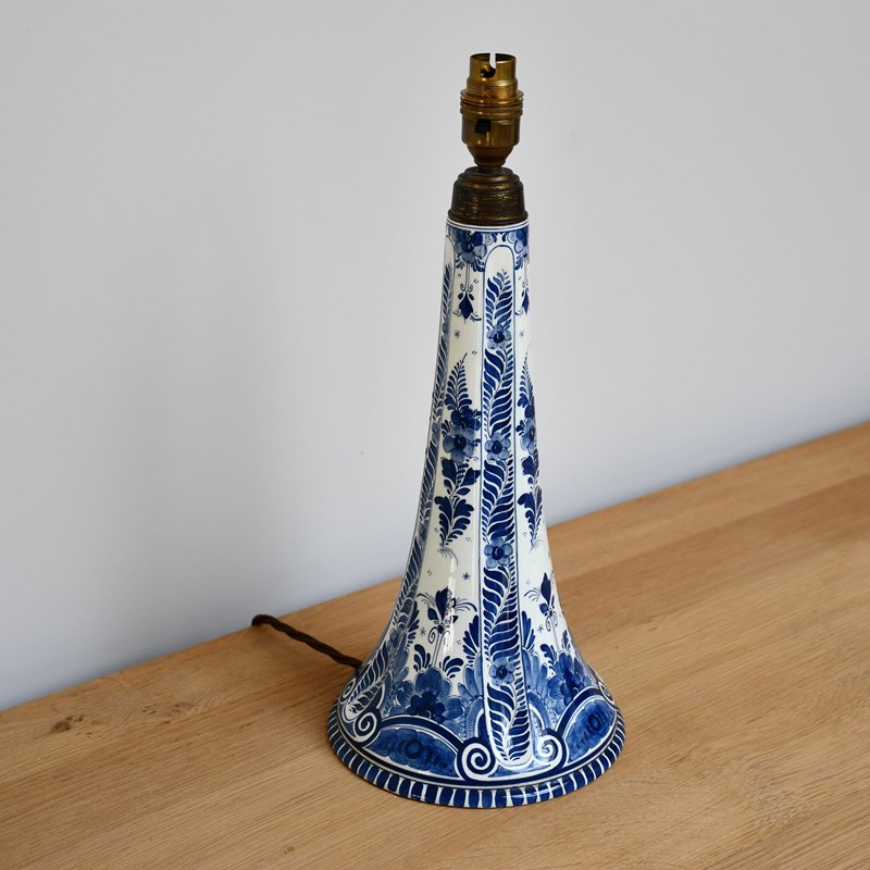 Elegant blue and white glazed - Delft pottery lamp of obelisk form with brass fittings.