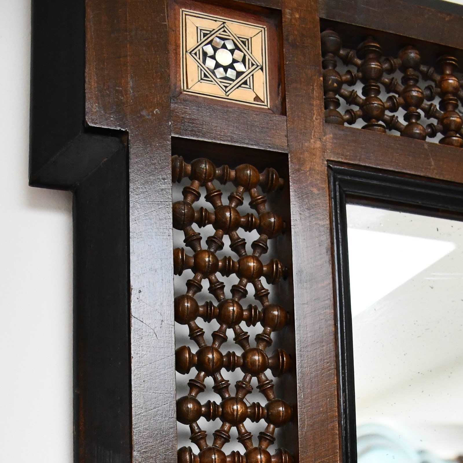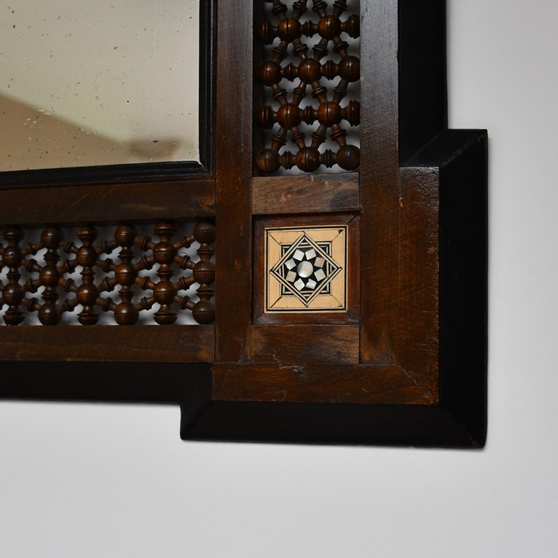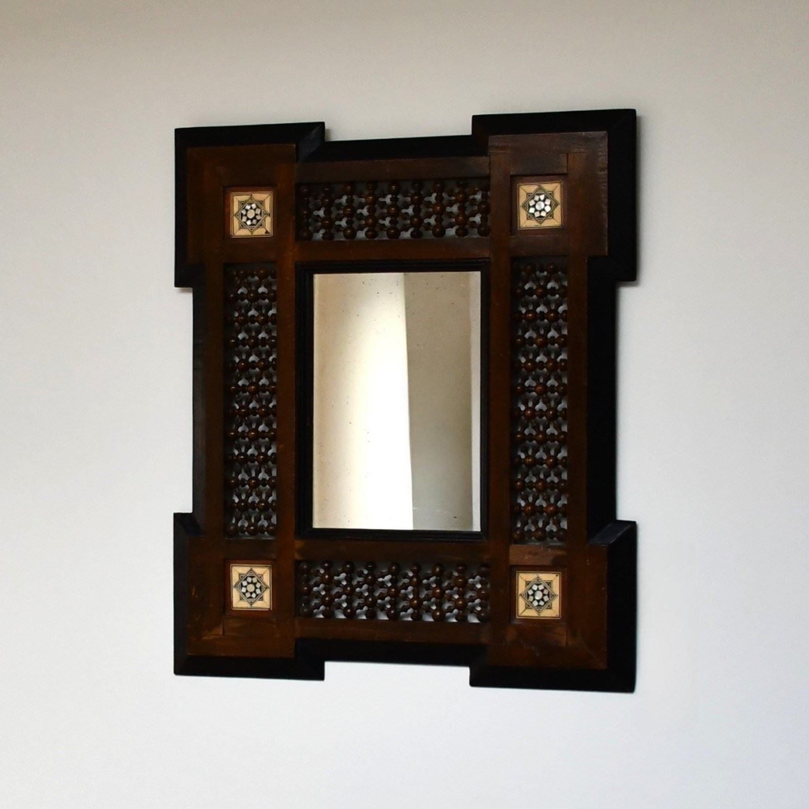 Displaying mashrabiya carved latticework panels with four decorative mother of pearl inlaid corner squares.