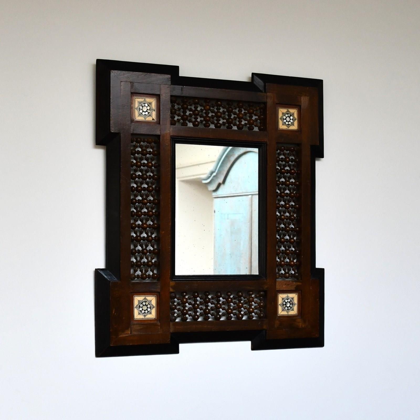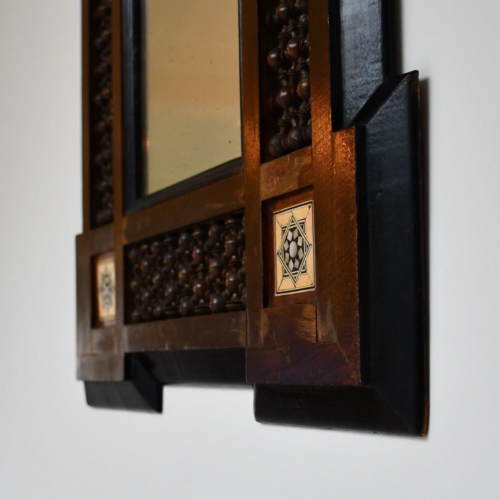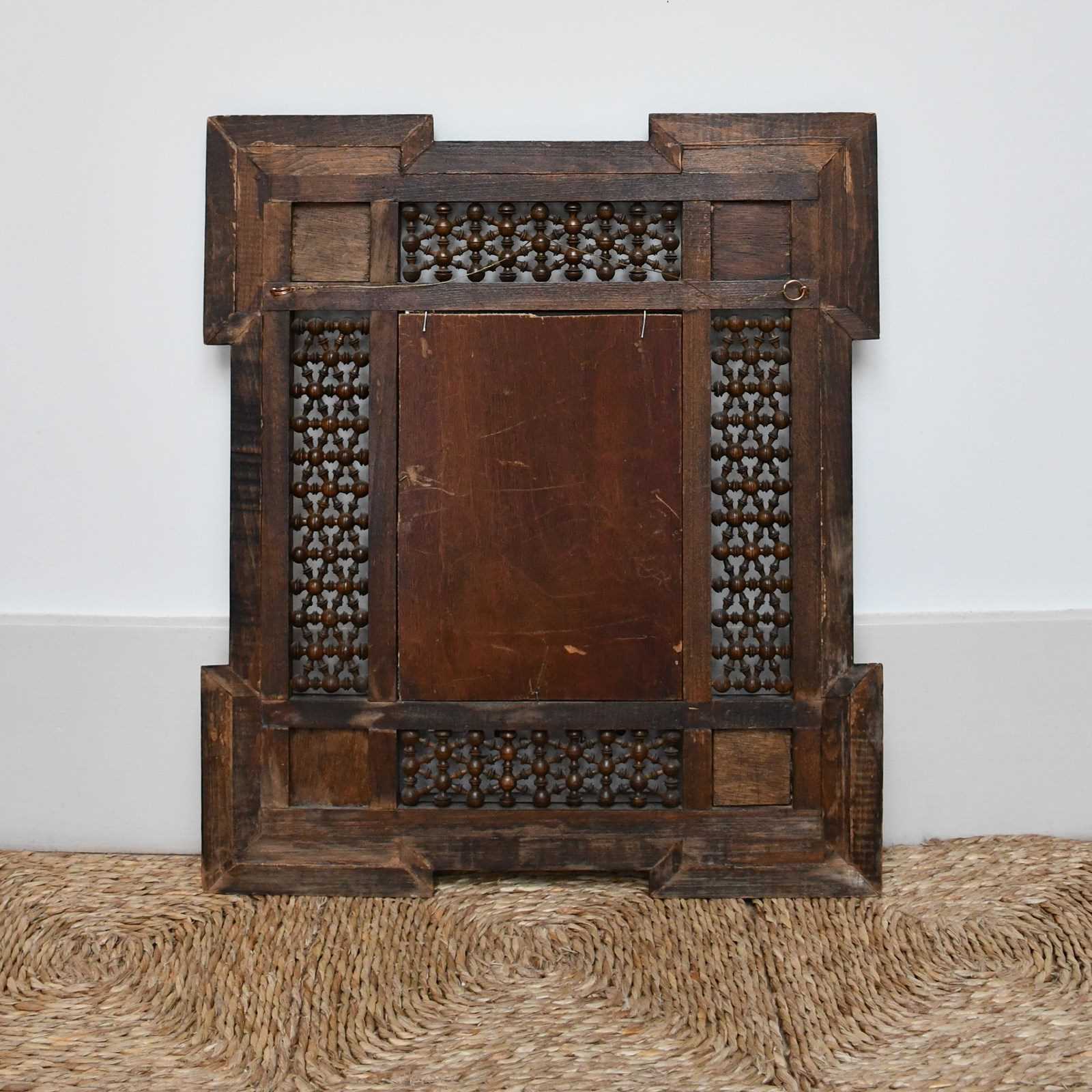 Displaying mashrabiya carved latticework panels with four decorative mother of pearl inlaid corner squares.
