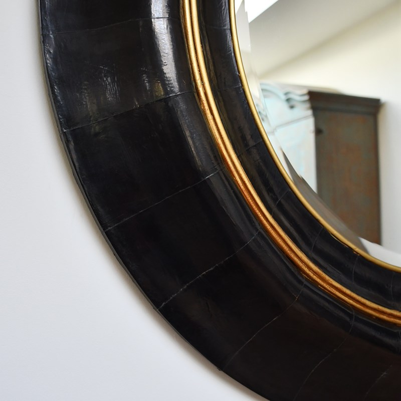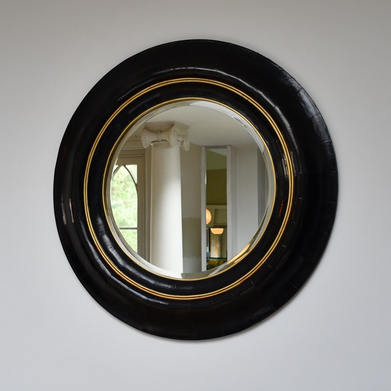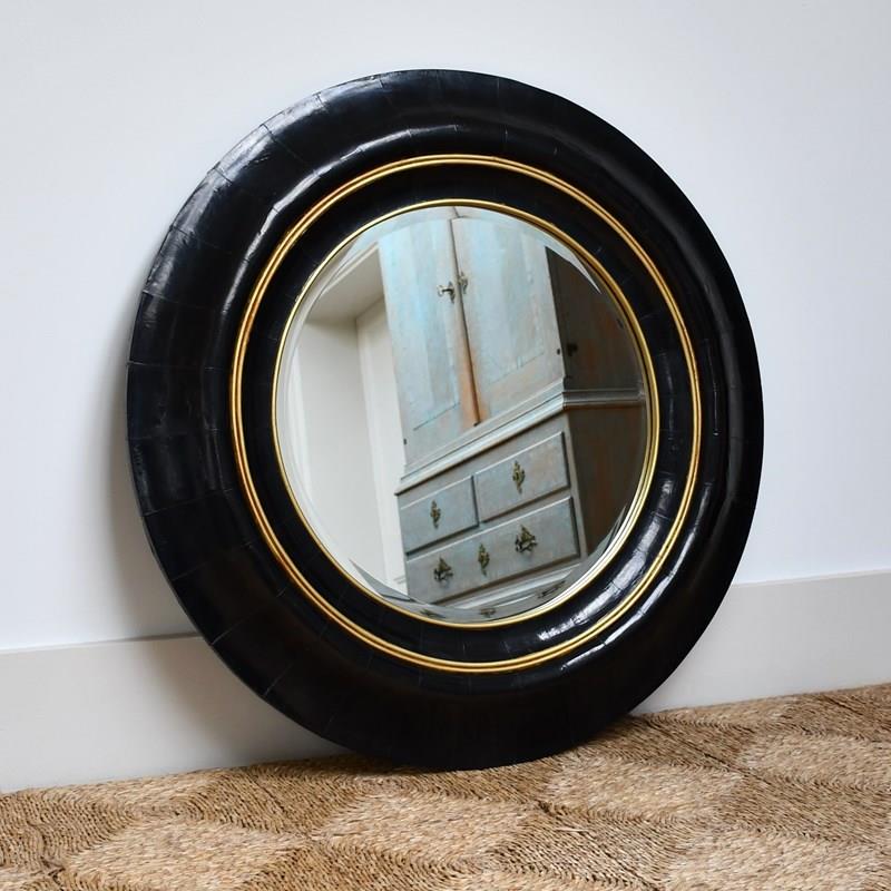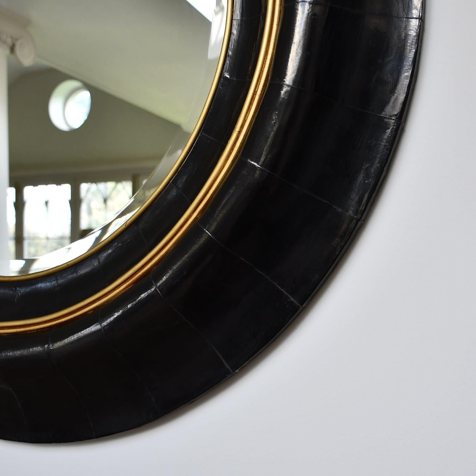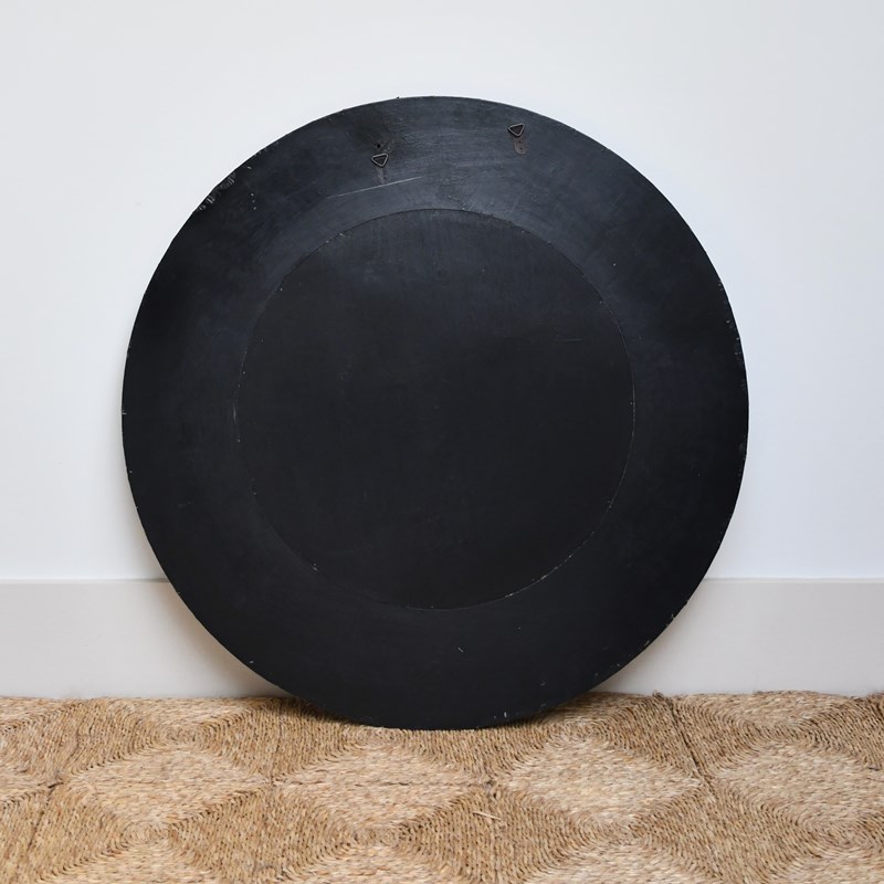 Large ebonised and gilt, circular formed bevelled wall mirror.