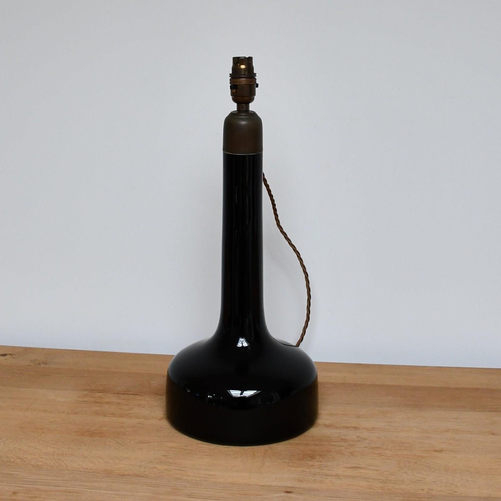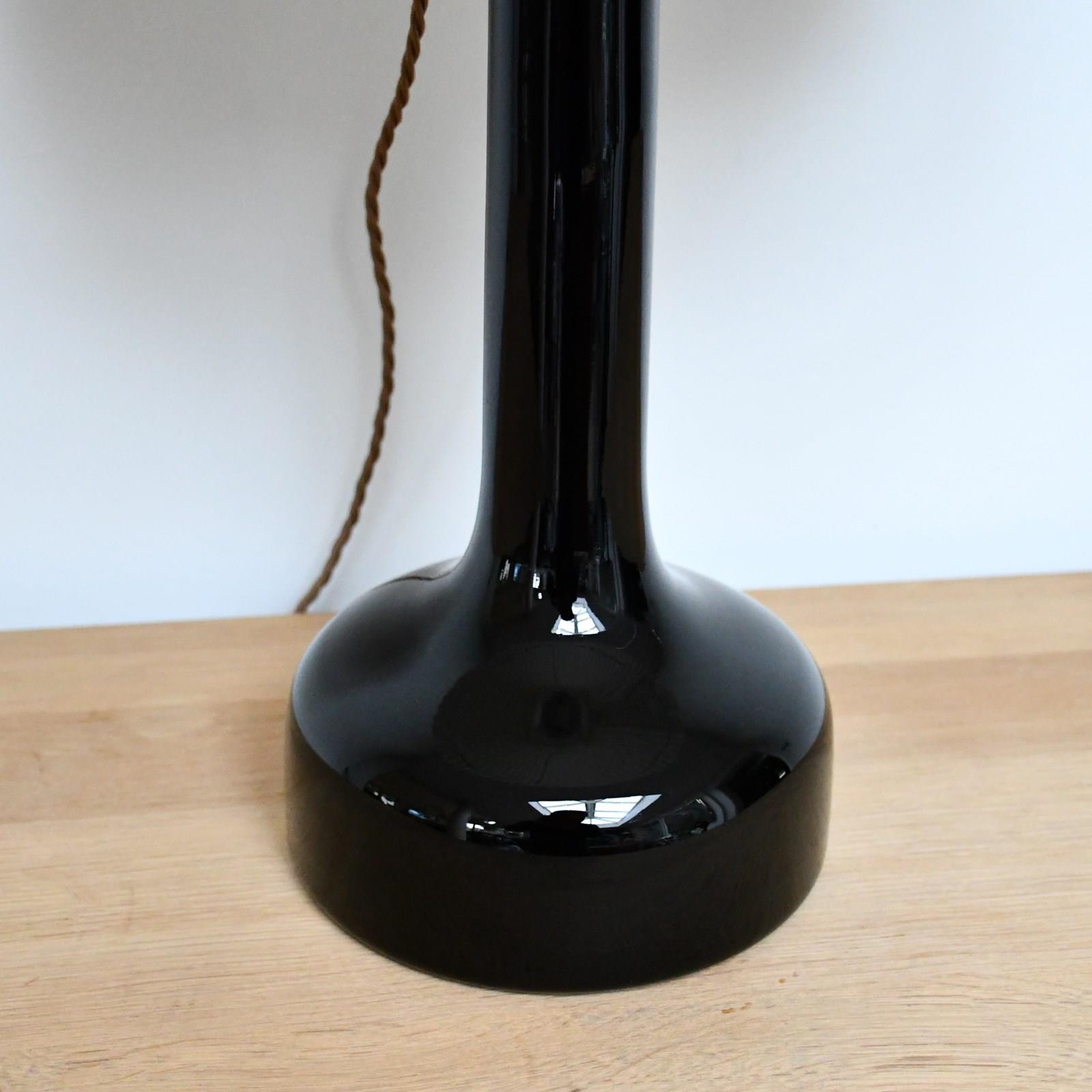 Elegant black glass table lamp with brass fittings, made by Holmegaard for Le Klint, in the 1950-60s.