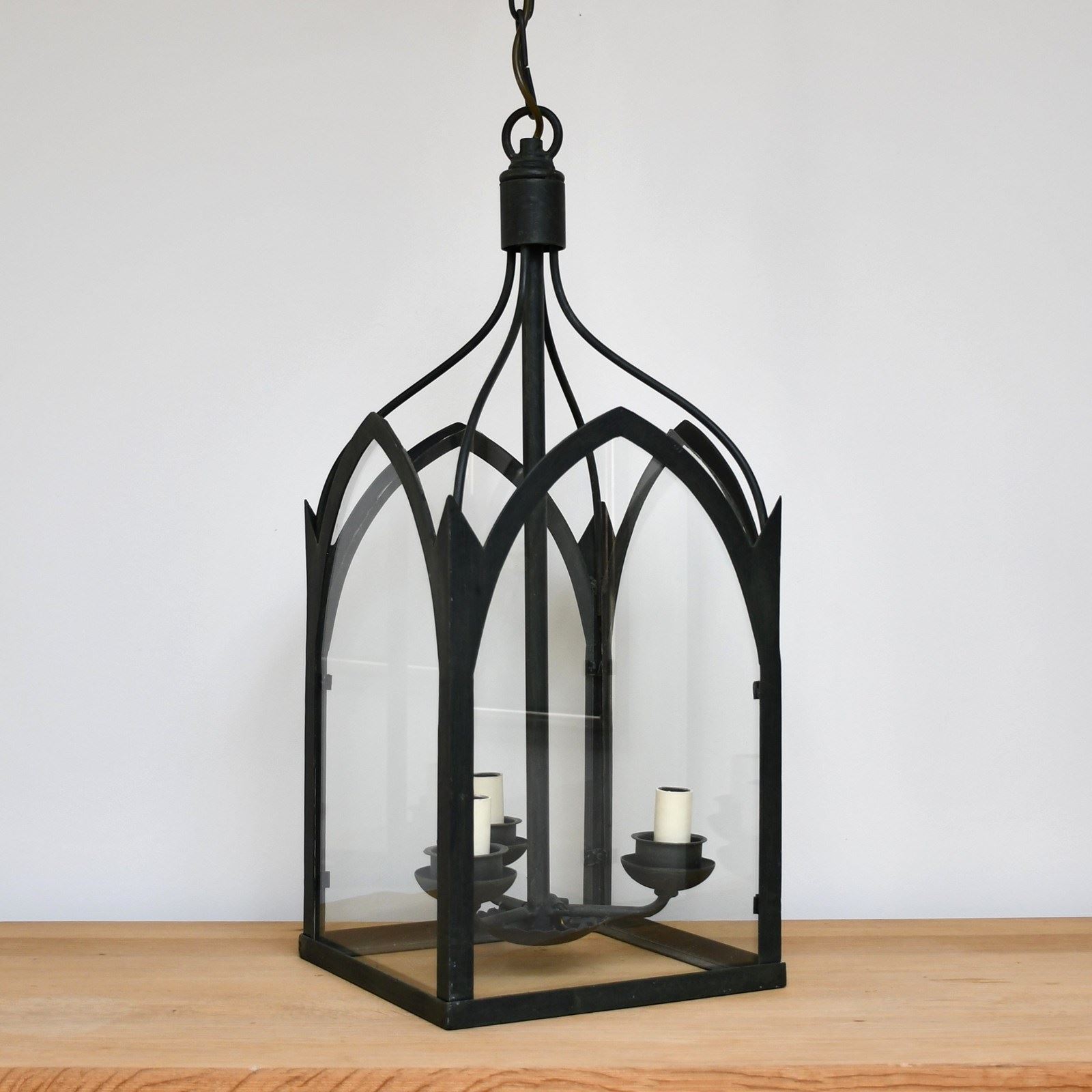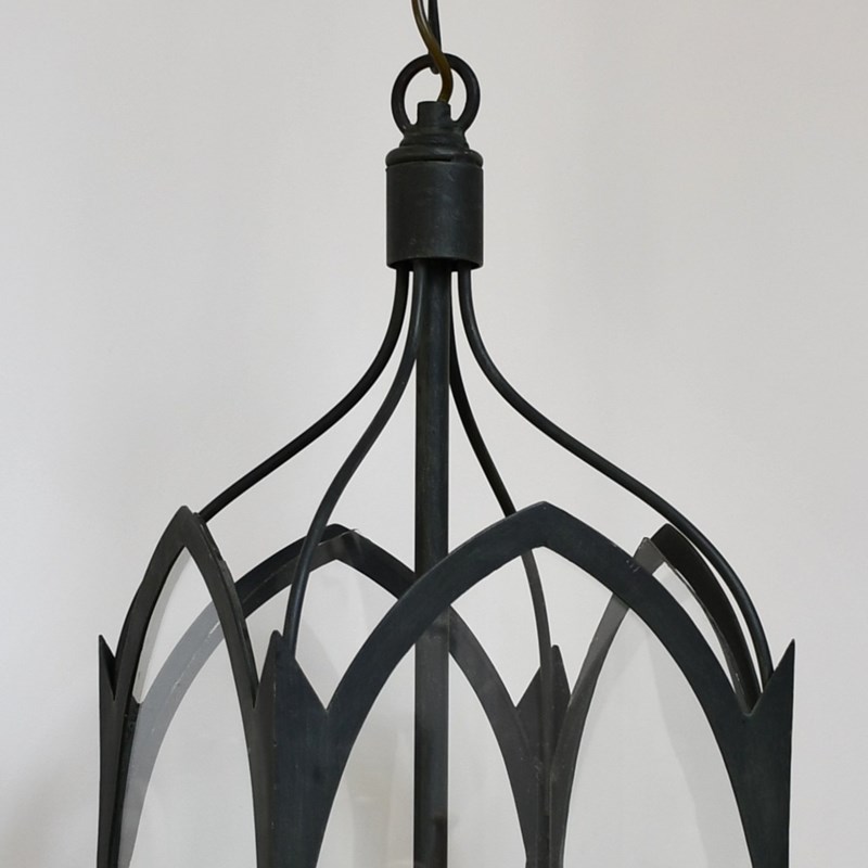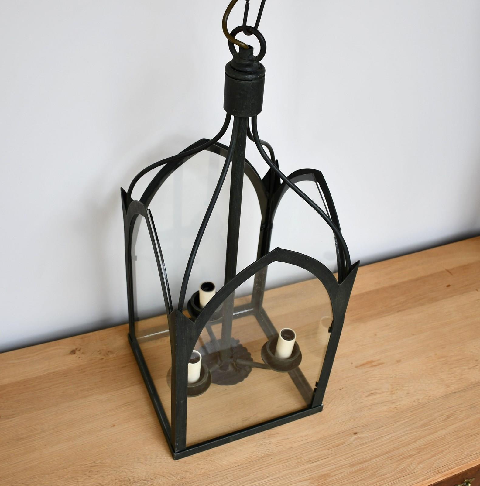 Featuring a decorative metal frame, painted dark green with arch shaped glass panes, internally a central three arm light fitting.