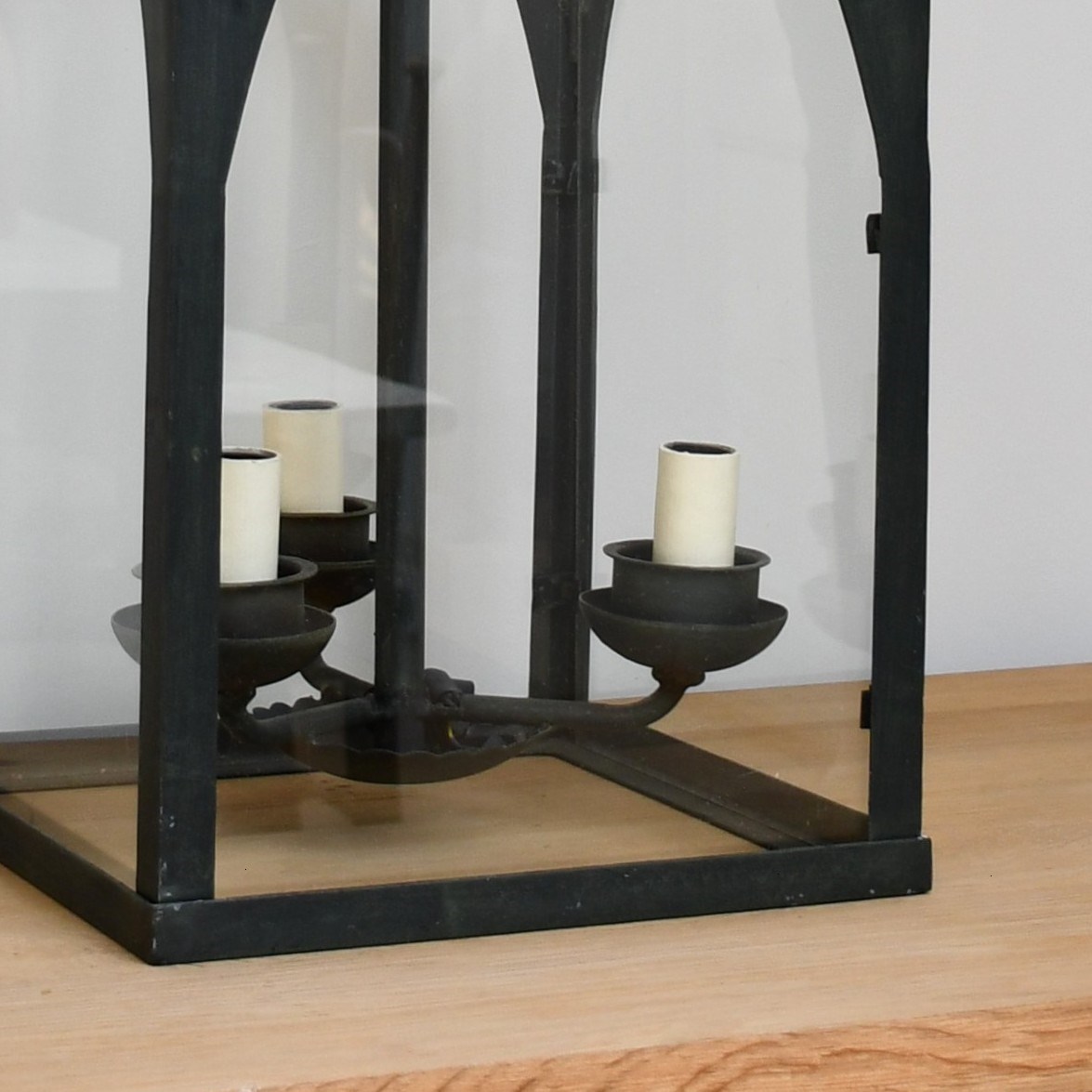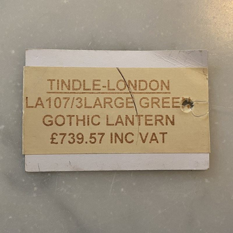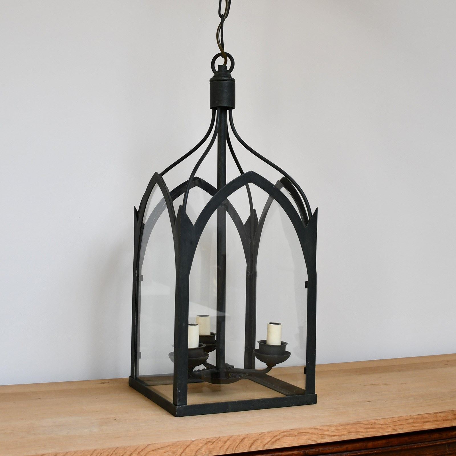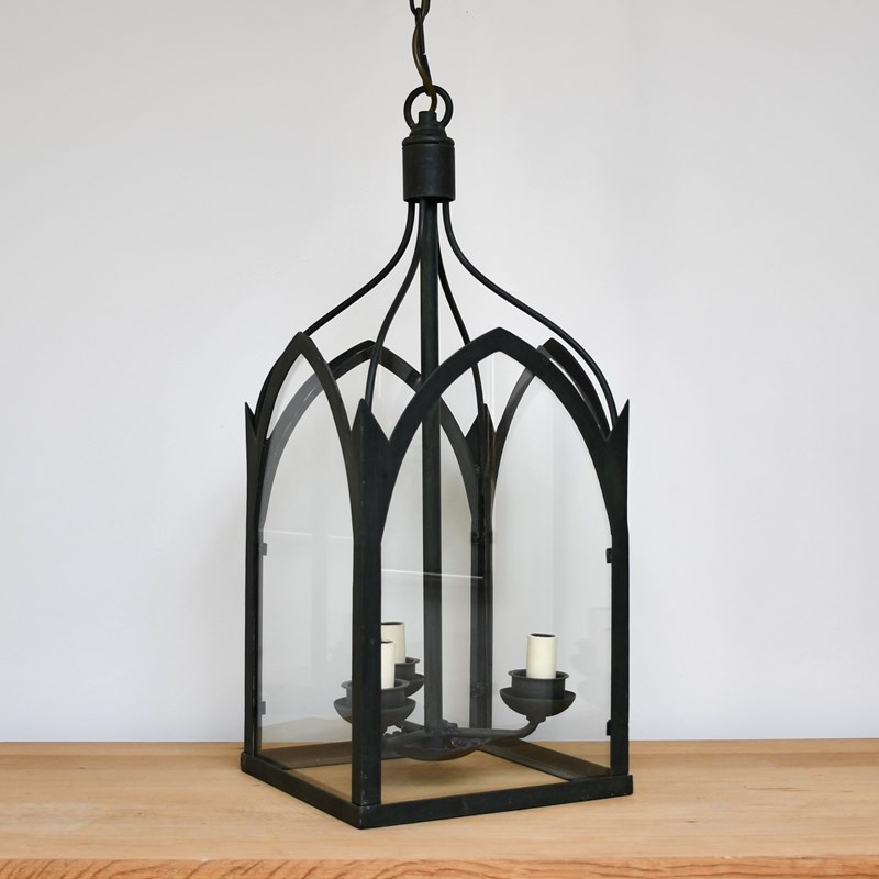 Featuring a decorative metal frame, painted dark green with arch shaped glass panes, internally a central three arm light fitting.