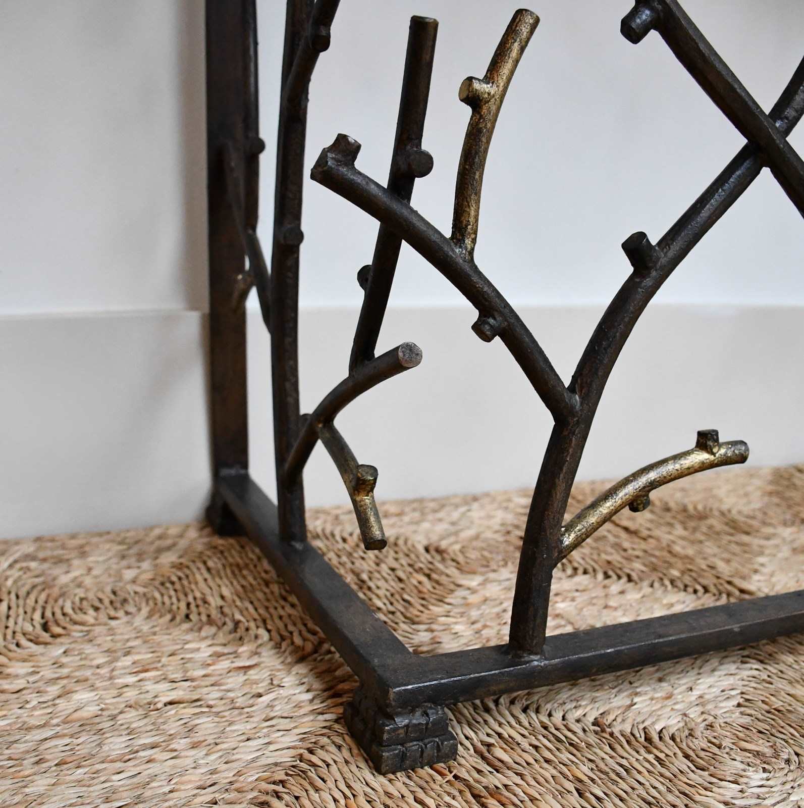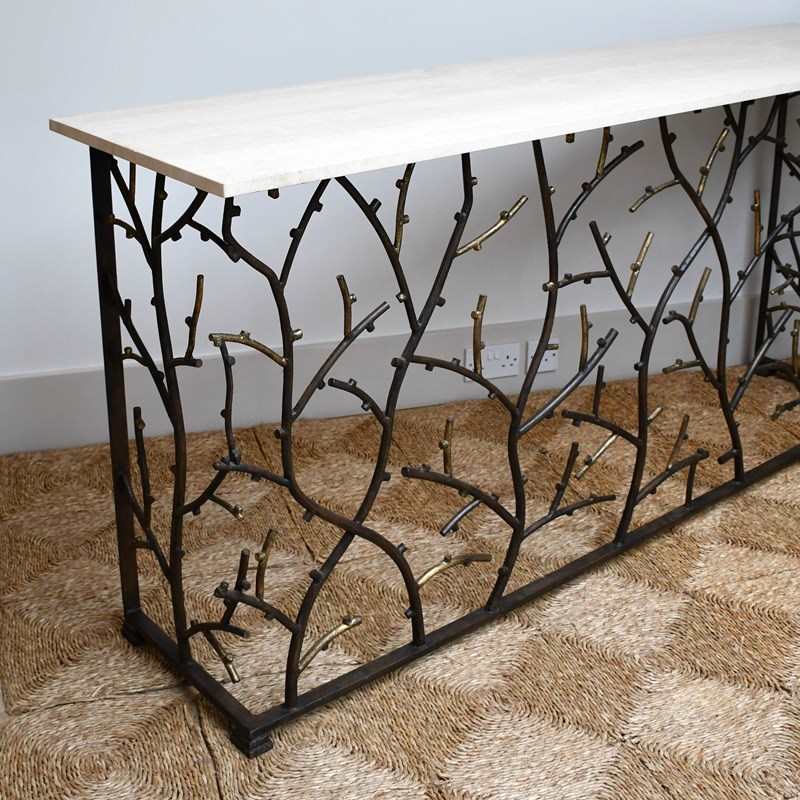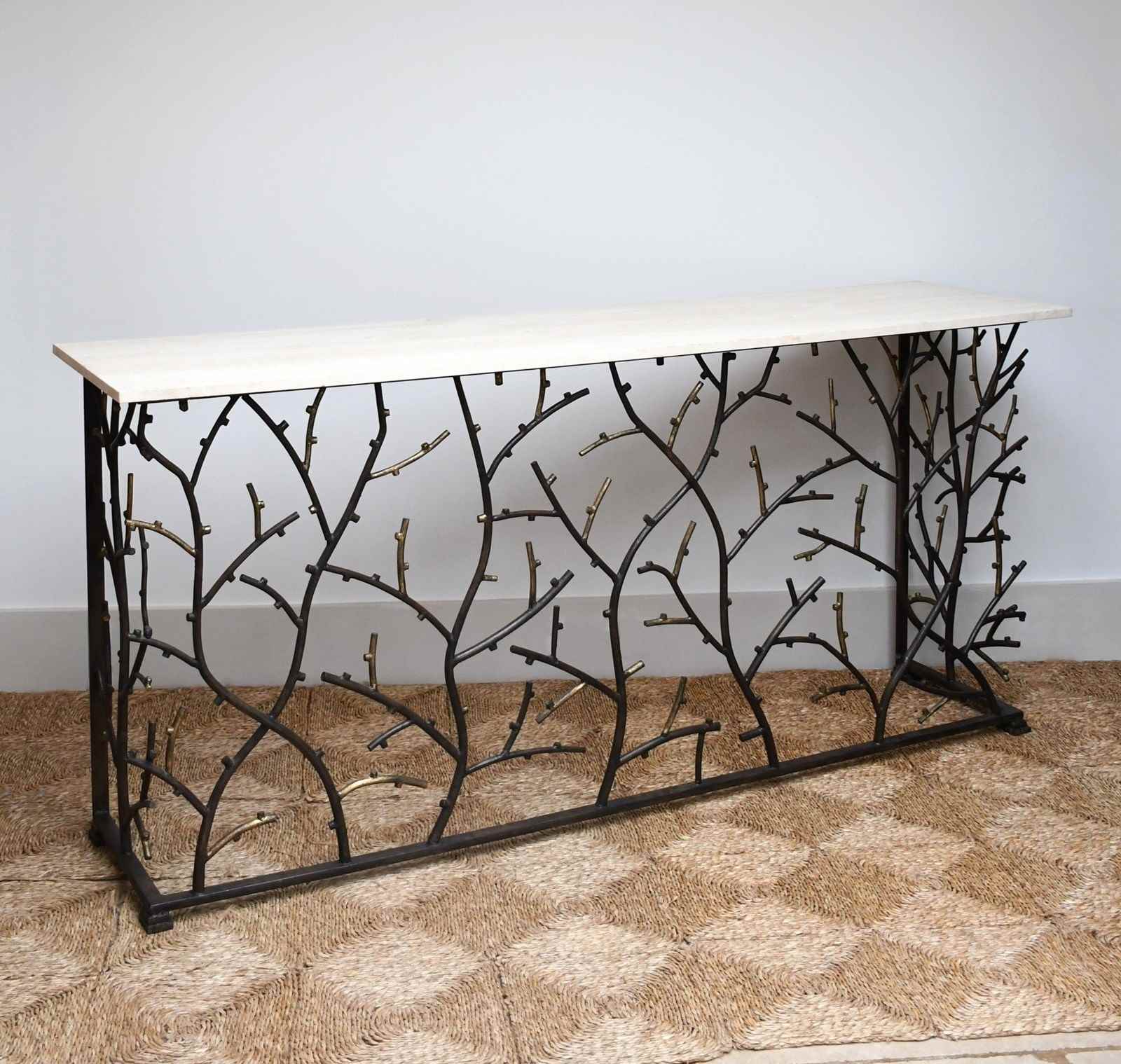 Wrought Iron console table of naturalistic form, displaying a bronze painted finish with decorative gilt-gold highlights, surmounted by a marble top.