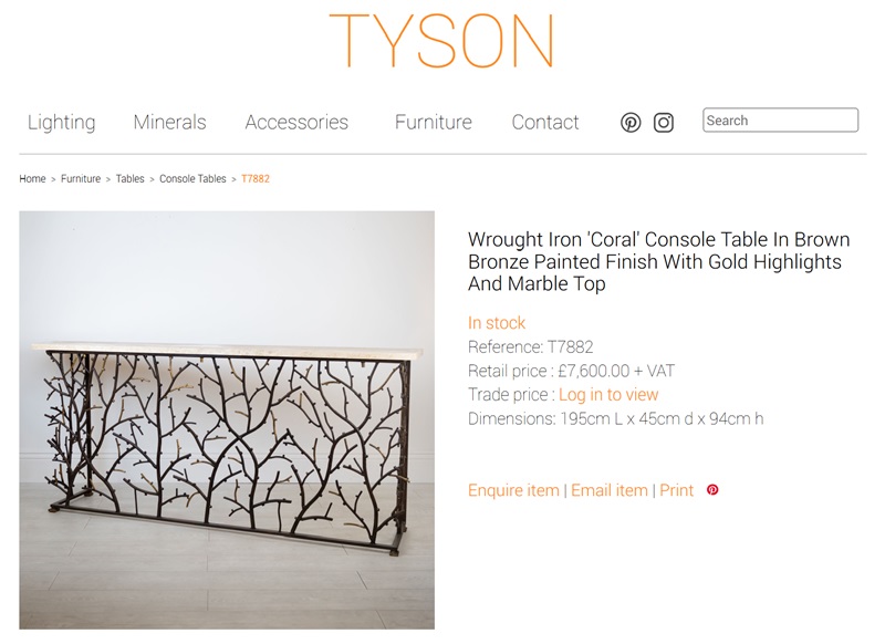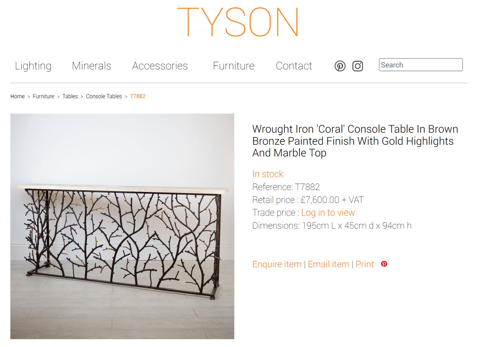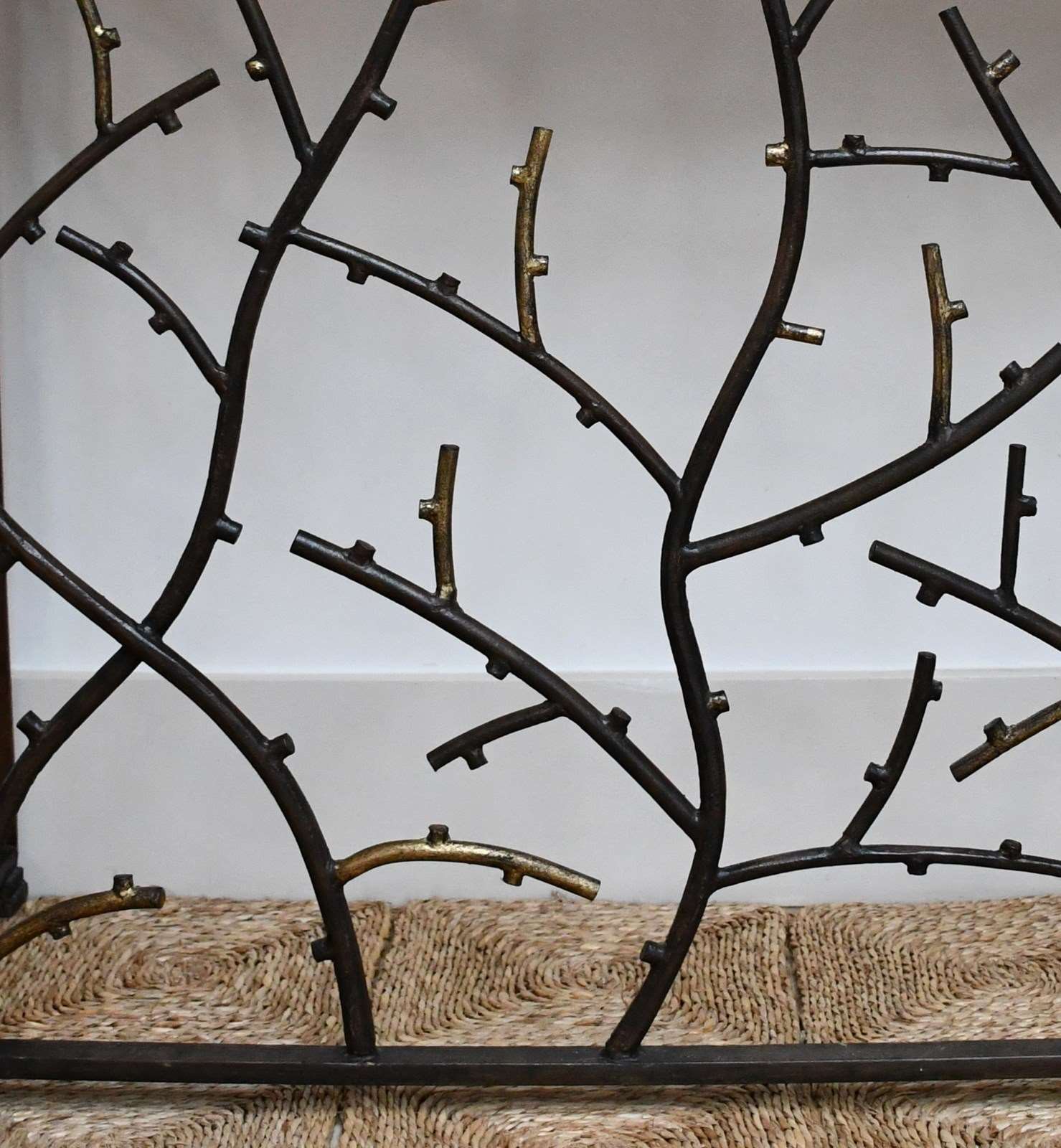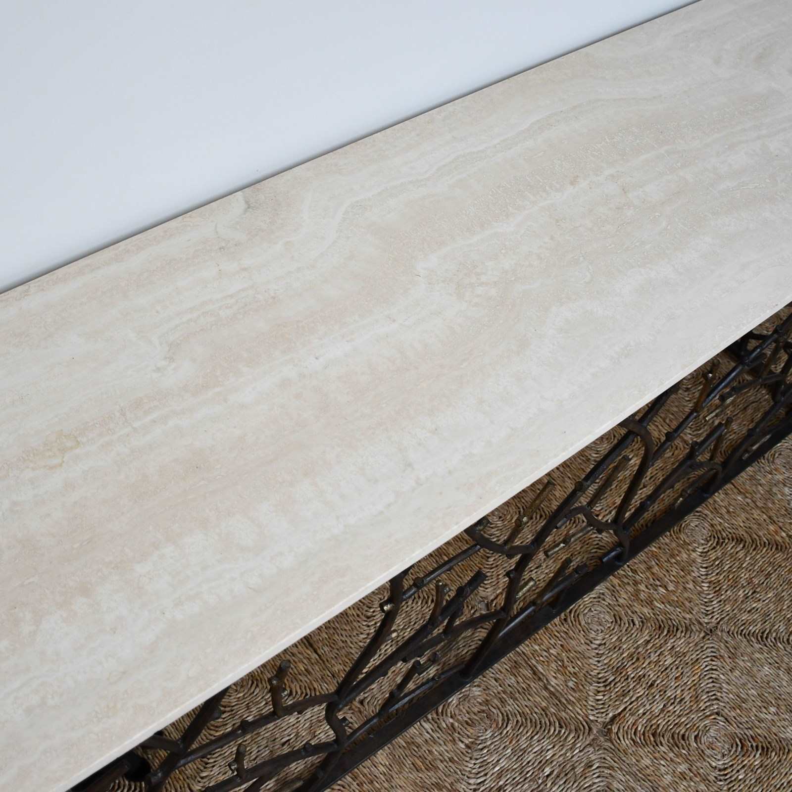 Wrought Iron console table of naturalistic form, displaying a bronze painted finish with decorative gilt-gold highlights, surmounted by a marble top.